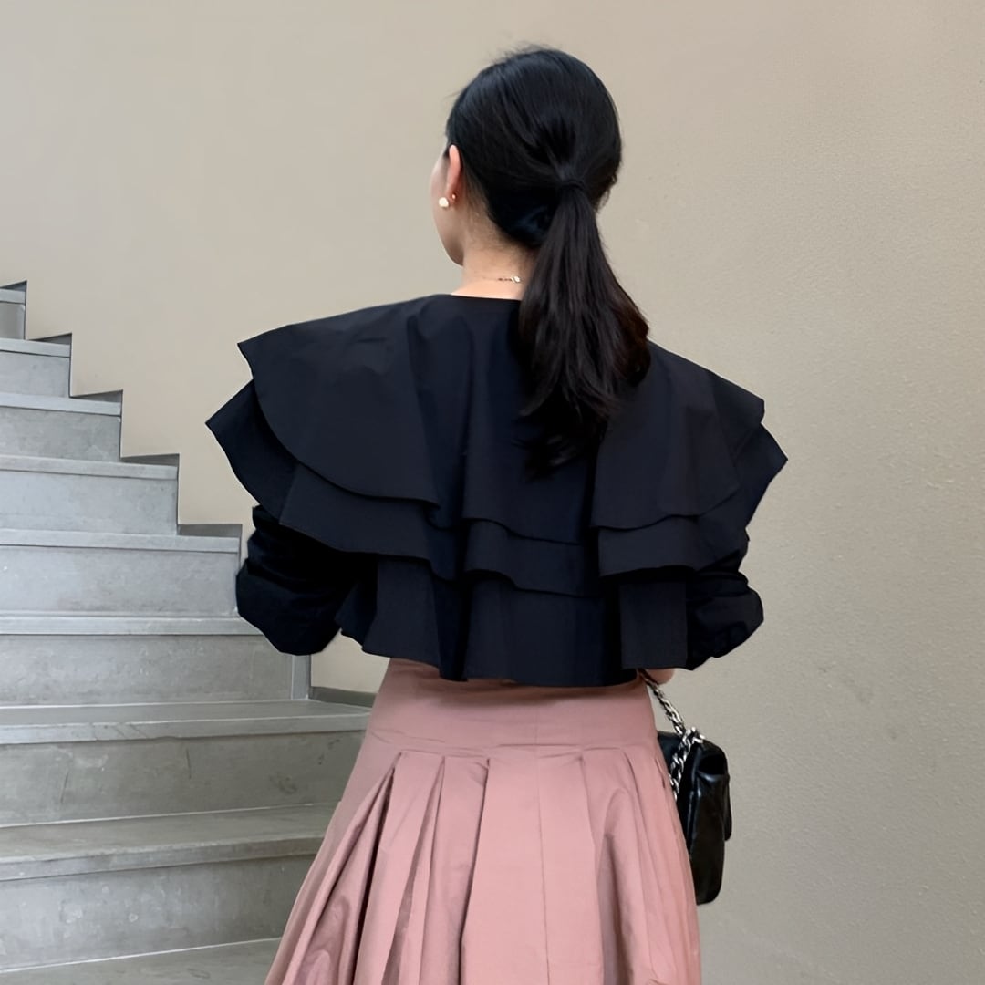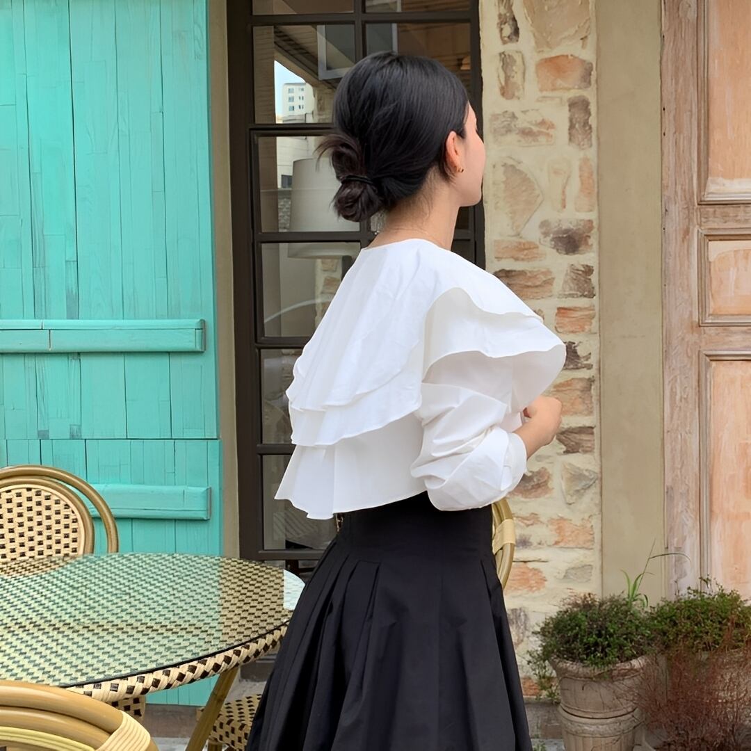 大胆にあしらわれたダブルフリルが顔まわりを華やかに演出し、女性らしい上品なシルエットを叶えます。