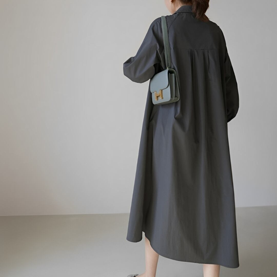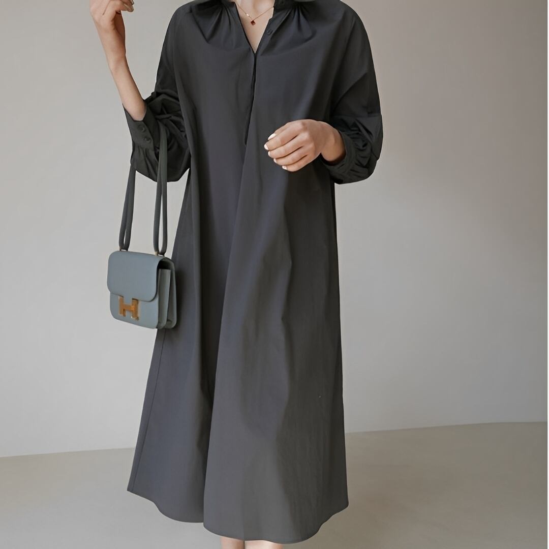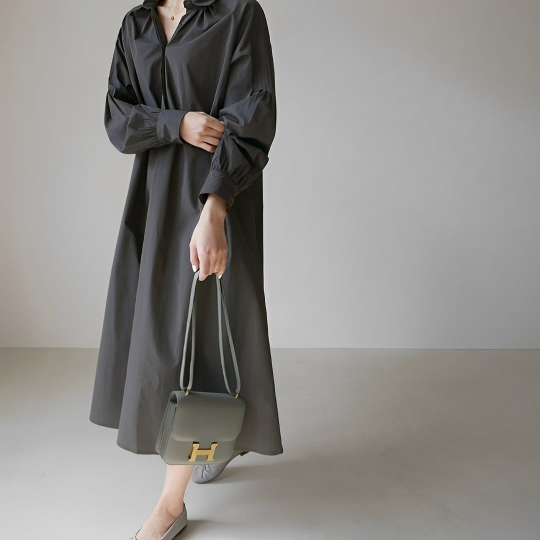 たっぷりとしたAラインシルエットが体のラインを優しく包み、スタイルアップも叶えてくれます。