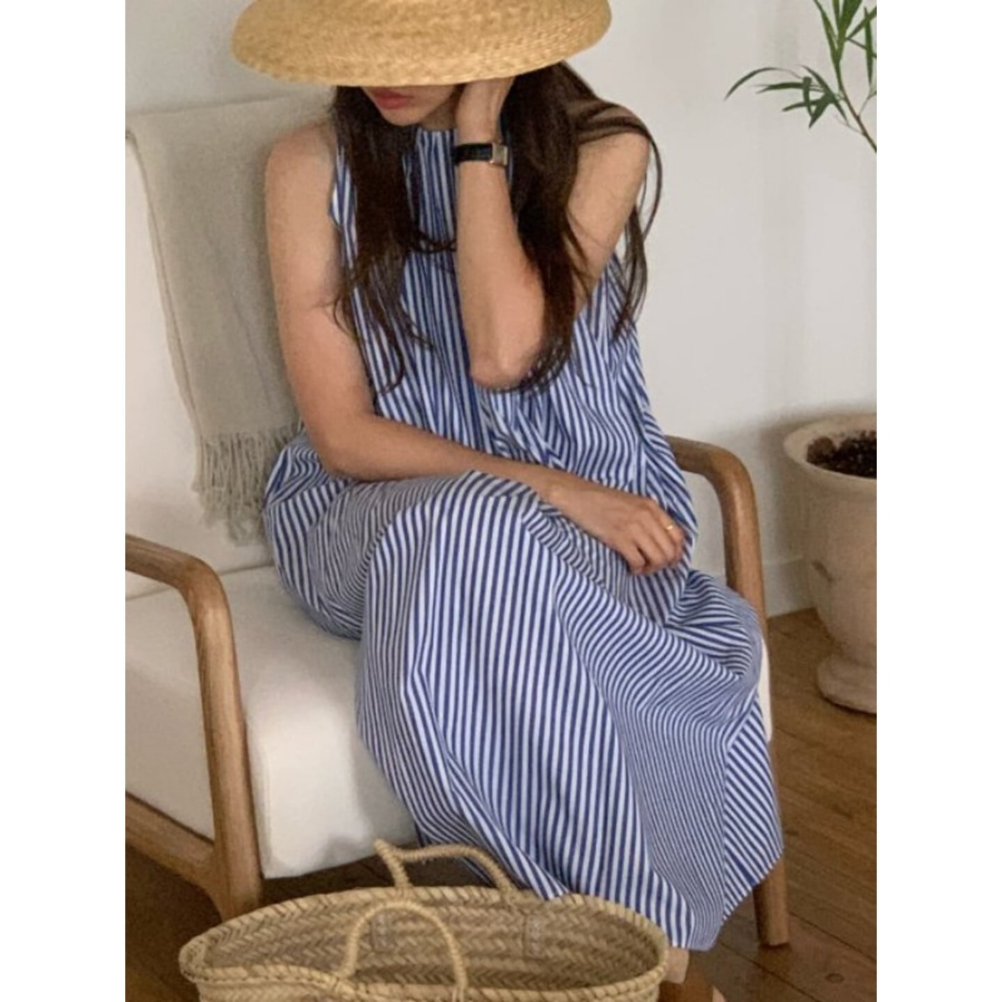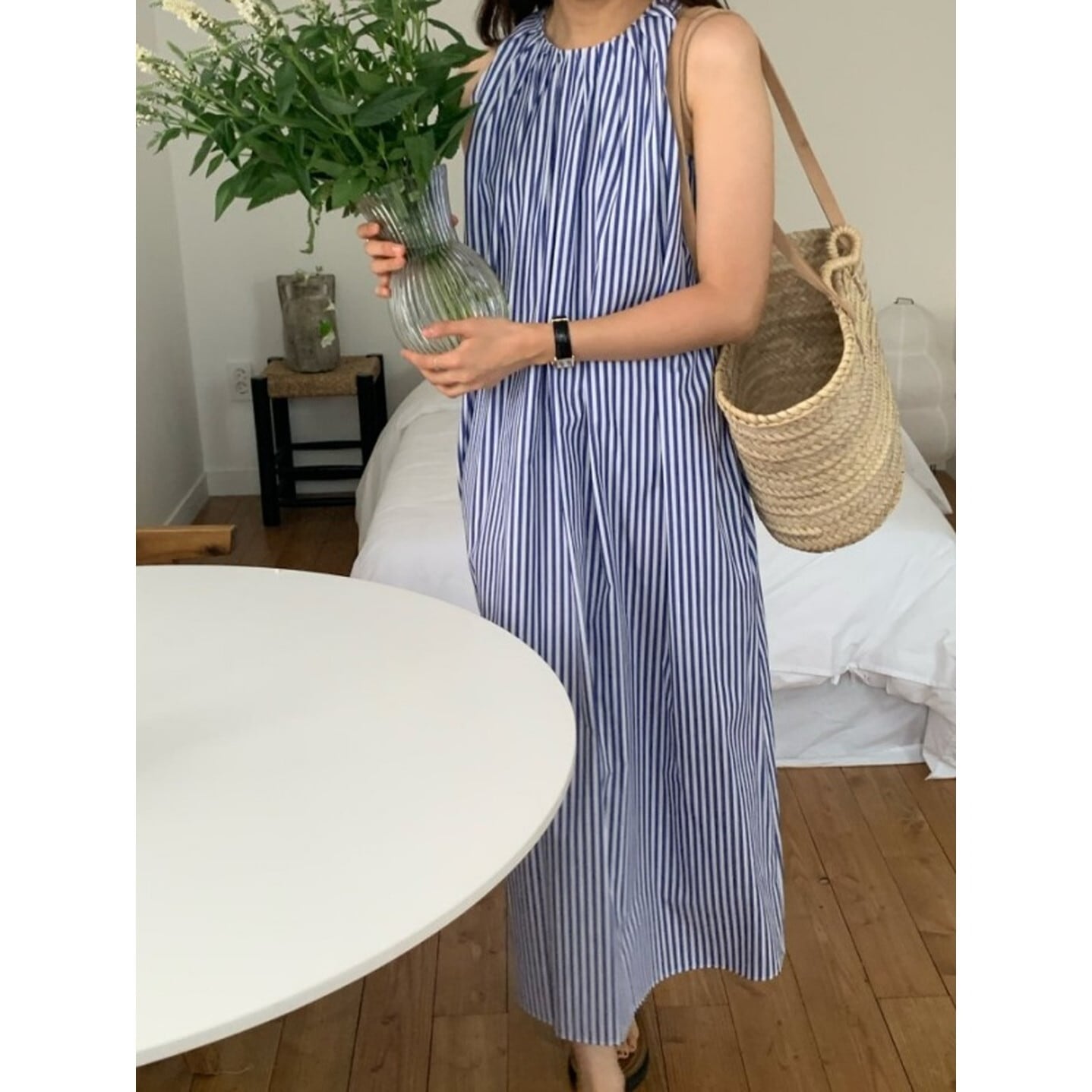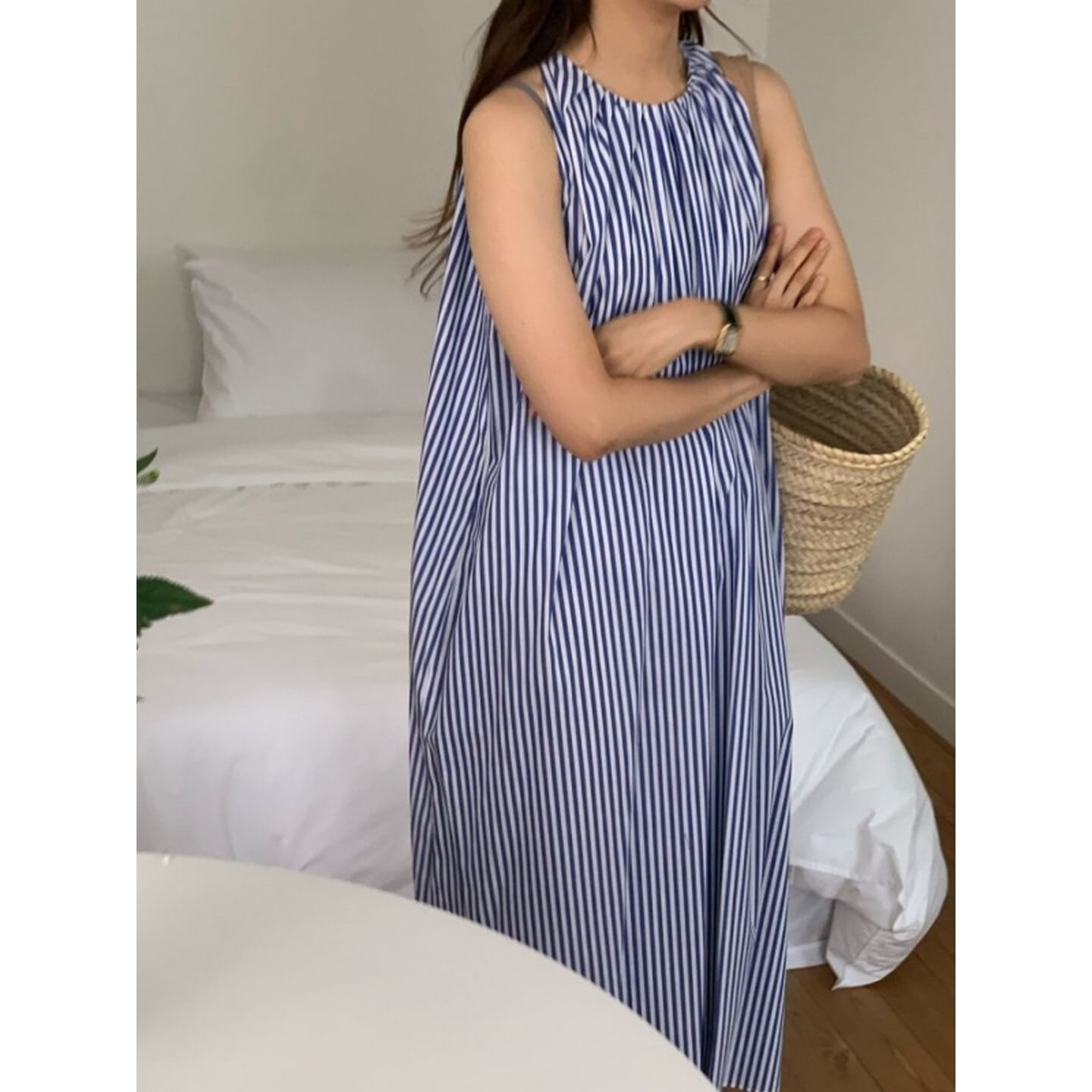 ノースリーブストライプギャザーワンピース M01958