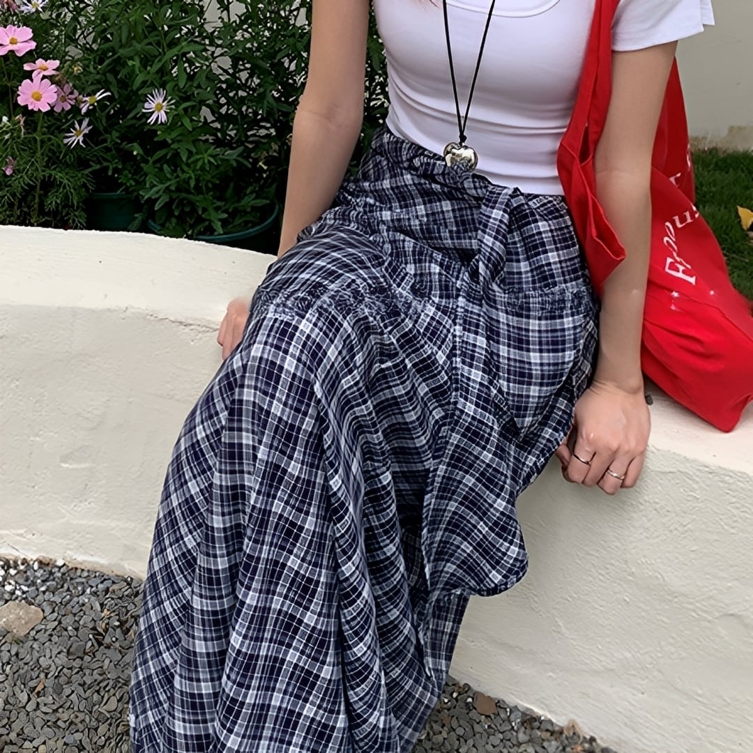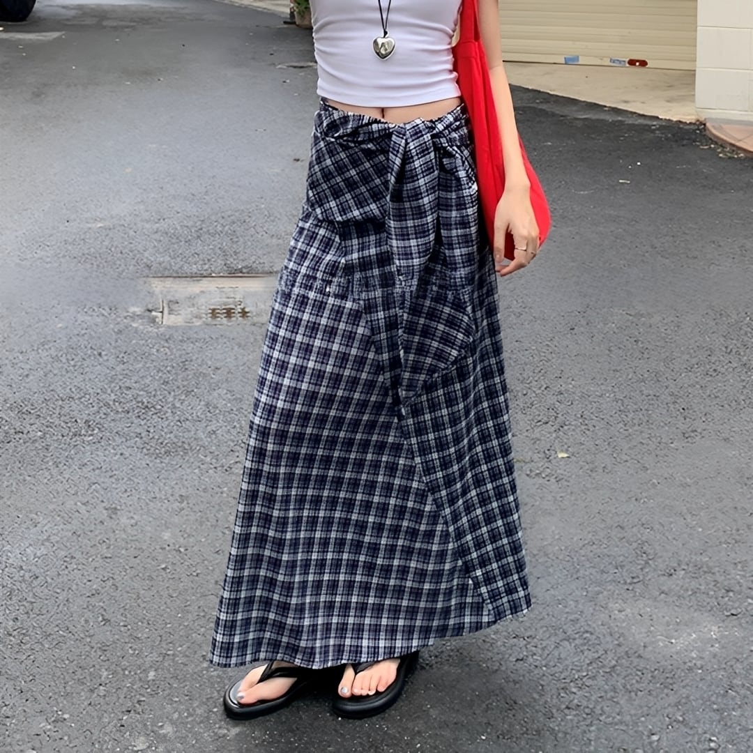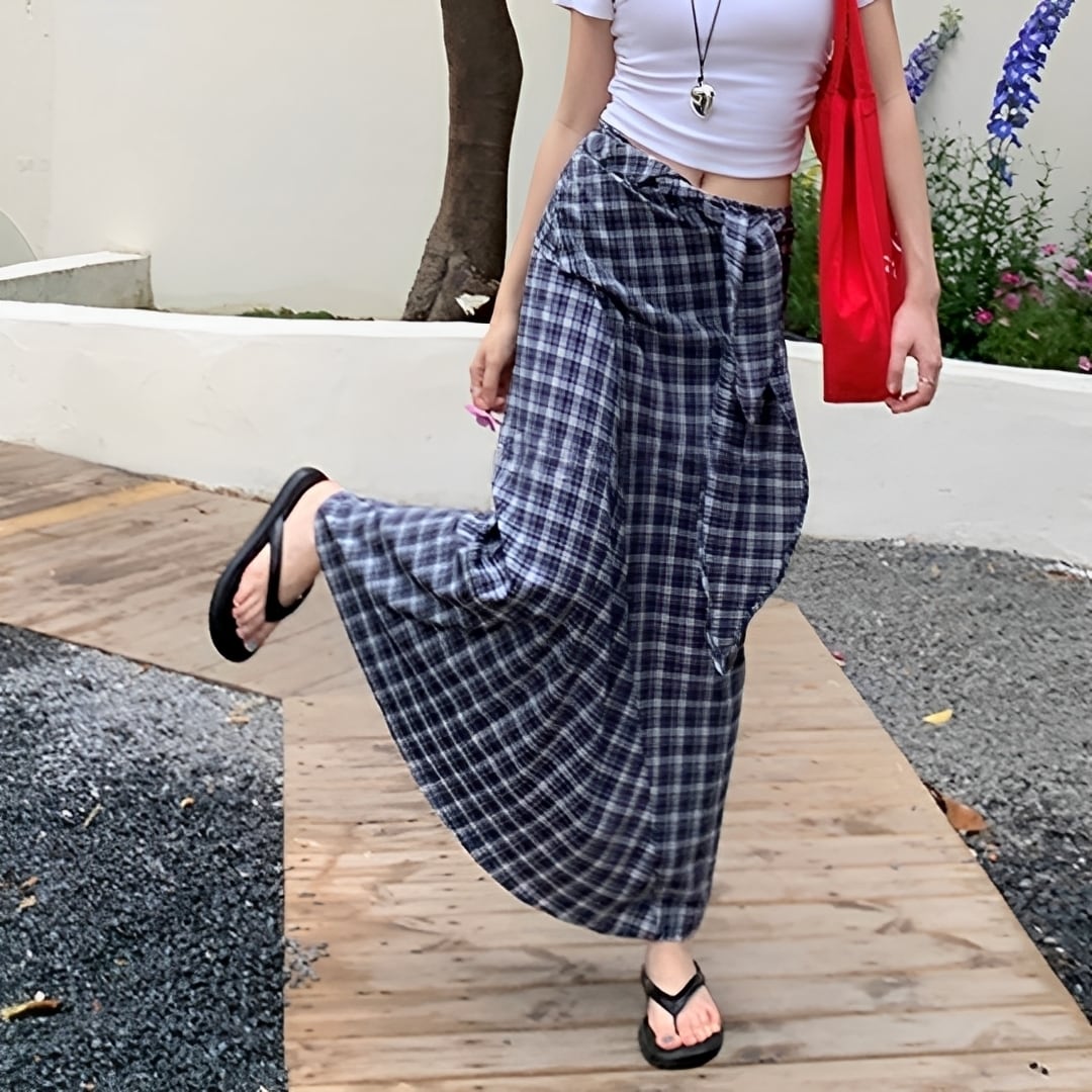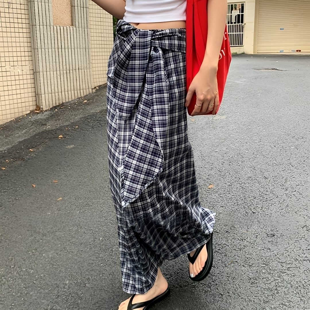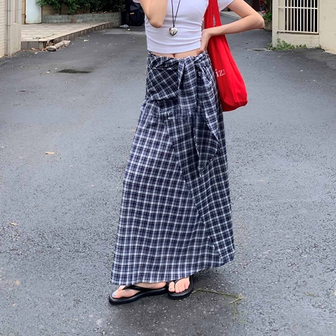 チェックシャツを腰巻きしたようなユニークなデザインが目を惹く、レイヤード風ロングスカート。