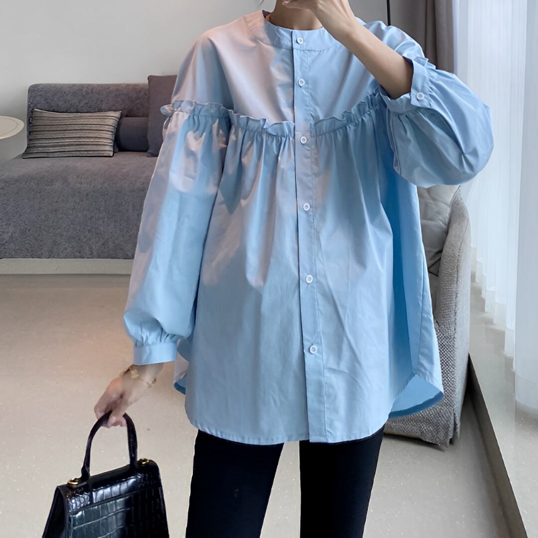 ヨークのギャザーとフリルがほどよい甘さを添える、大人の華やぎシャツ。