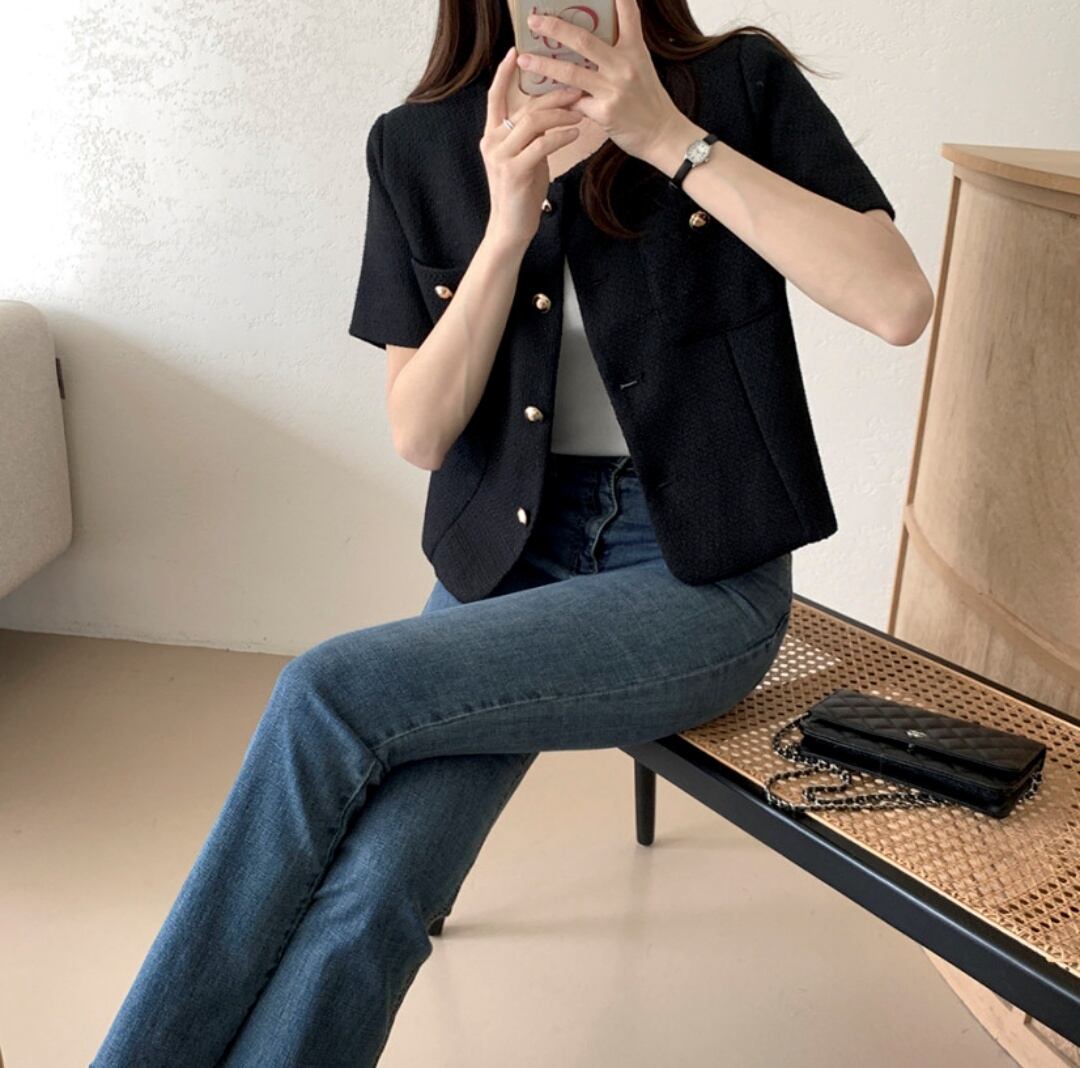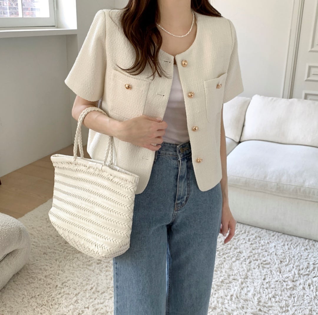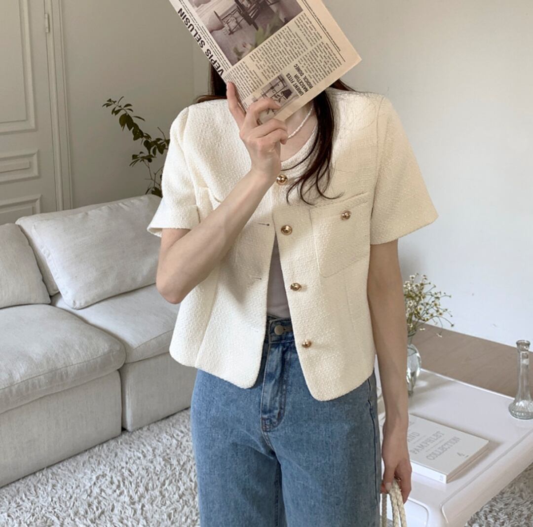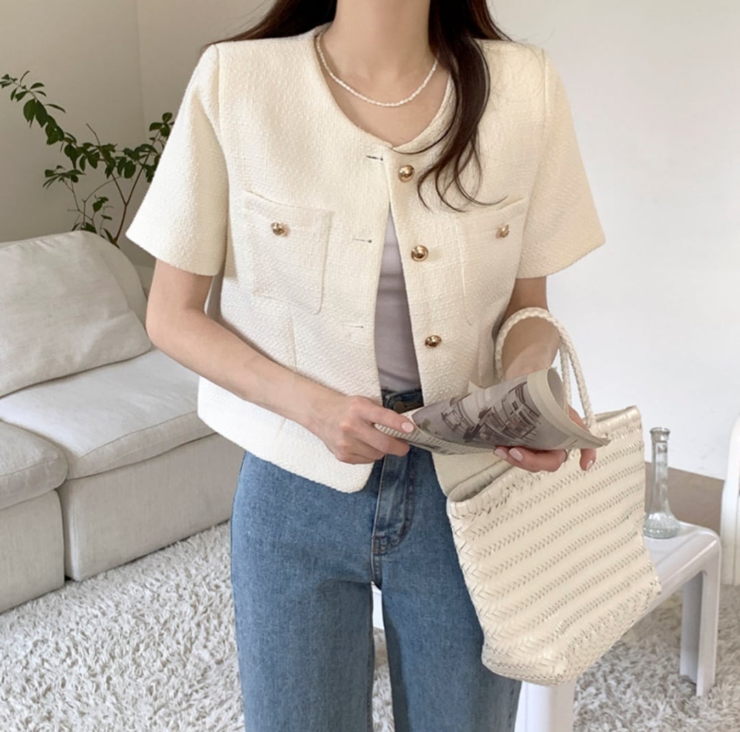 上質感漂うツイード素材に、ゴールドボタンが映えるショートジャケット。