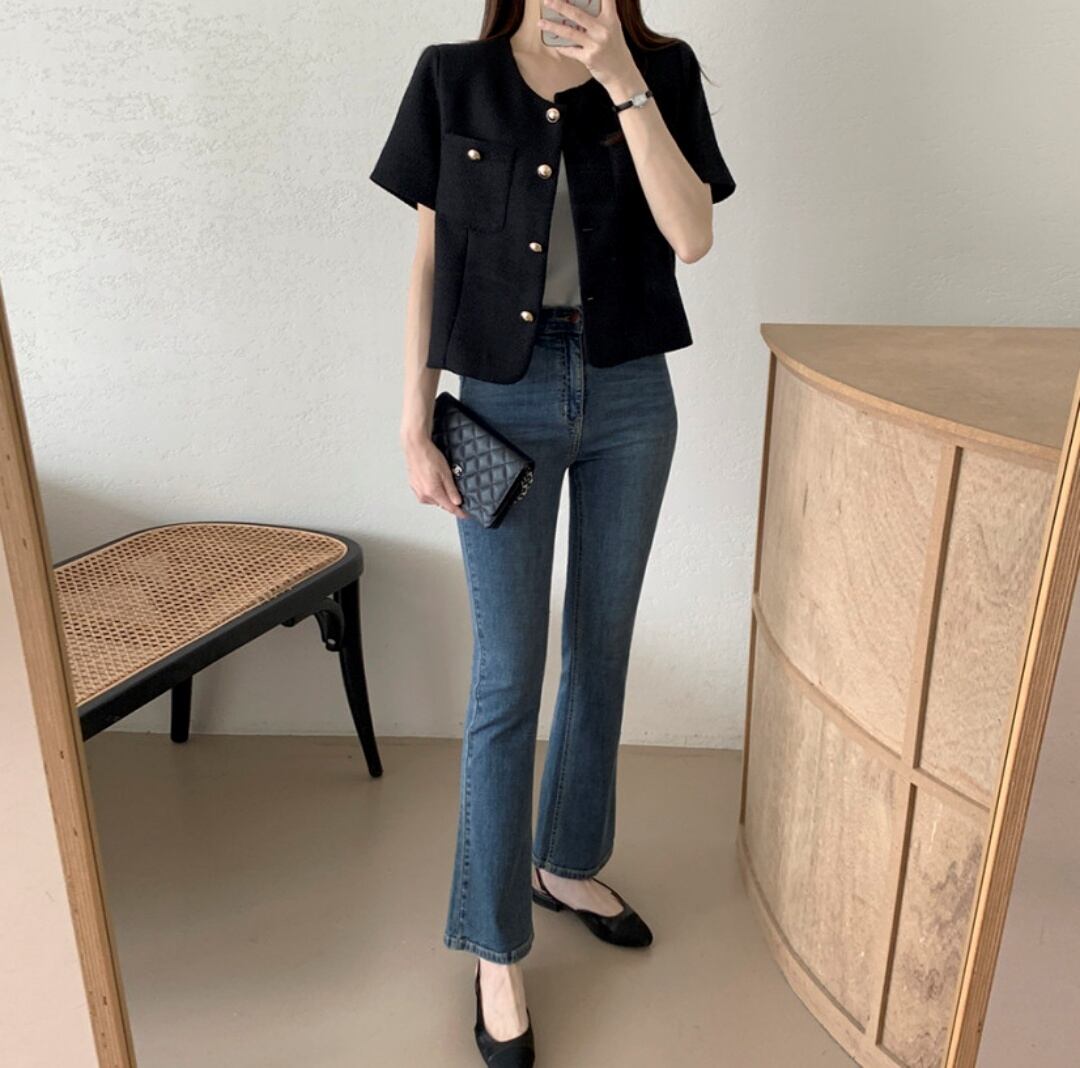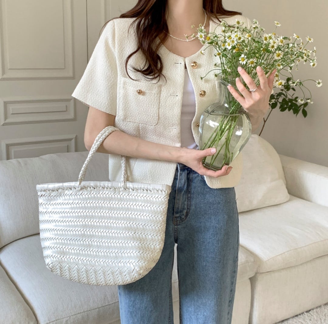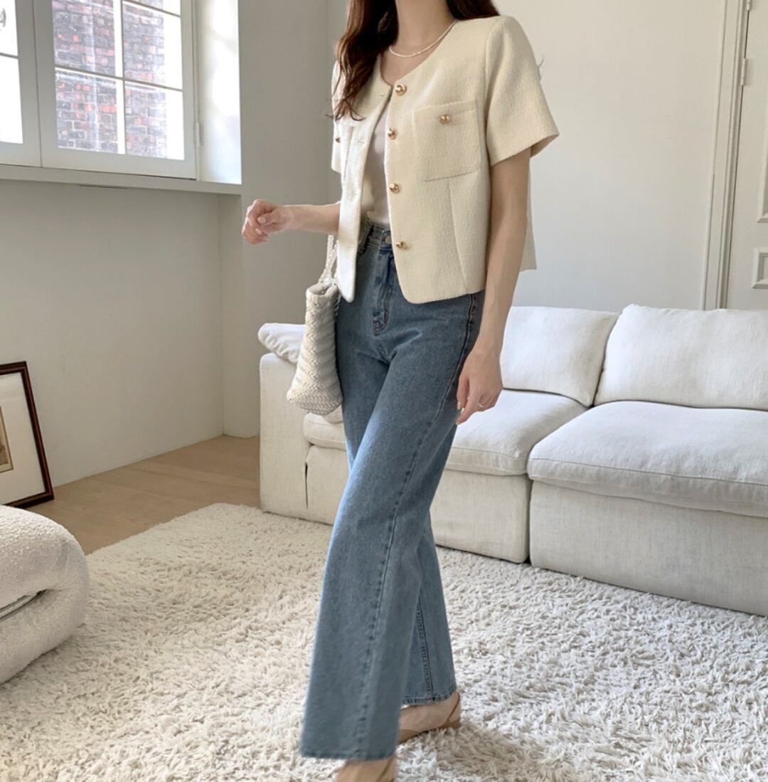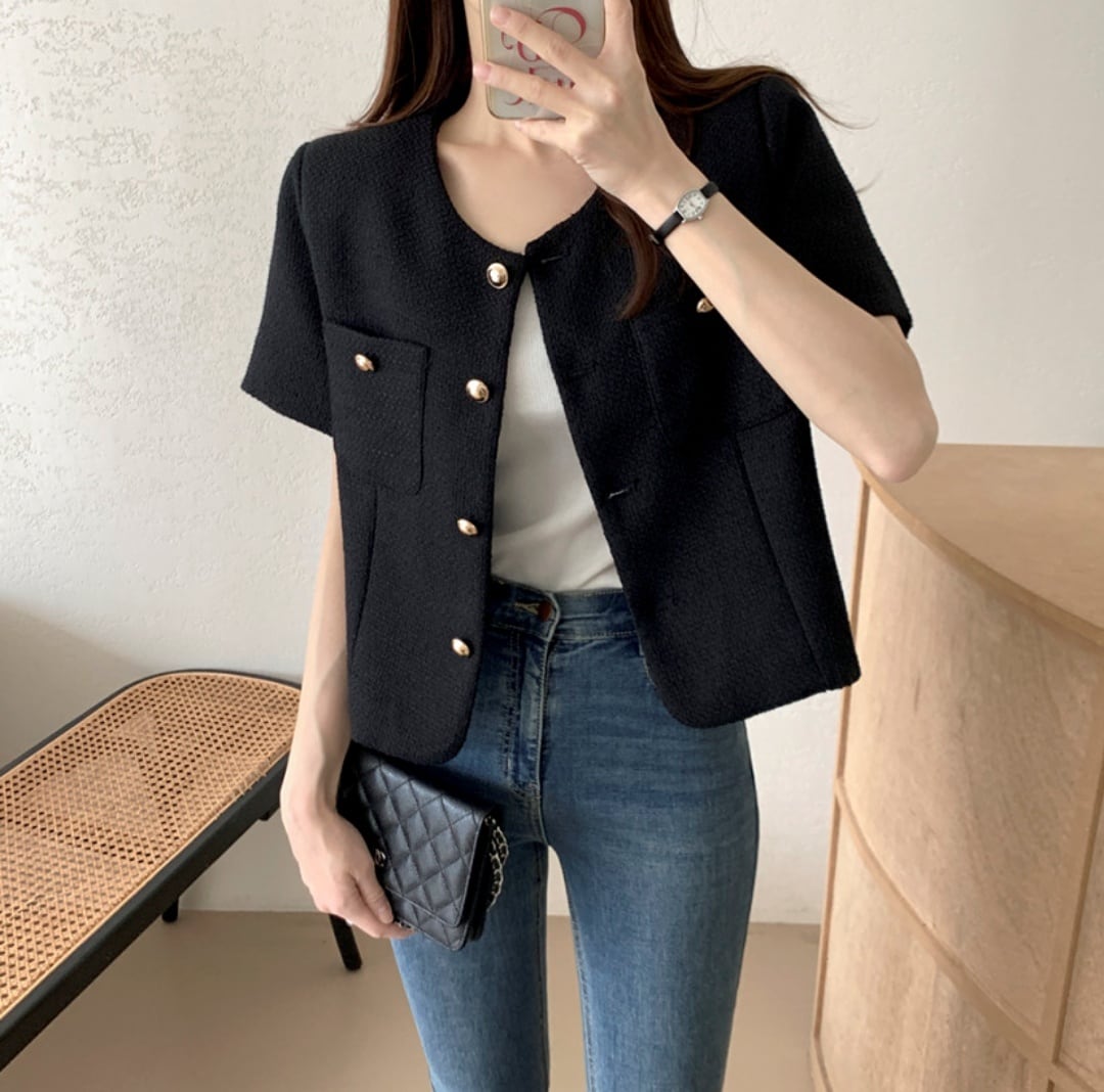 上質感漂うツイード素材に、ゴールドボタンが映えるショートジャケット。