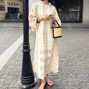 リネン風カットワーク刺繍ロングワンピース M02233