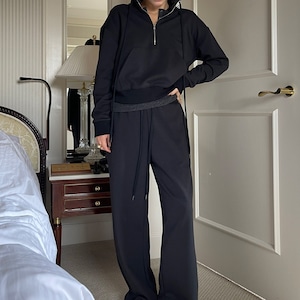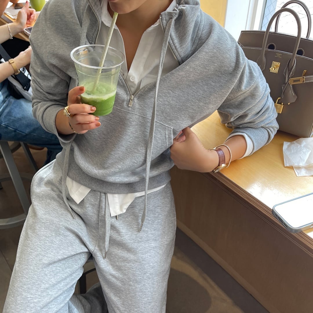 ハーフジップデザインがポイントのスウェットとジョガーパンツのセットアップ。