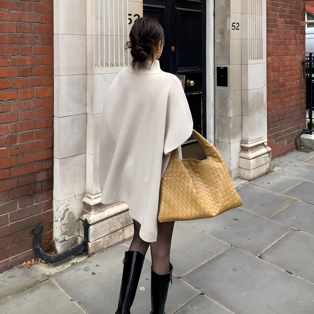 ケープのように広がるシルエットが印象的な、ハイネックニットトップス。