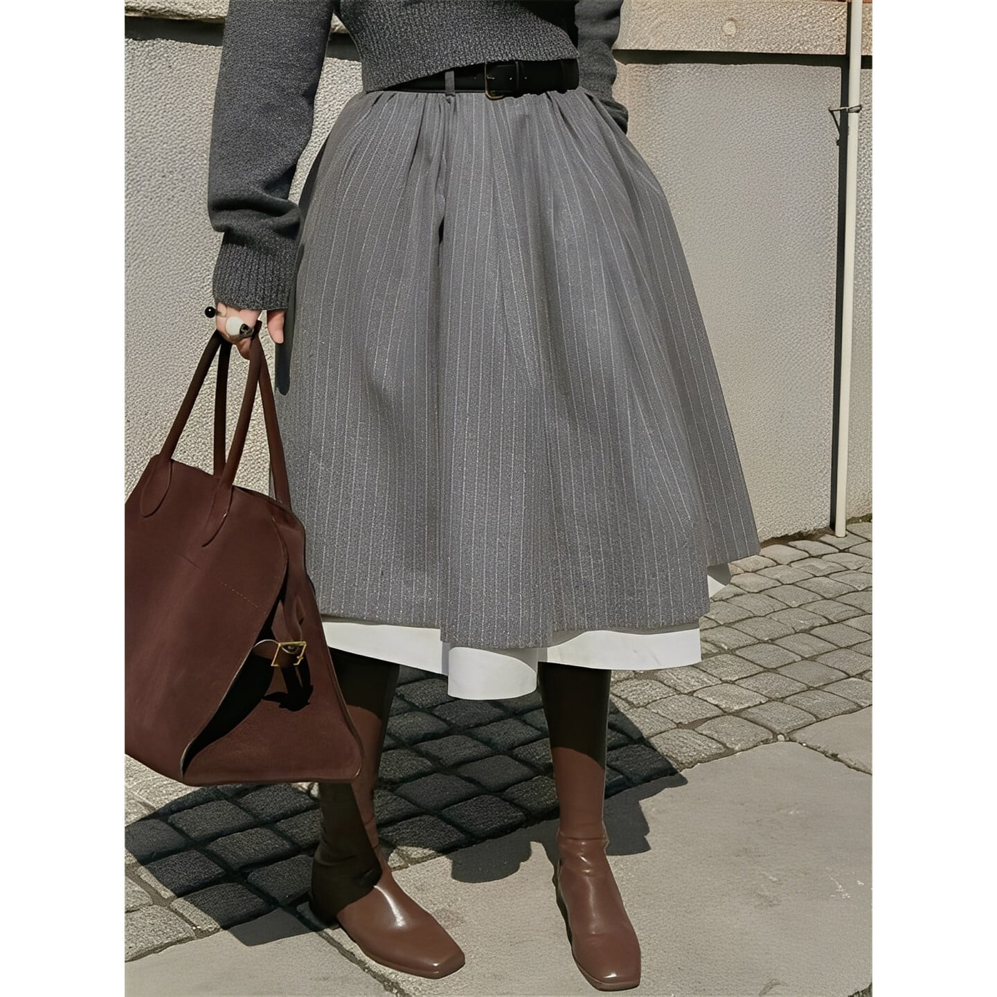 広がりすぎないシルエットで、上品さと大人の抜け感を両立します。
