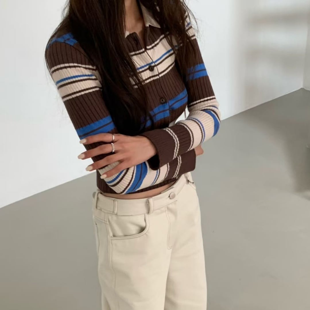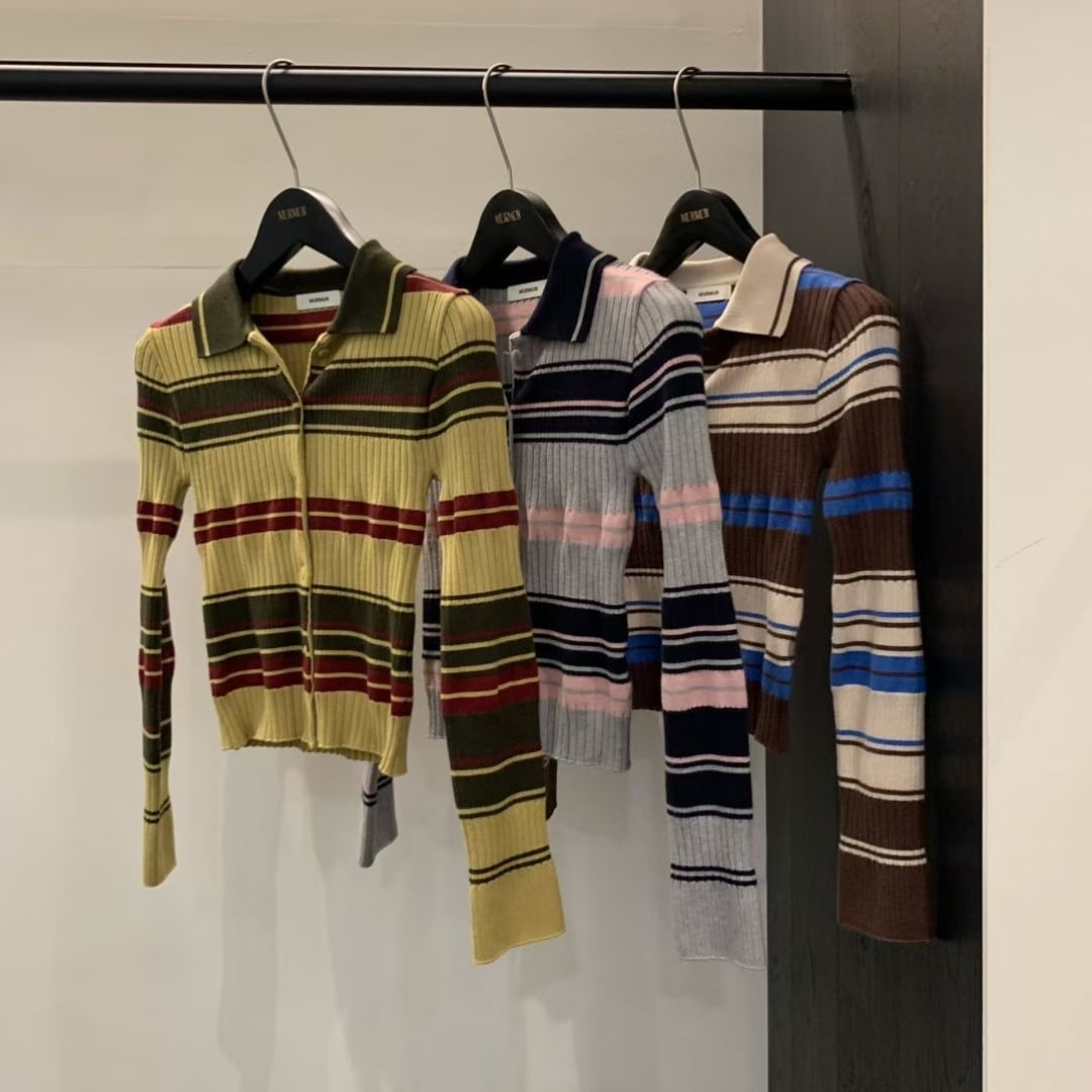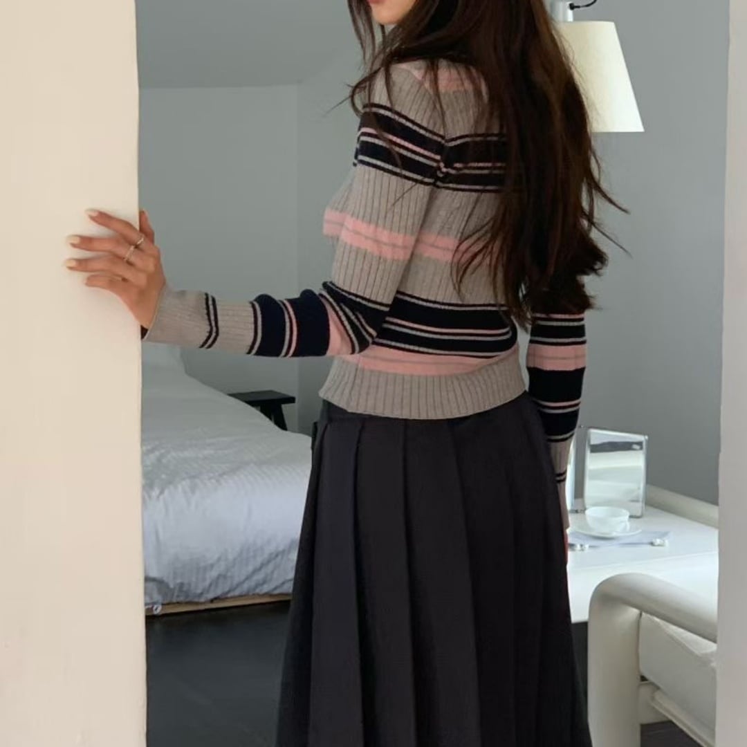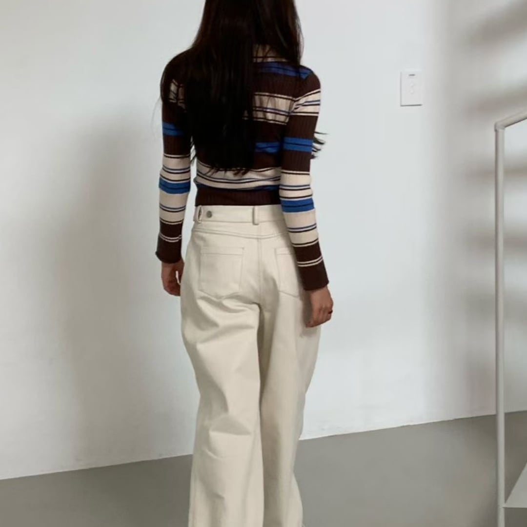 配色ストライプが目を惹く、すっきりとしたスリムシルエットのトップス。