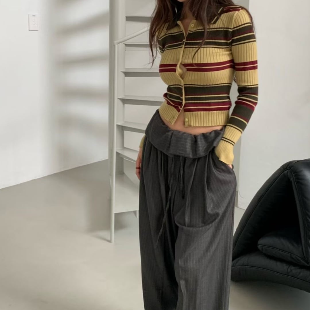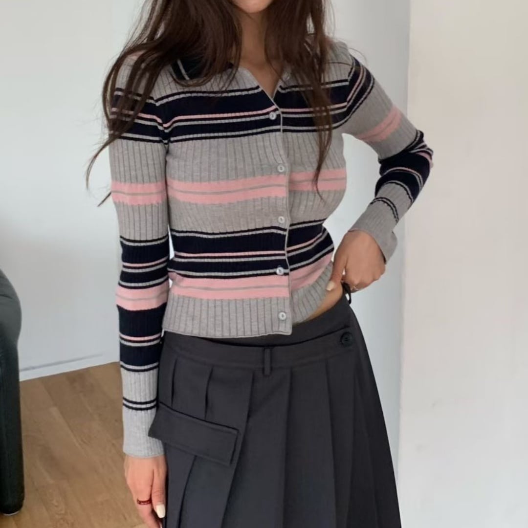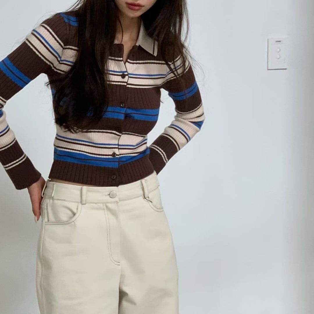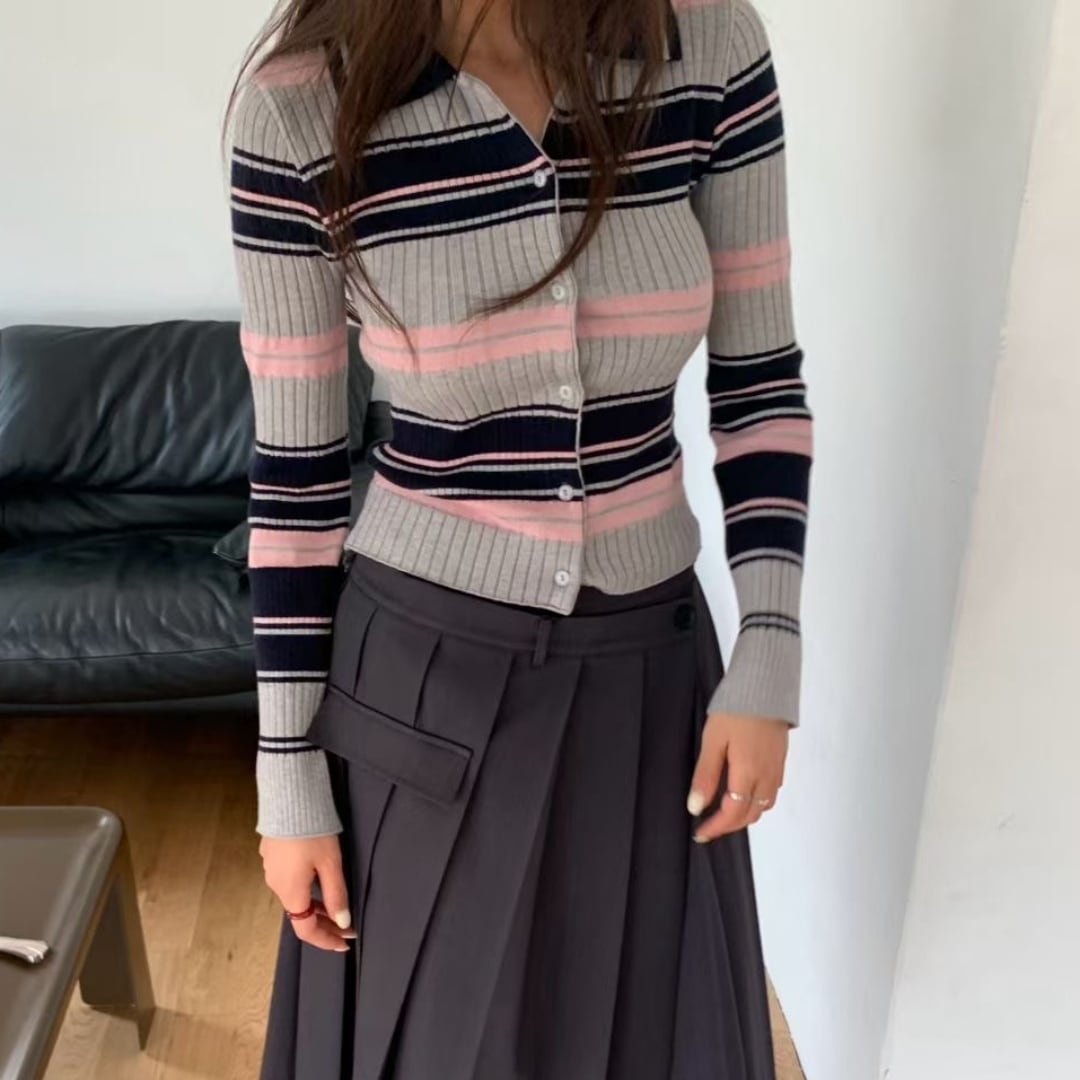 配色ストライプが目を惹く、すっきりとしたスリムシルエットのトップス。