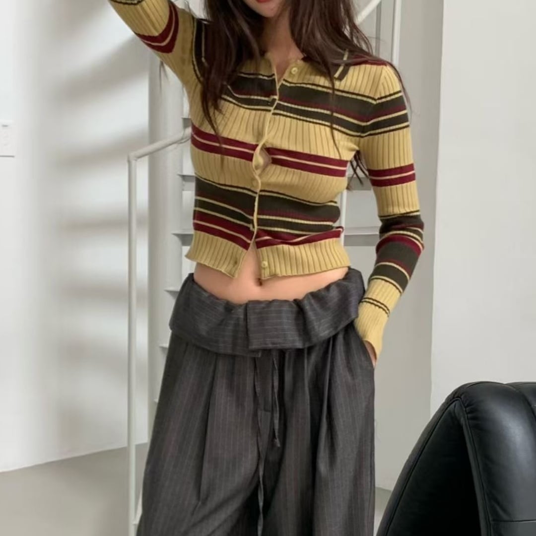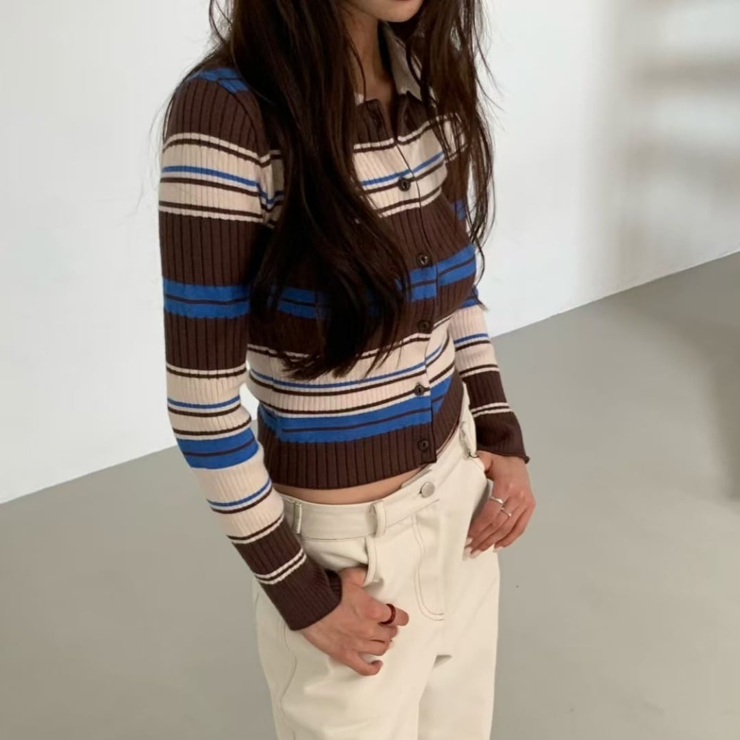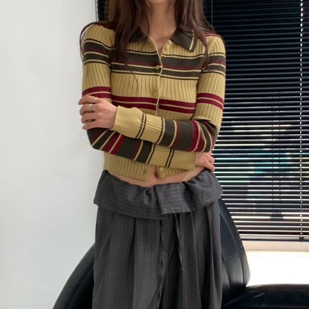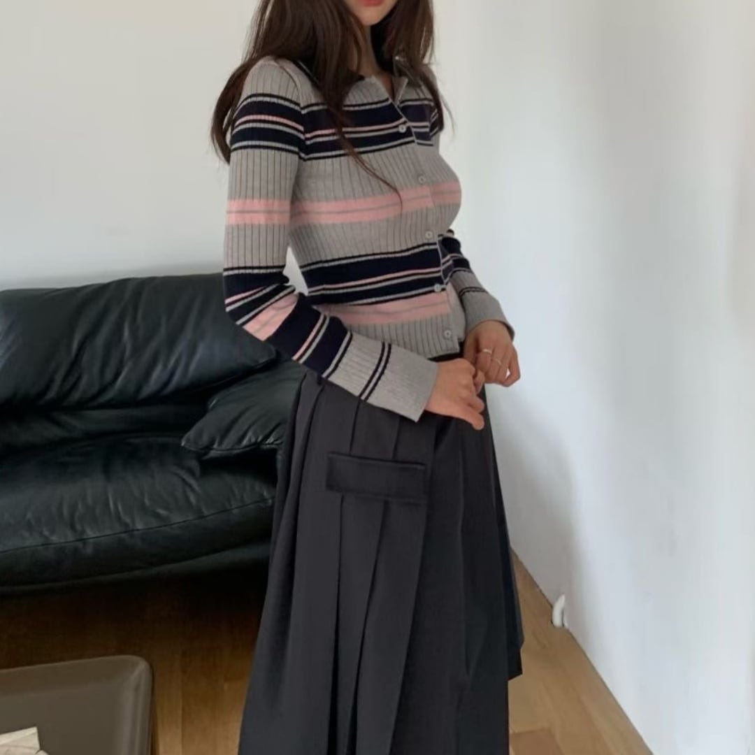 配色ストライプが目を惹く、すっきりとしたスリムシルエットのトップス。