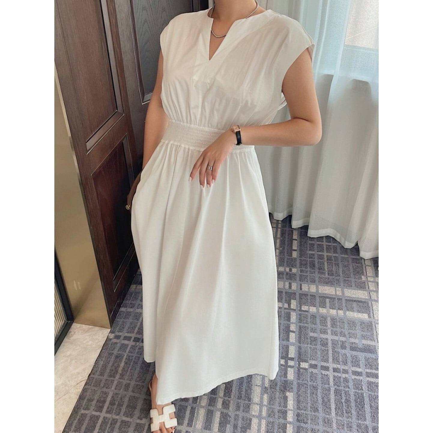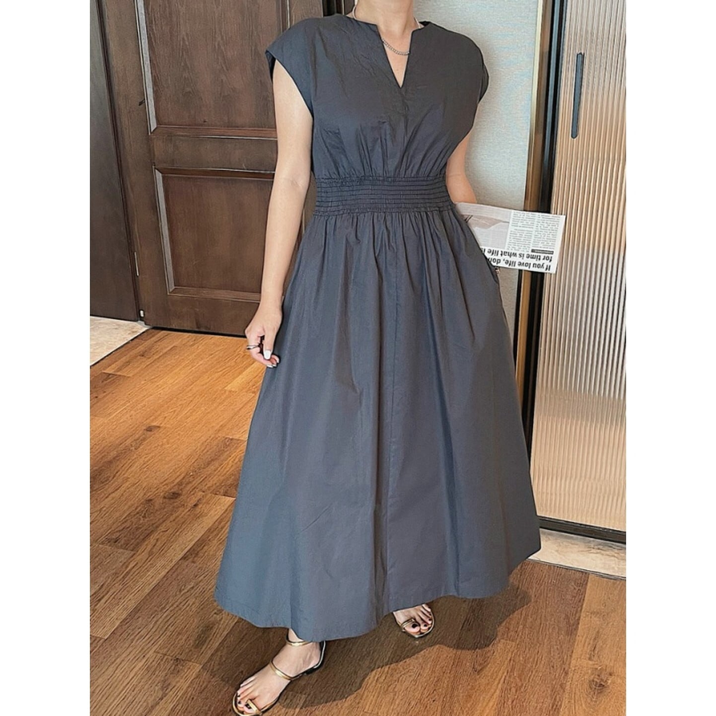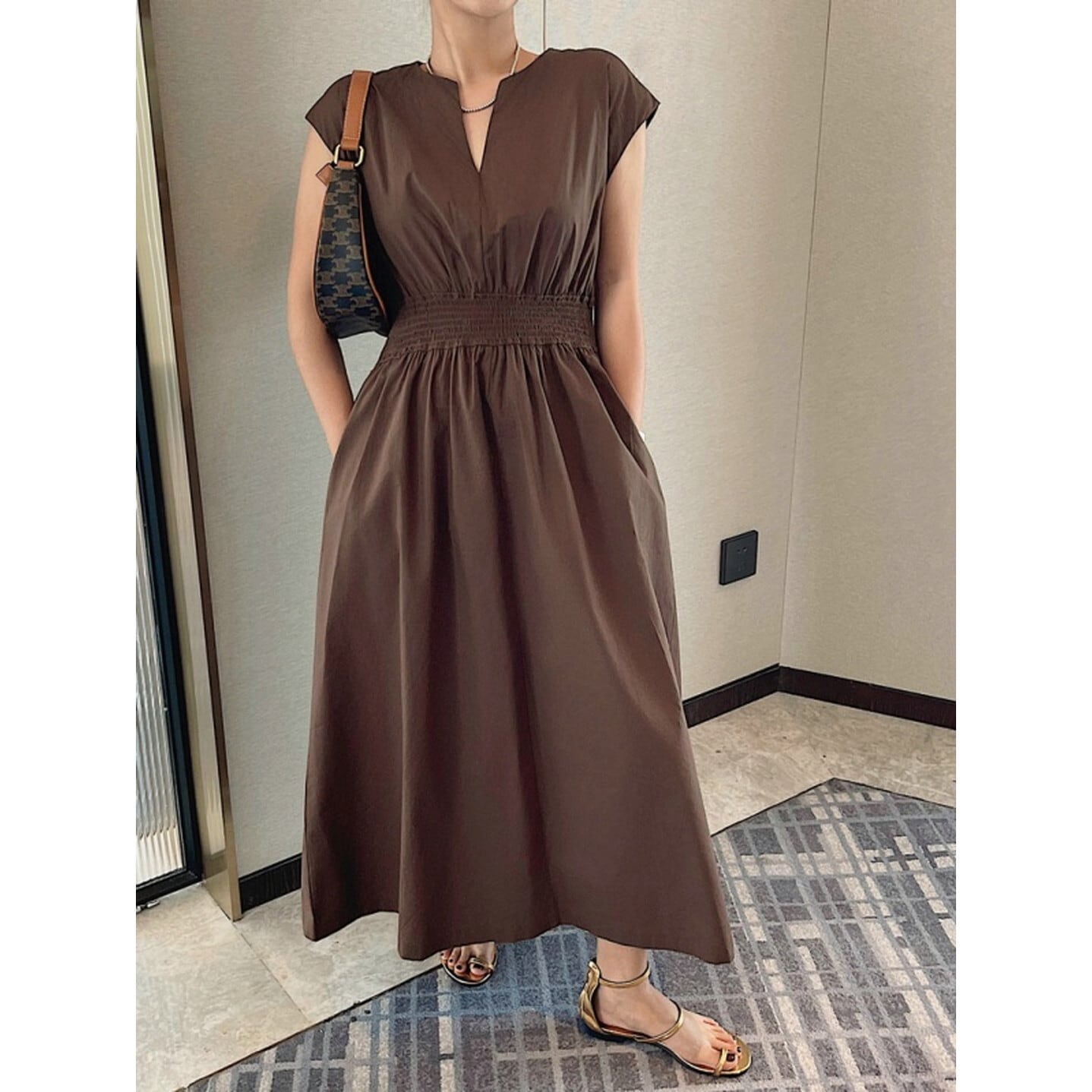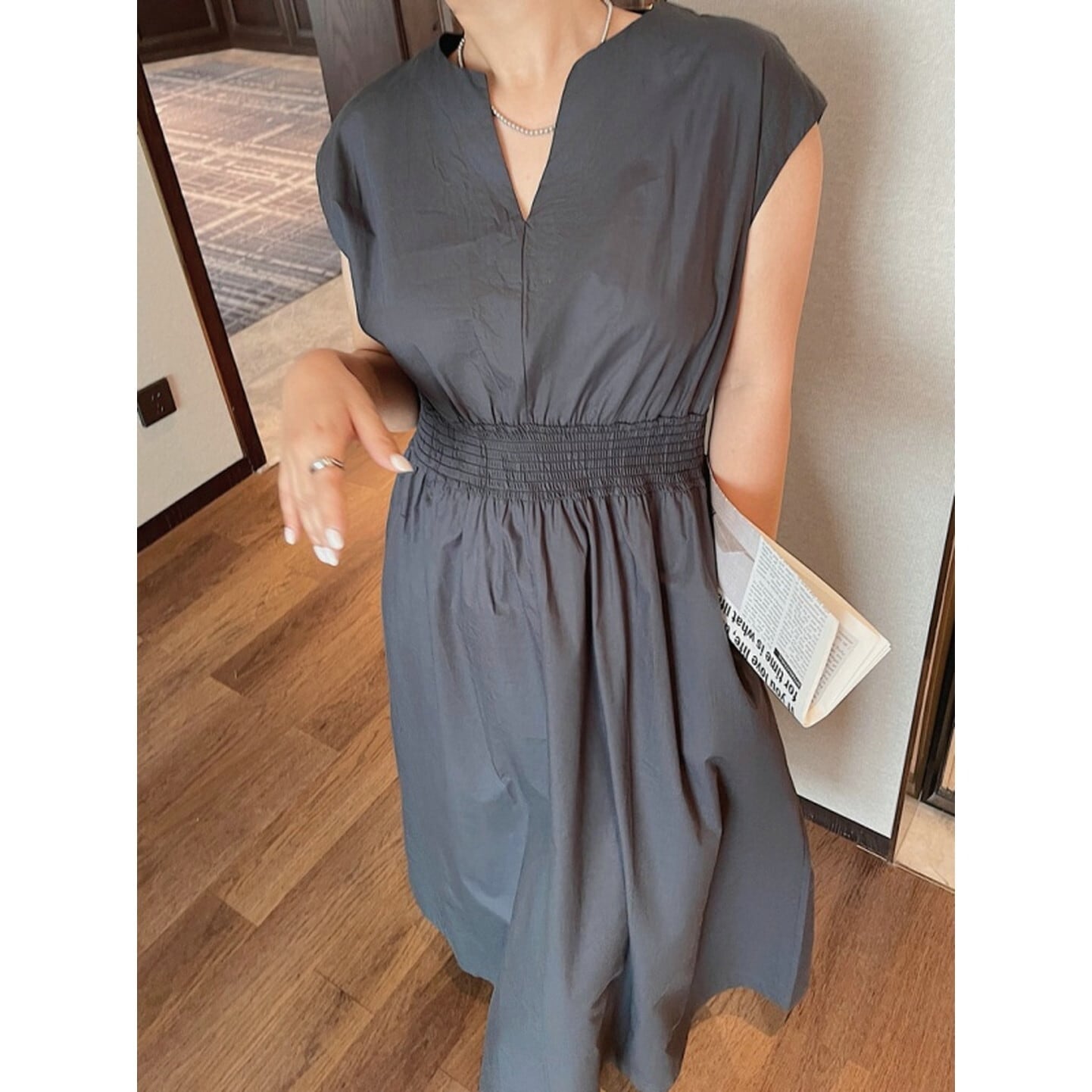 ウエストギャザーが立体感を生み出す、女性らしいVネックワンピース。