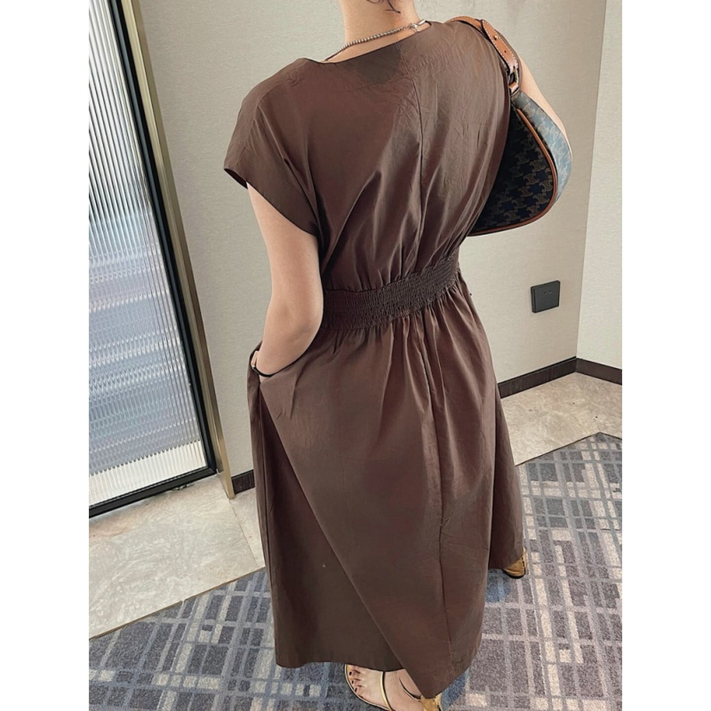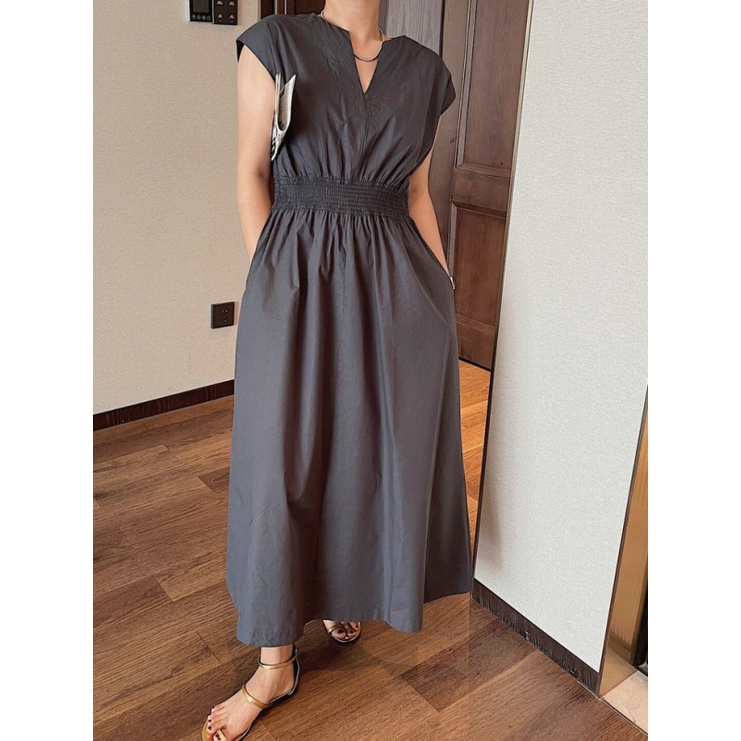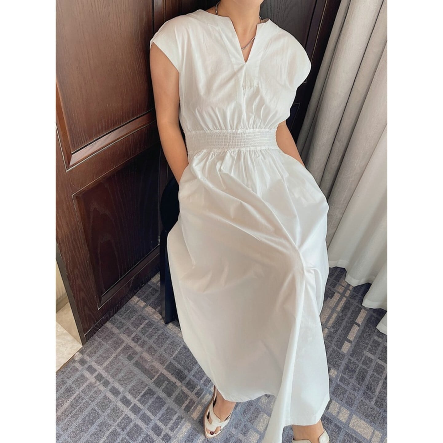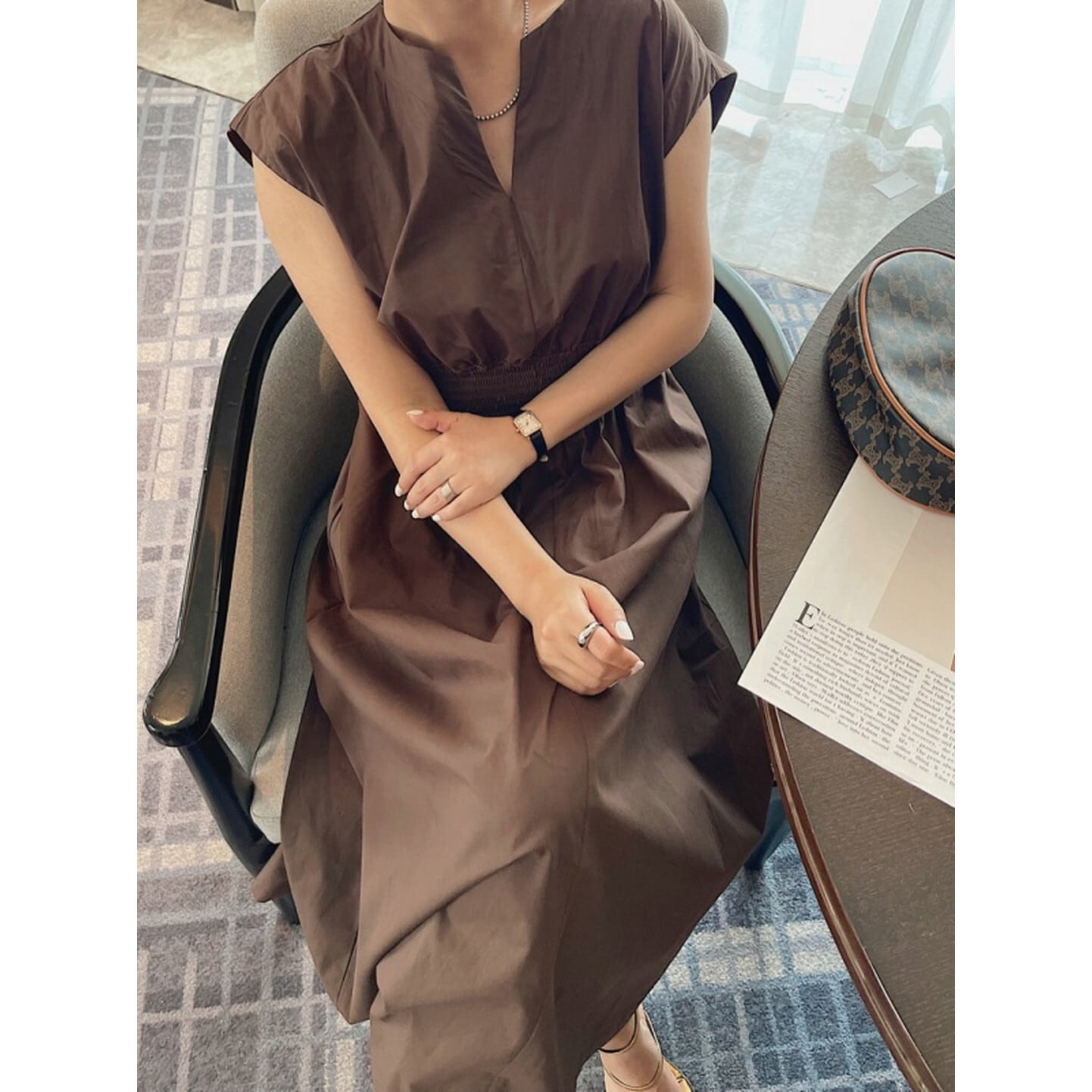 ウエストギャザーが立体感を生み出す、女性らしいVネックワンピース。
