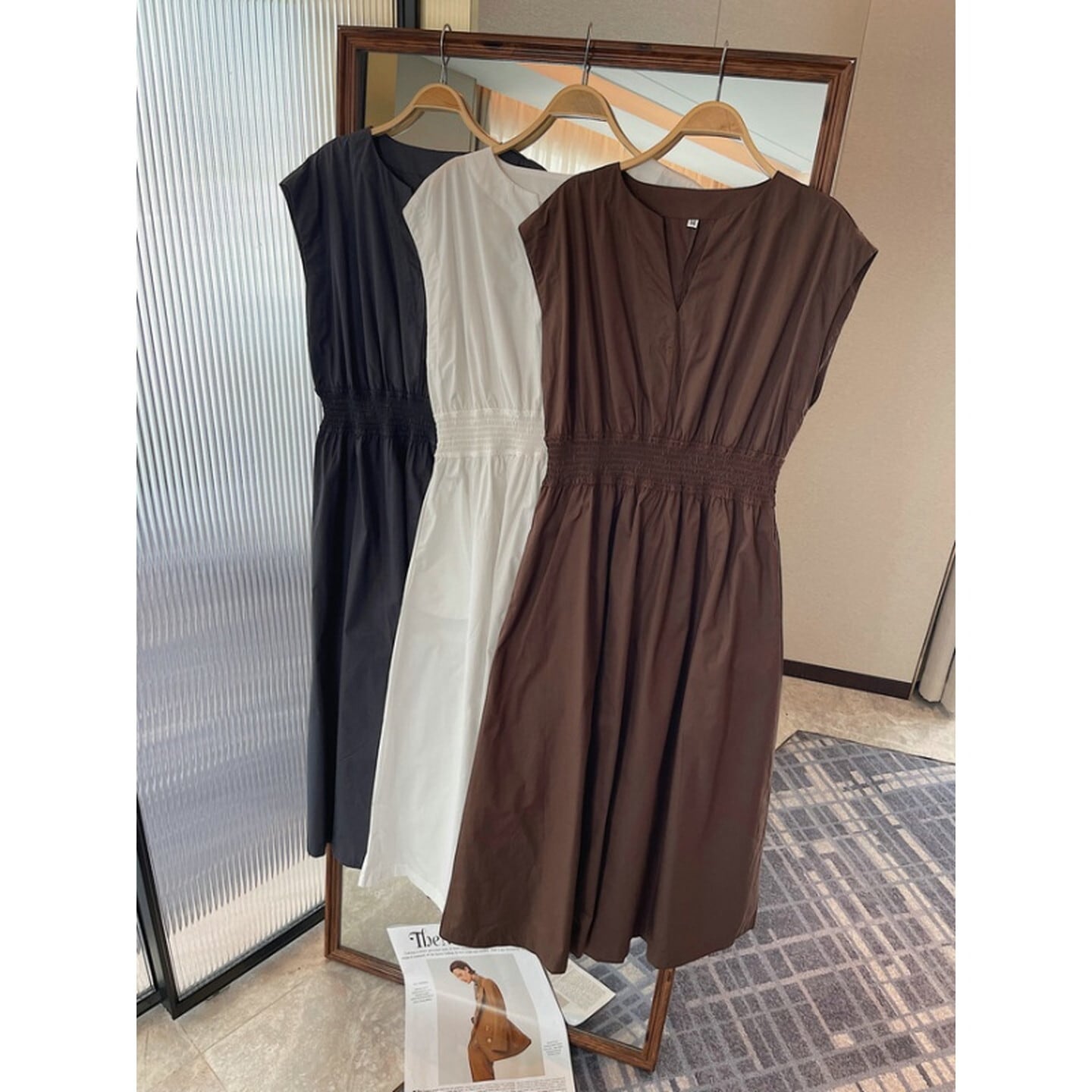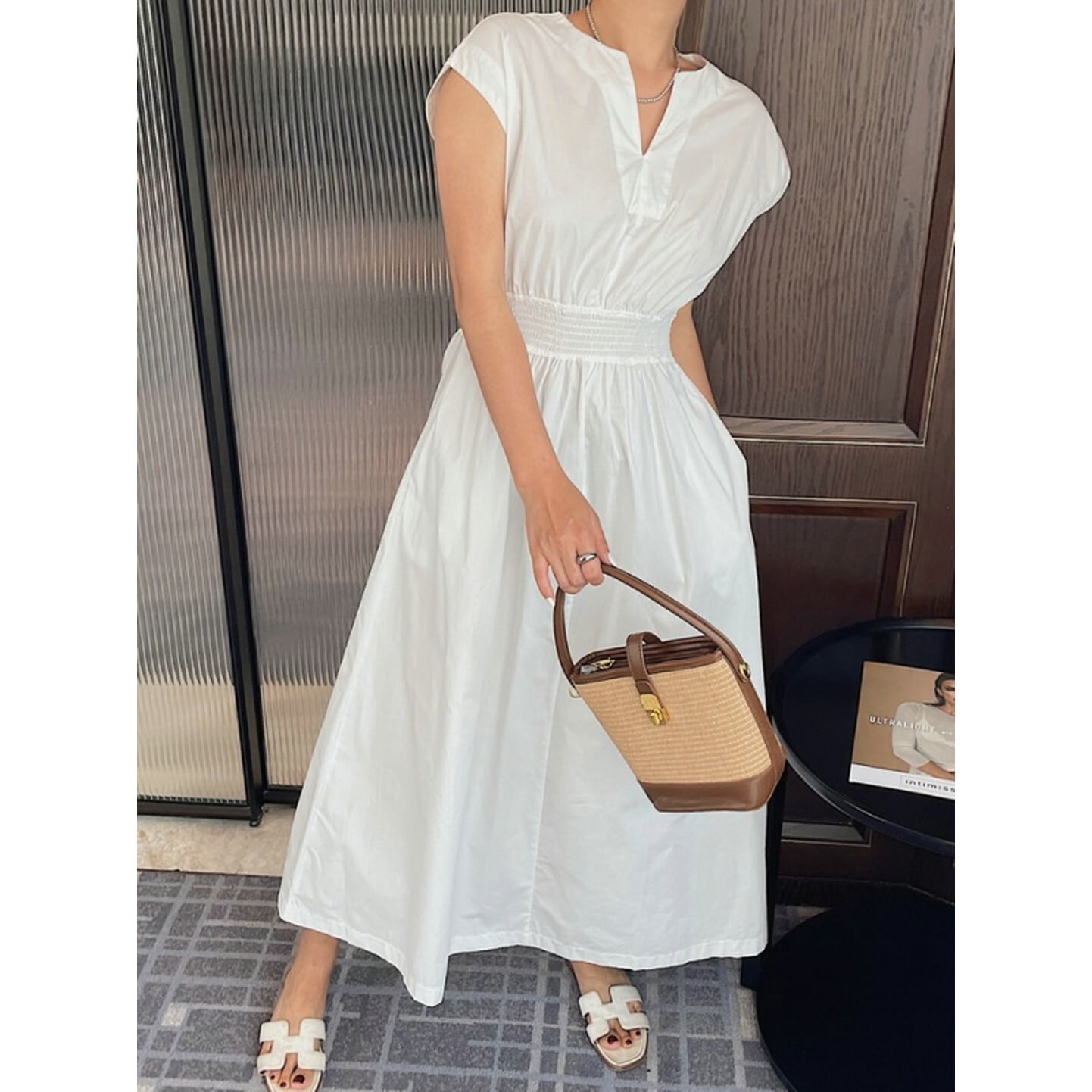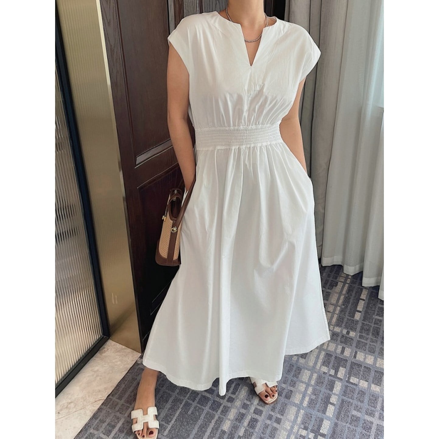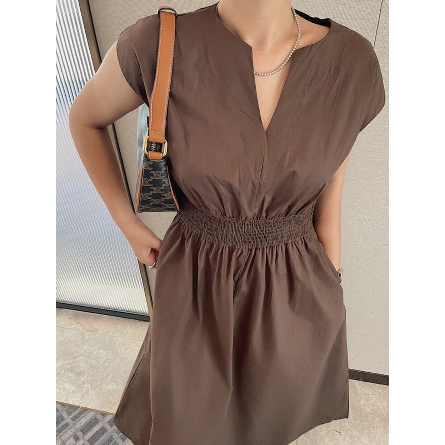 ウエストギャザーが立体感を生み出す、女性らしいVネックワンピース。