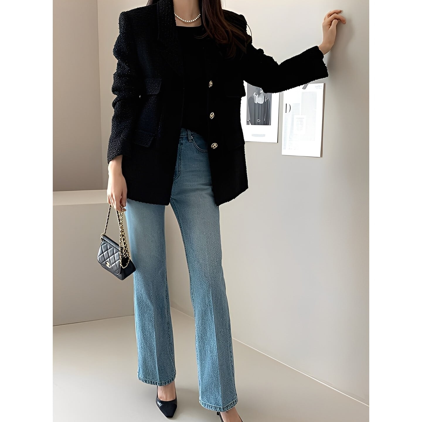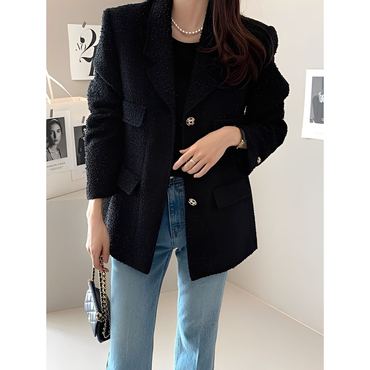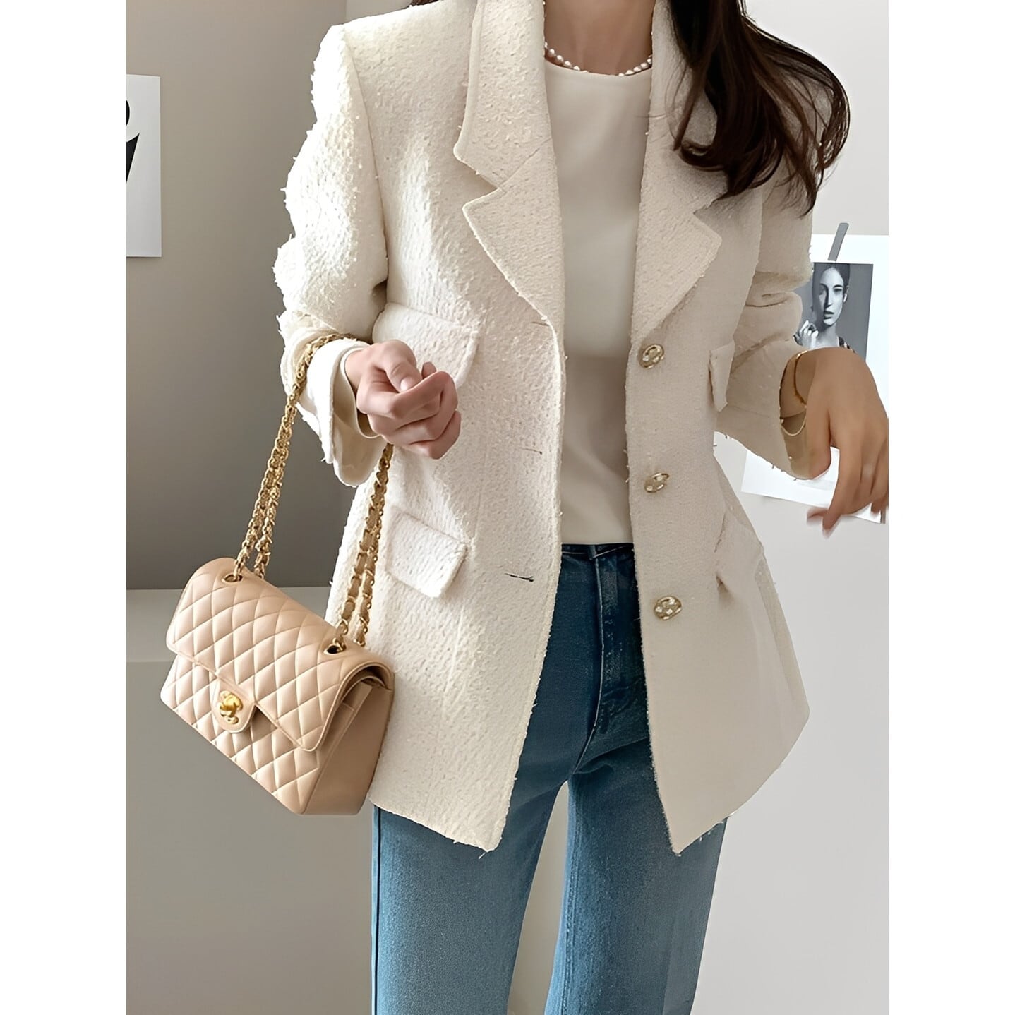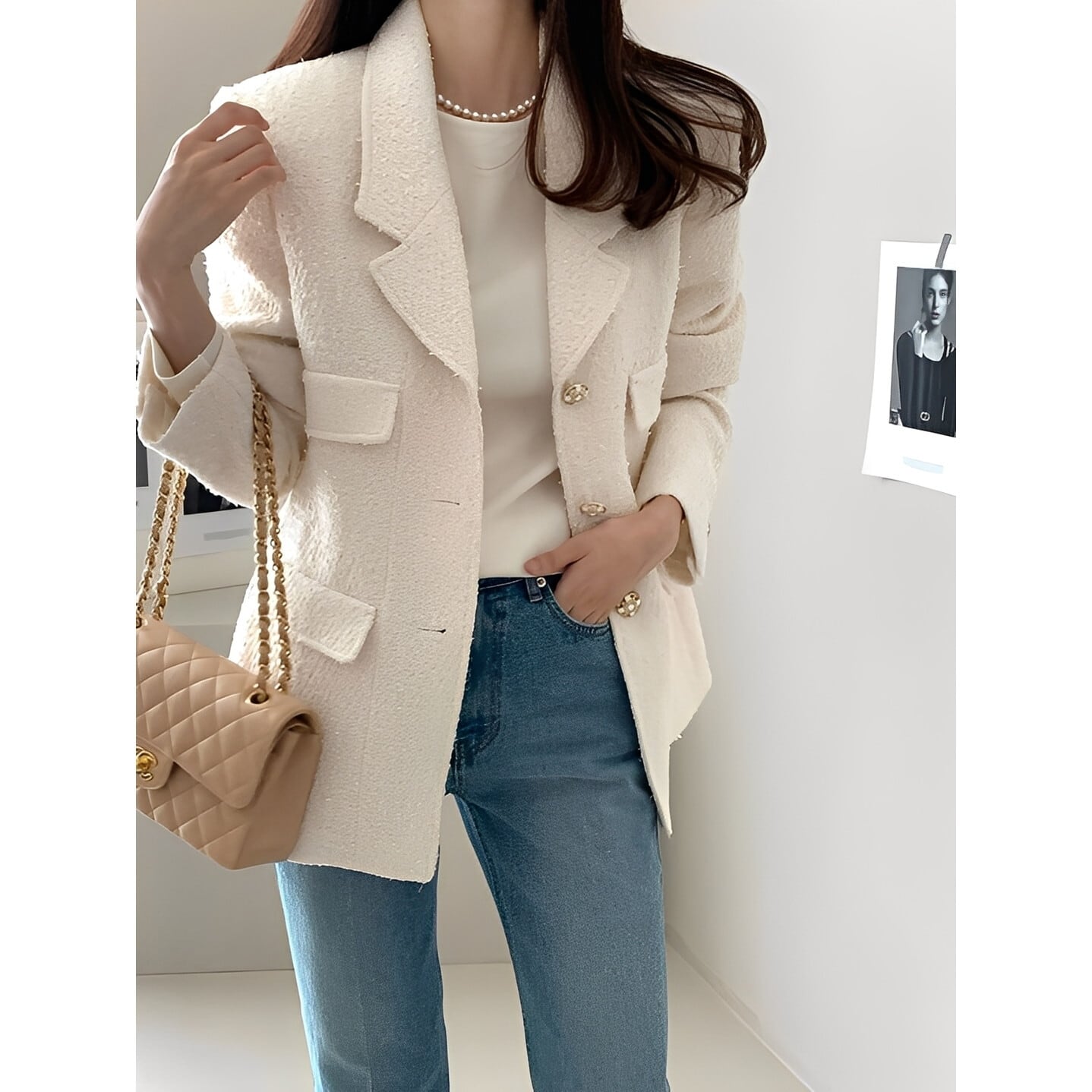 クラシカルなツイード素材が目を惹く、テーラードジャケット。