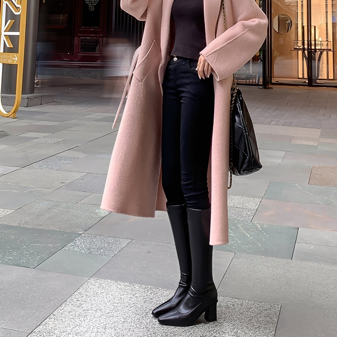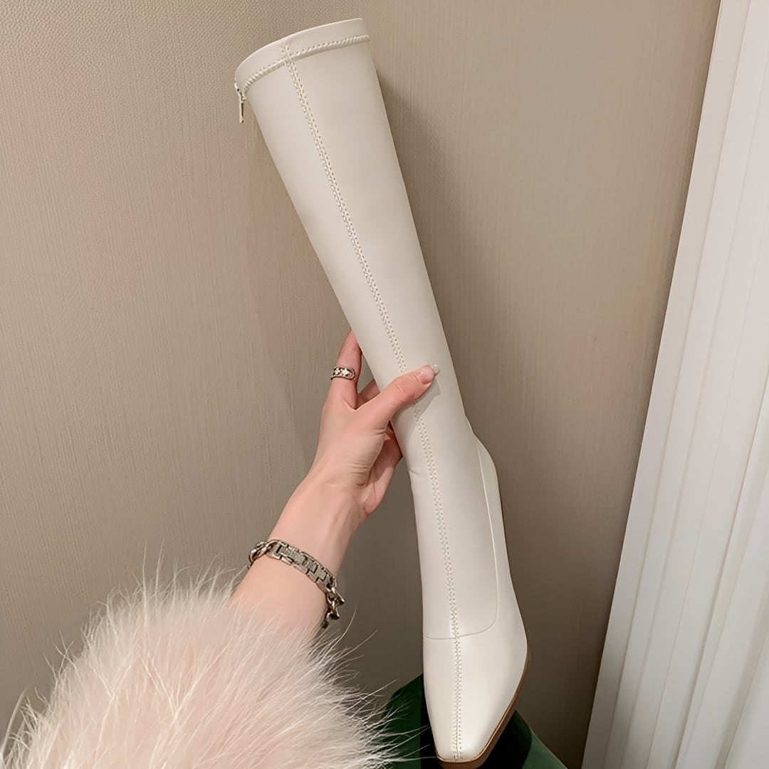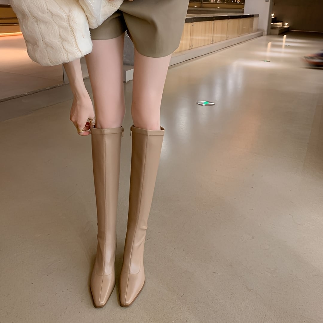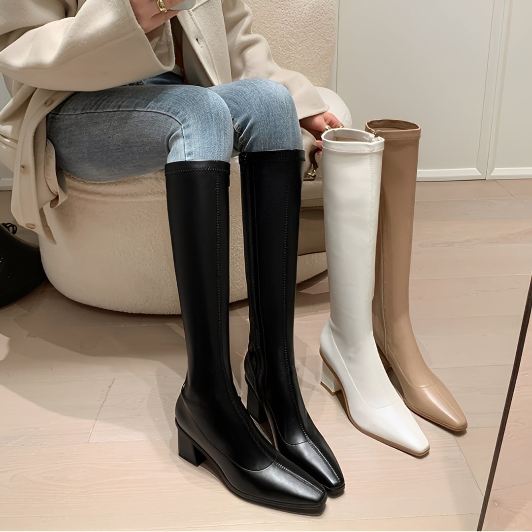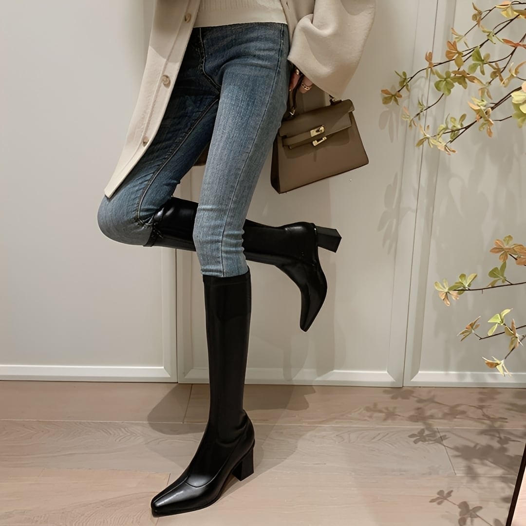 安定感のあるチャンキーヒールで歩きやすさも兼ね備えた、スリムロングブーツ。