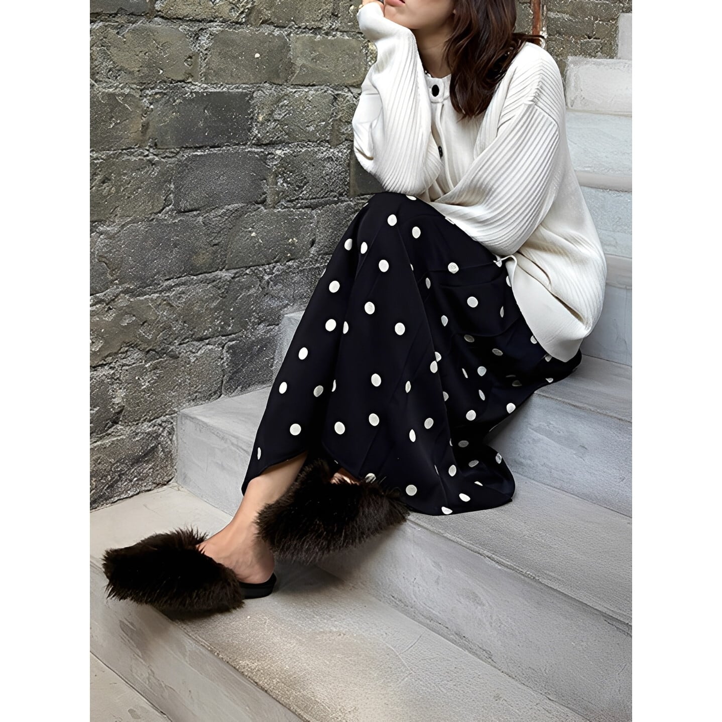 動くたびふわりと広がるシルエットが魅力の、クラシックなドット柄フレアスカート。