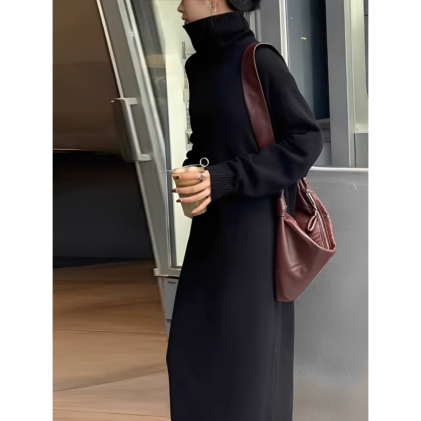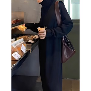 ハイネックが上品な印象を与える、マキシ丈のニットワンピース。
