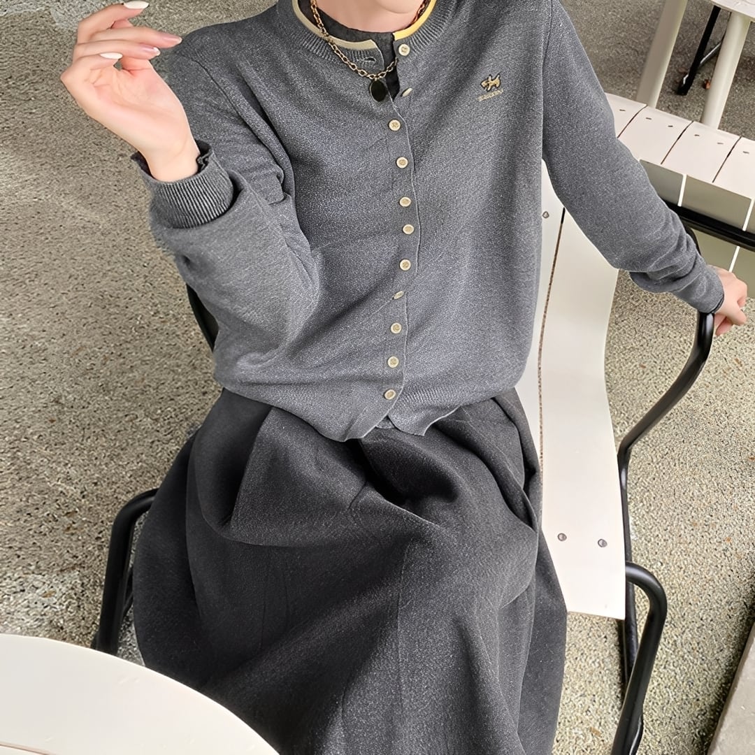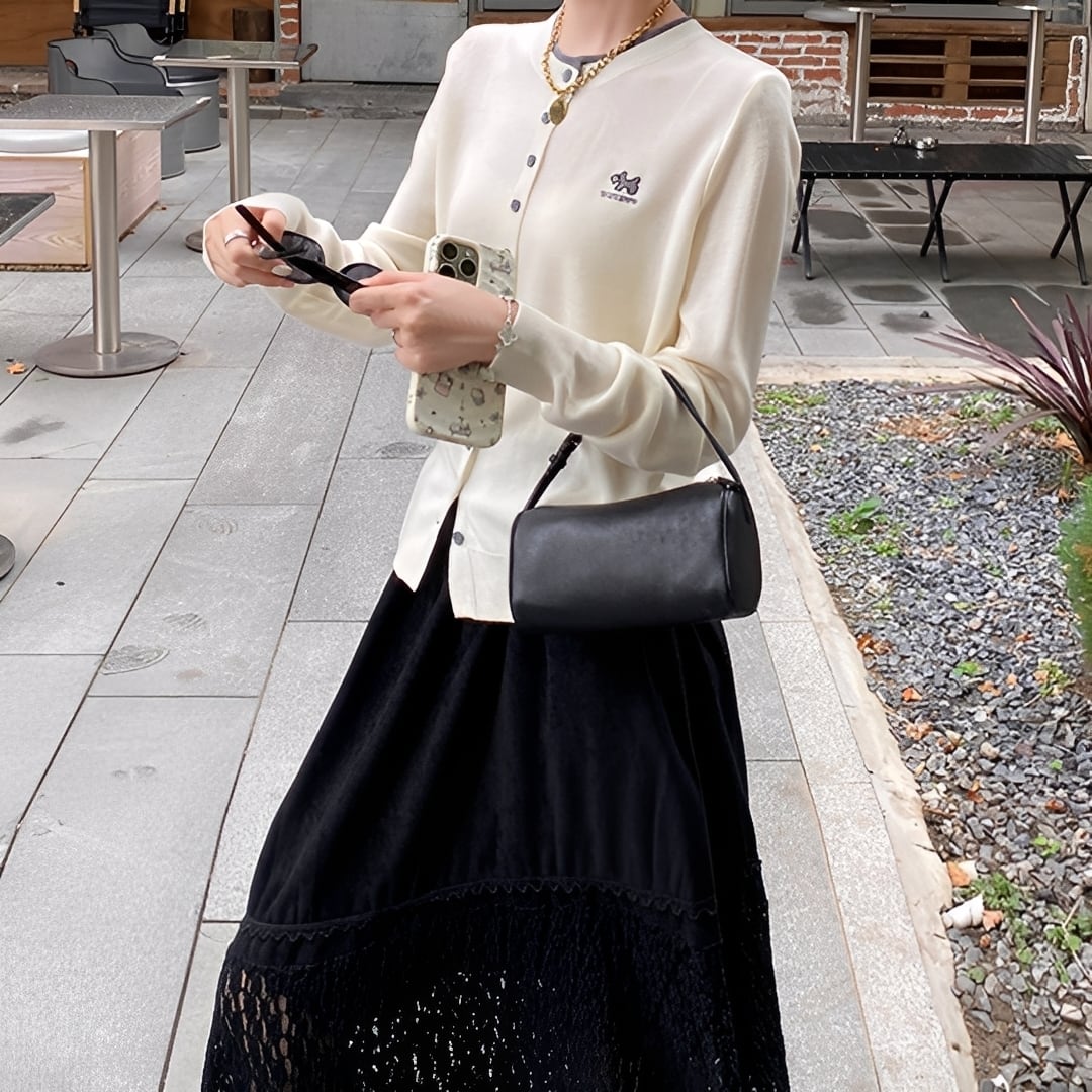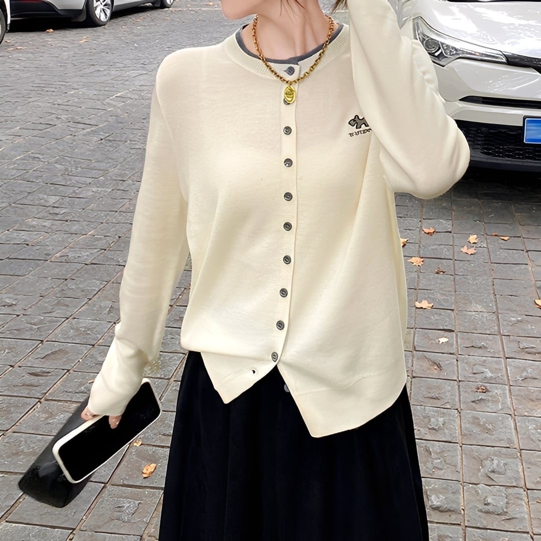 胸元のさりげないワンポイントが大人の遊び心を添える、ベーシックカーディガン。