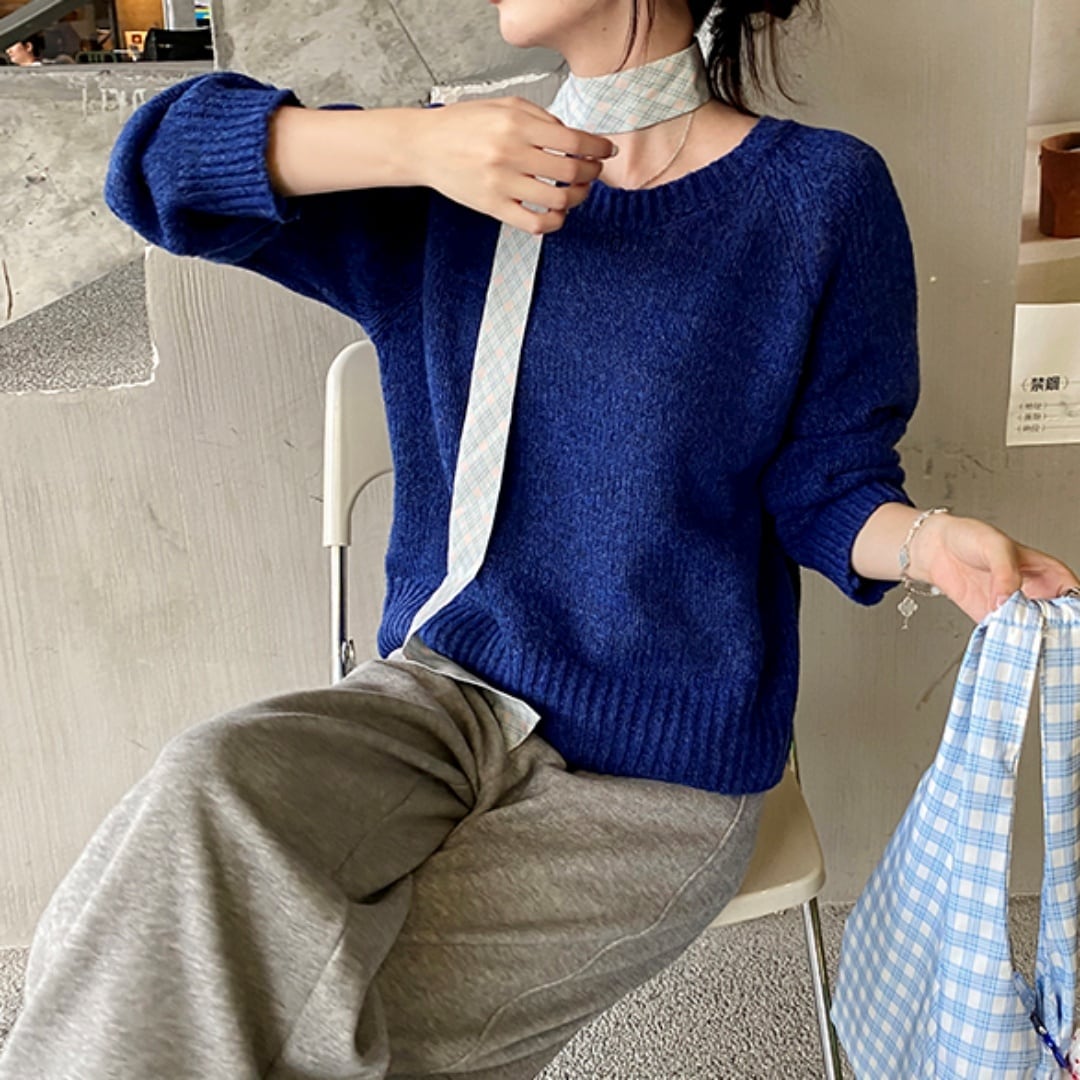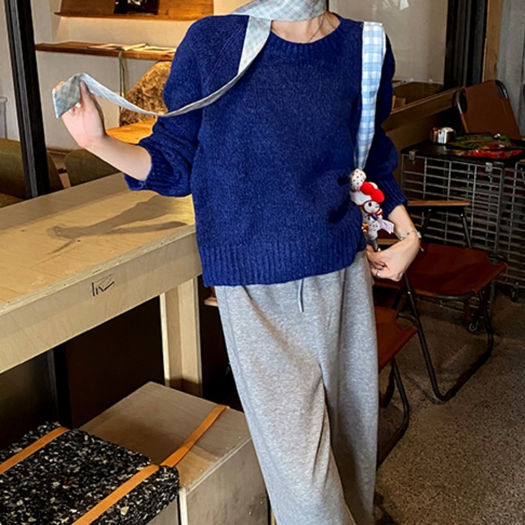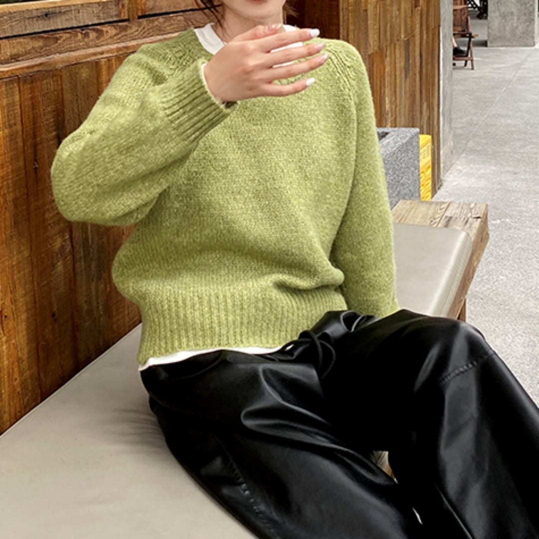 どんなコーデにもなじむ、ベーシックカラーのクルーネックニット。