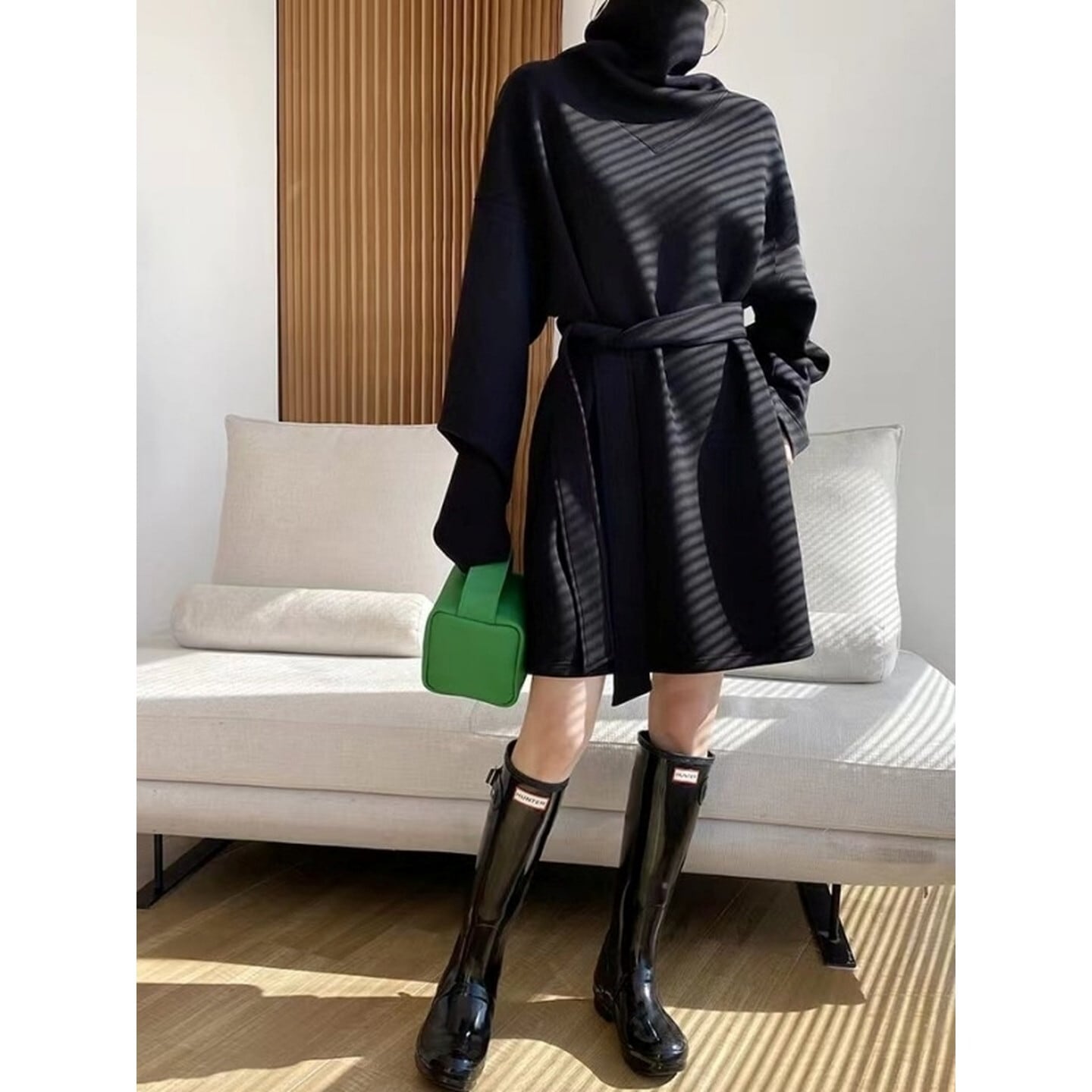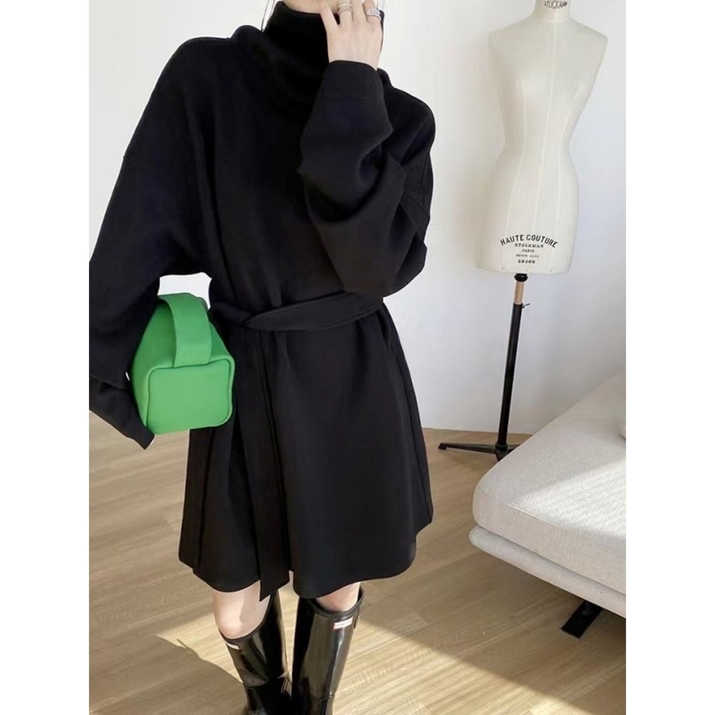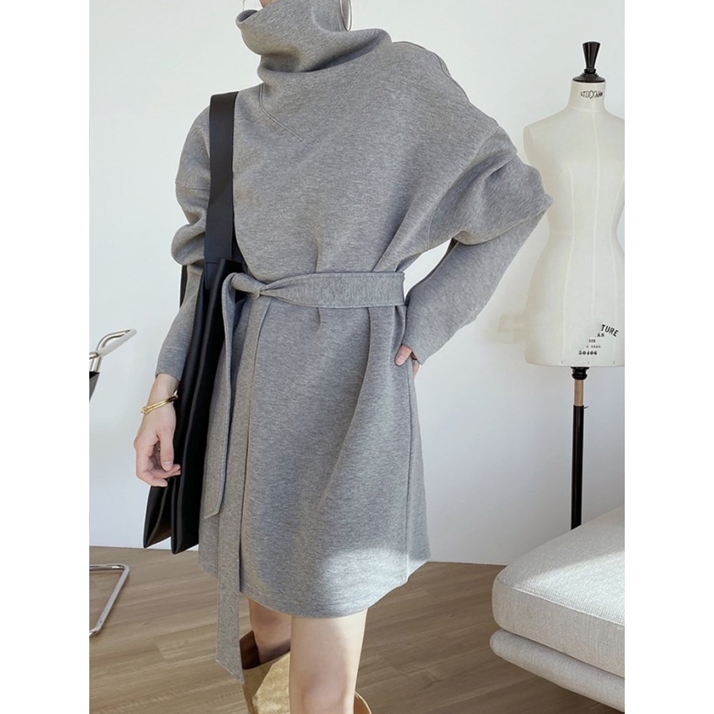 ふんわり袖とタートルネックが大人の可愛げを引き立てる、ベルト付きワンピース。