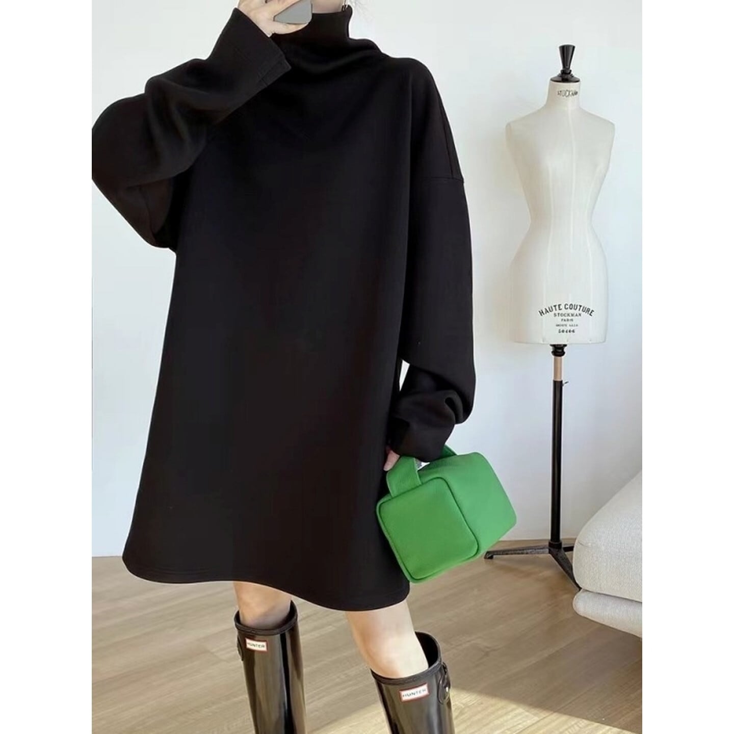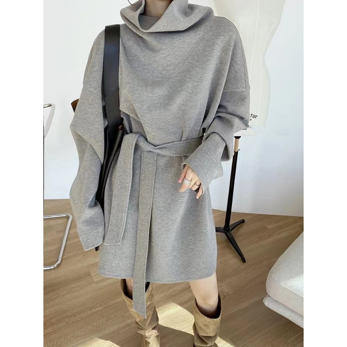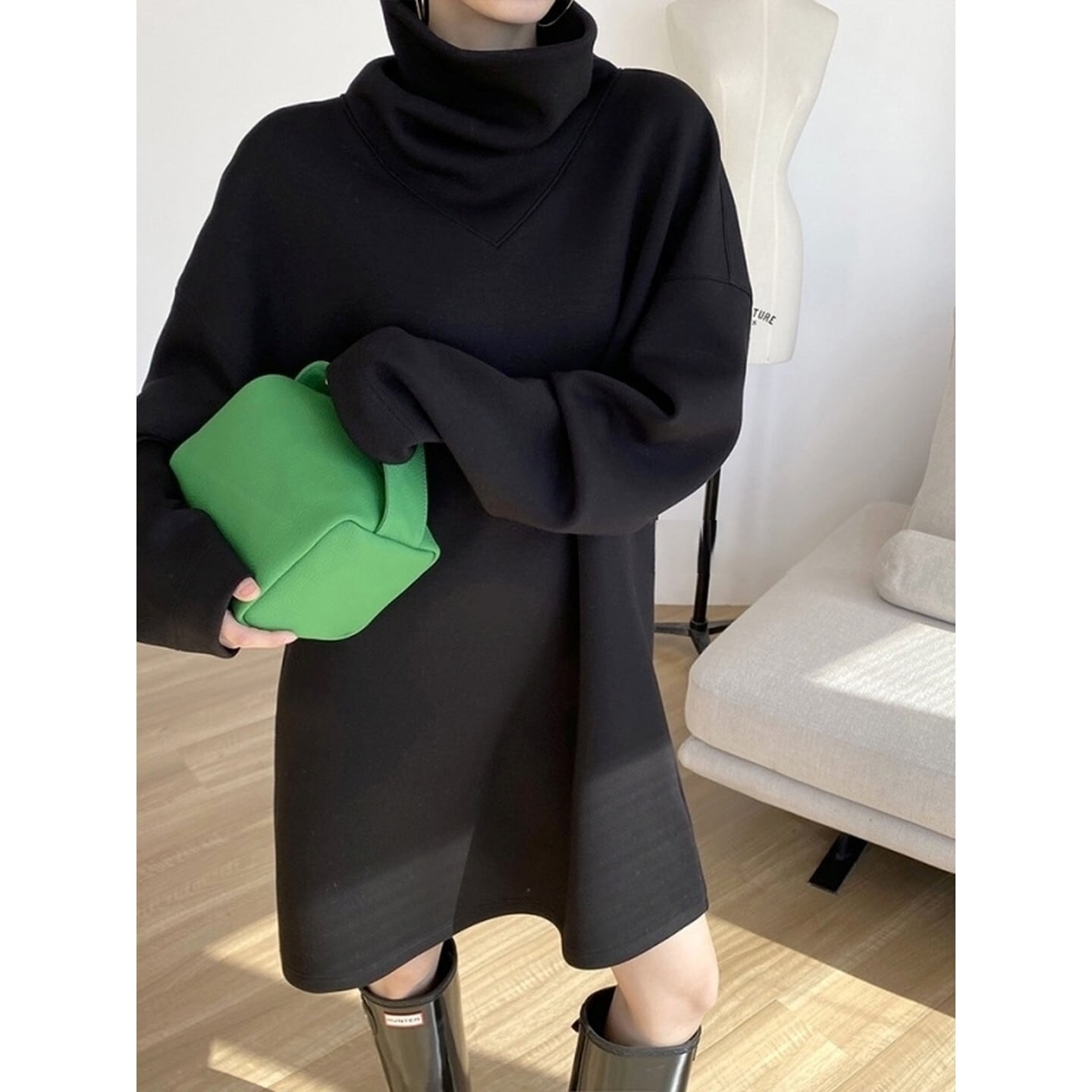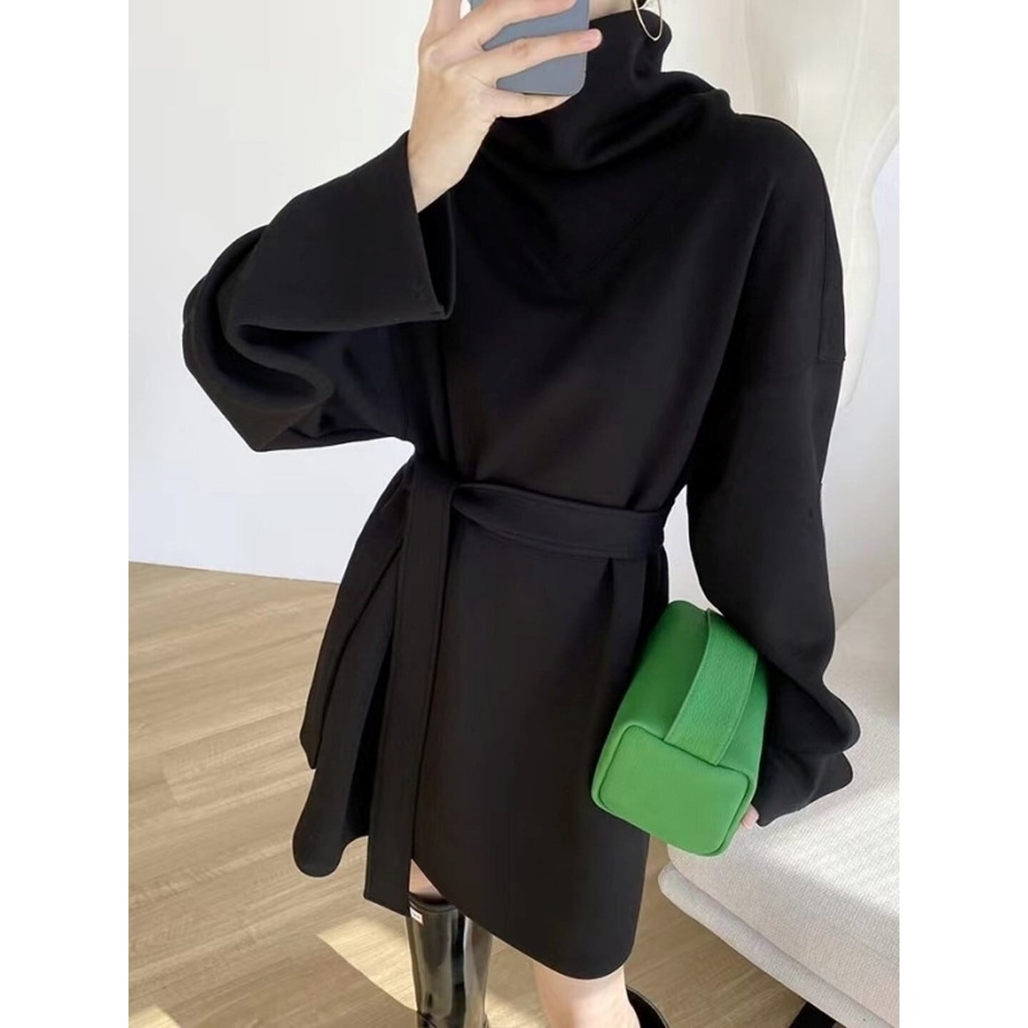 ふんわり袖とタートルネックが大人の可愛げを引き立てる、ベルト付きワンピース。