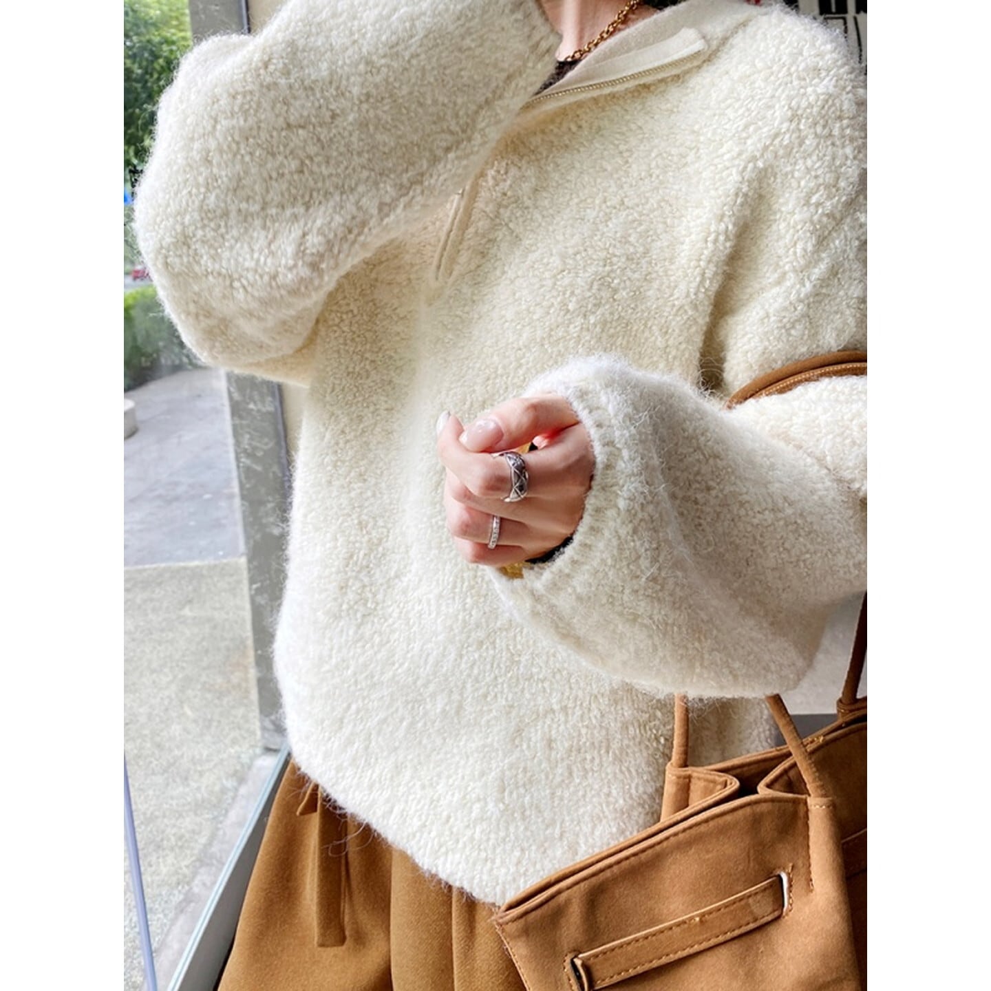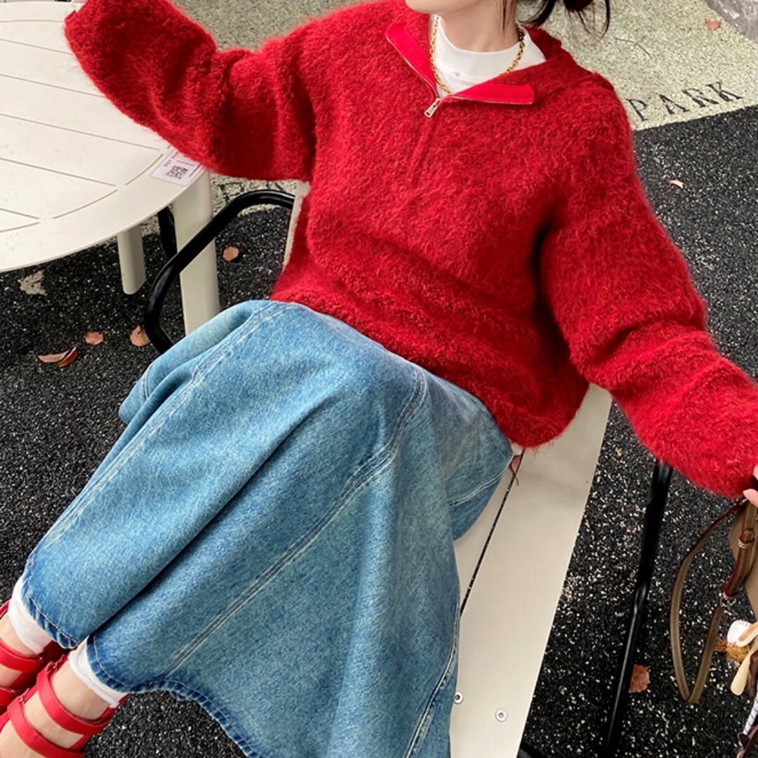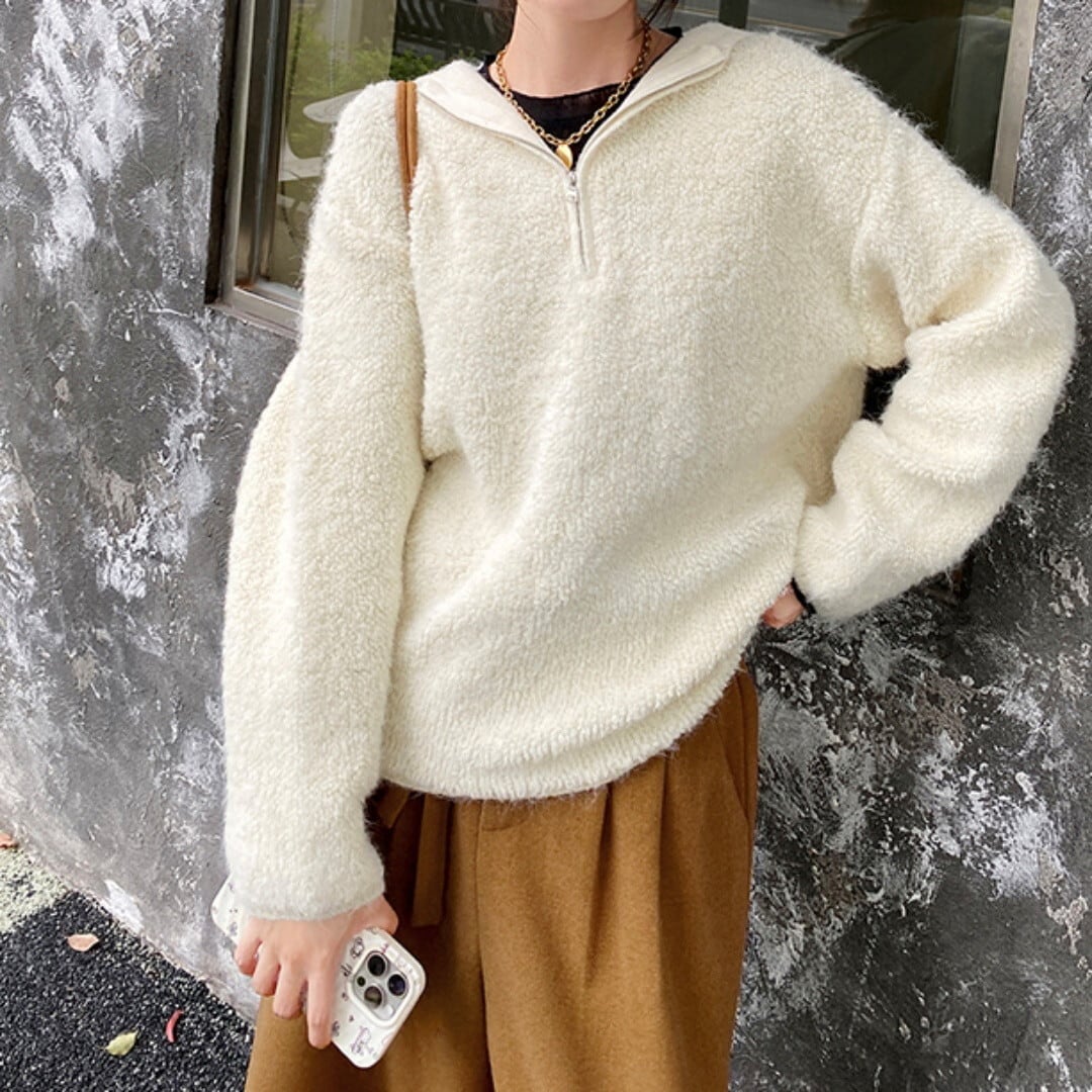 ふんわり柔らかな風合いが魅力の、ハーフジップデザインニット。