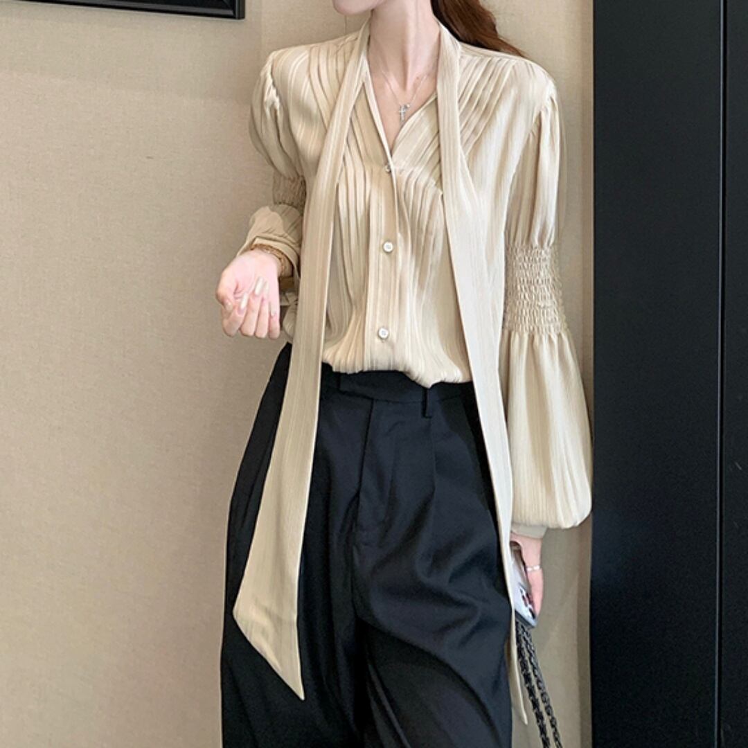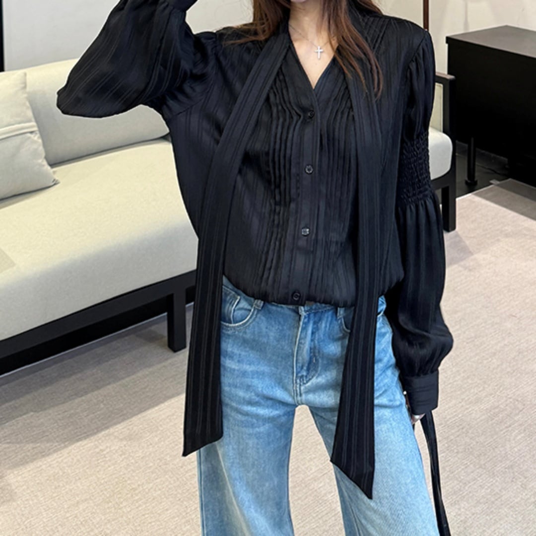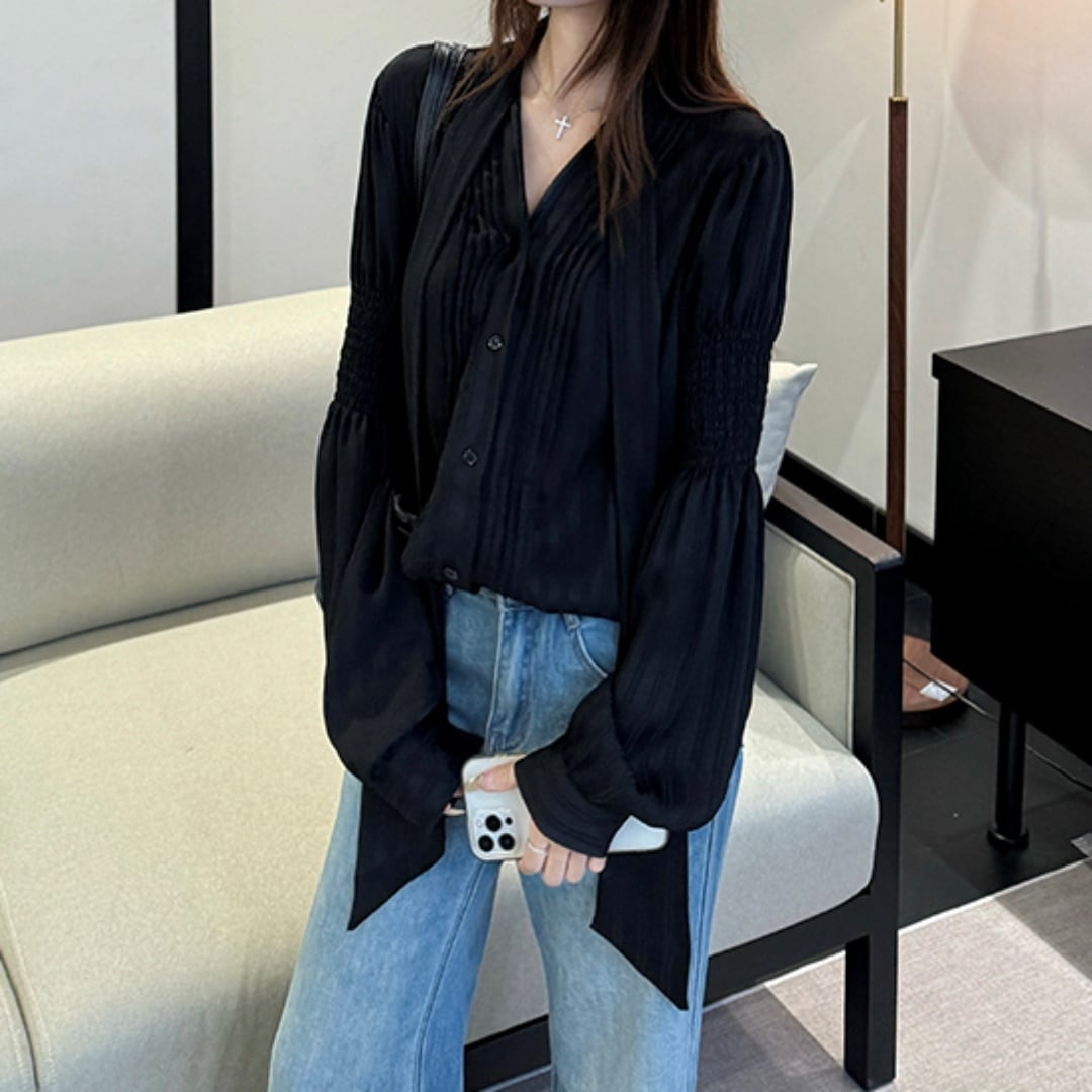 袖のシャーリングとタイデザインが、さりげない華やかさを添える大人ブラウス。