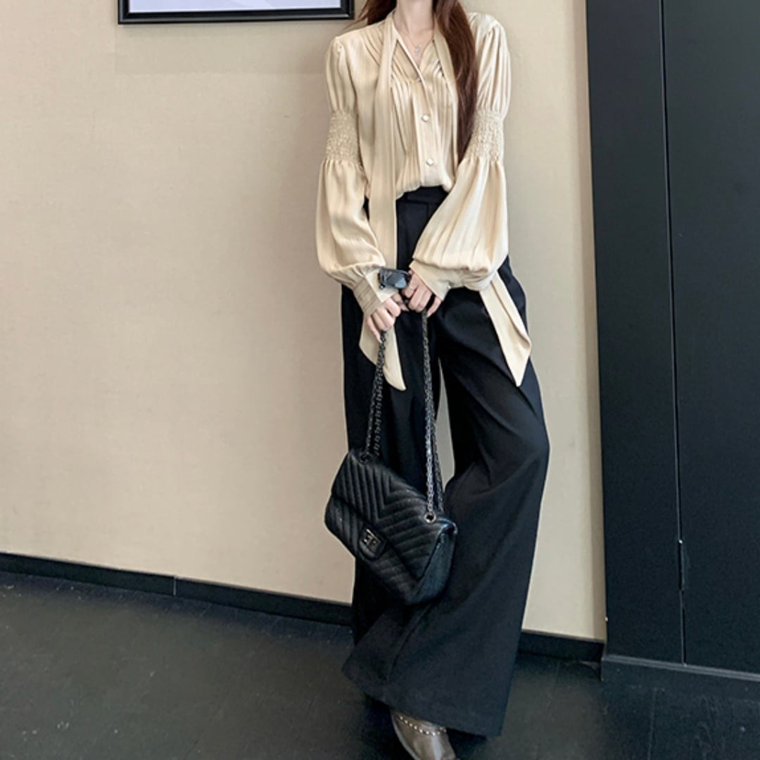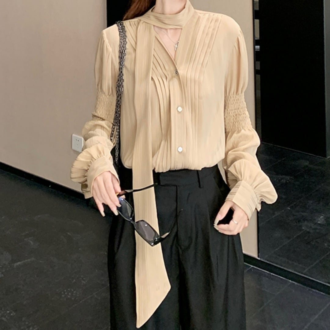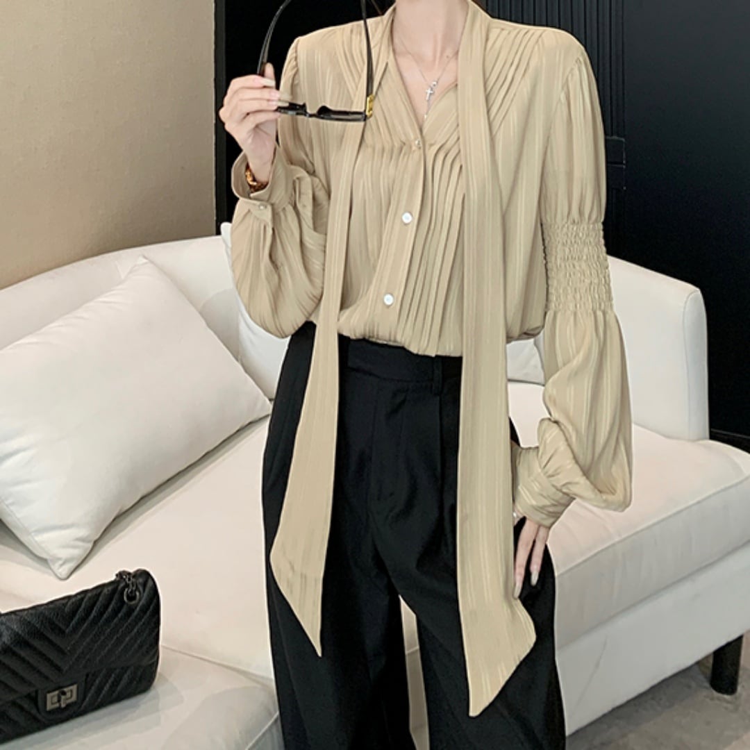 袖のシャーリングとタイデザインが、さりげない華やかさを添える大人ブラウス。