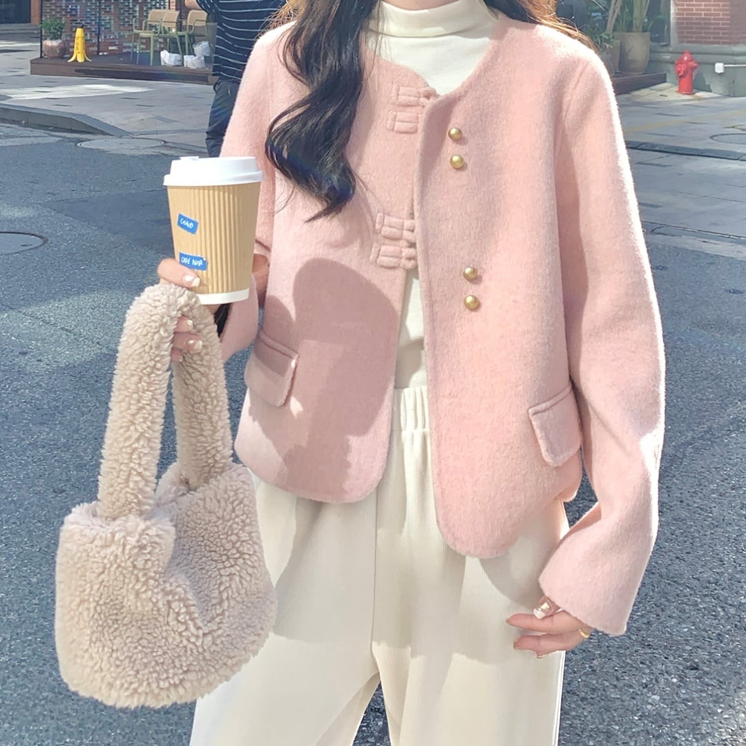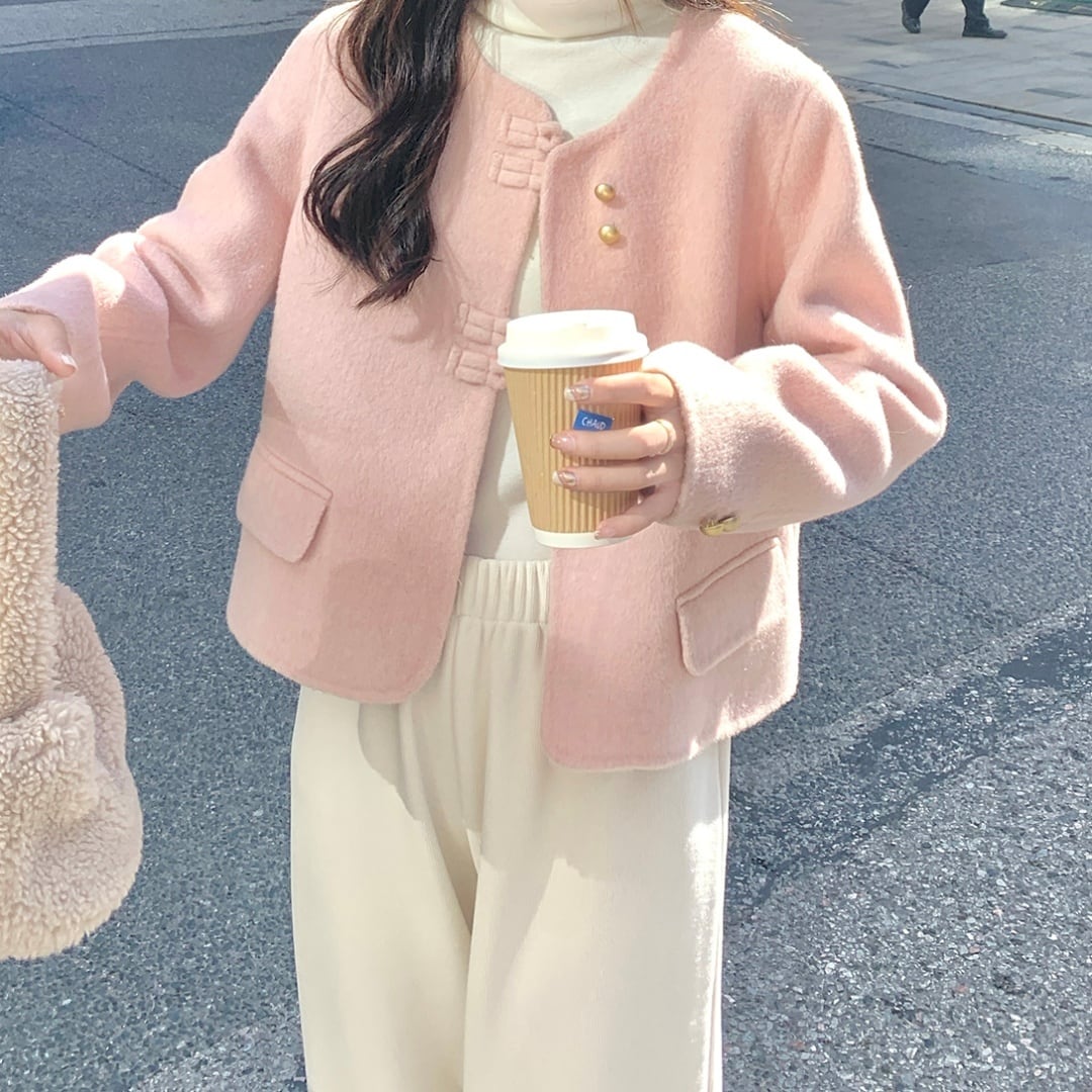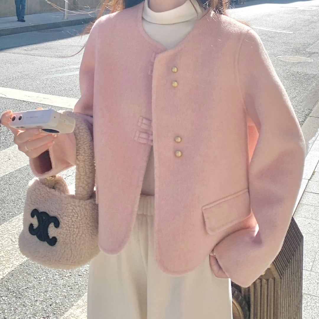 ローズピンクの色合いが、冬の街にやさしく映える一着。