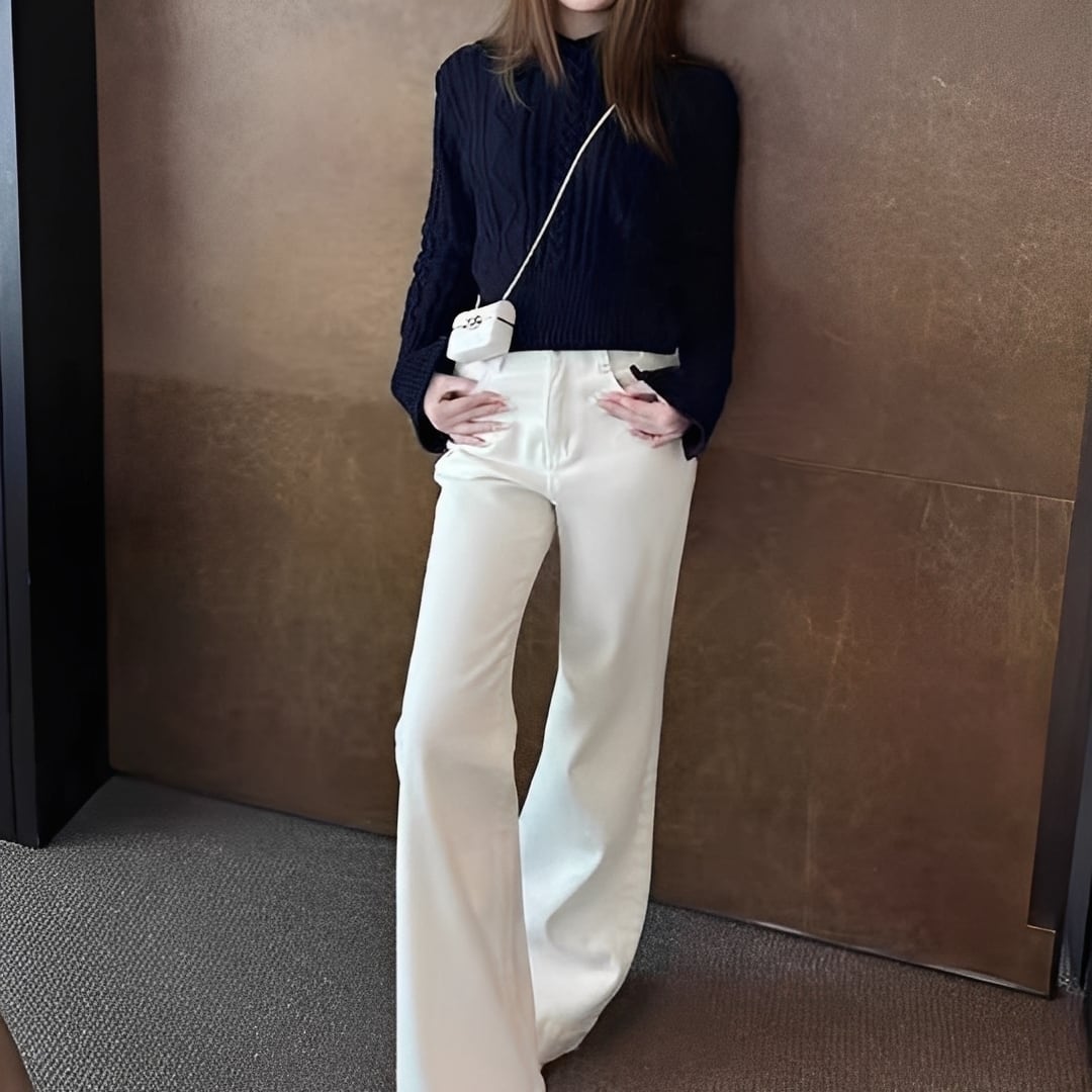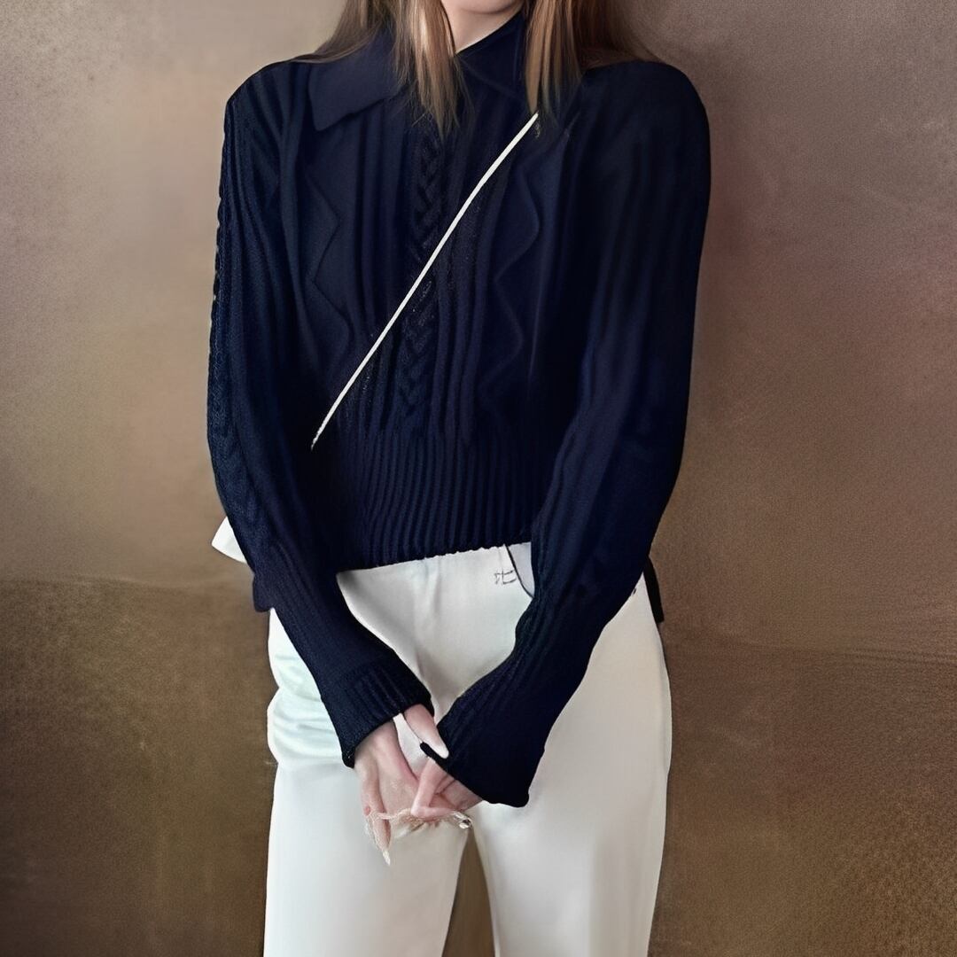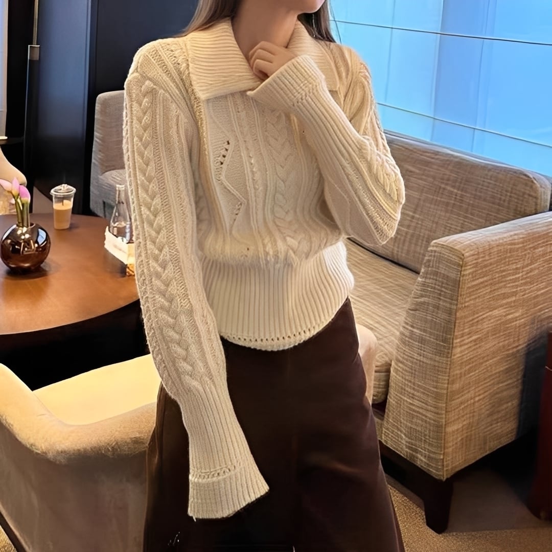 立体感のあるケーブル編みが上品な、クラシカルムード漂うニットプルオーバー。