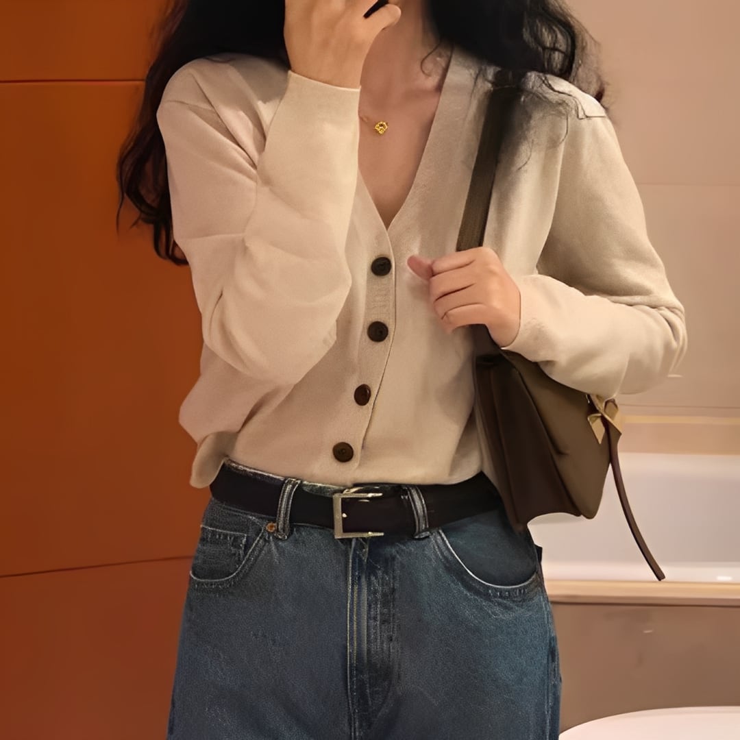 やわらかなラインとVネックが女性らしさを引き立てる、大人のカーディガン。