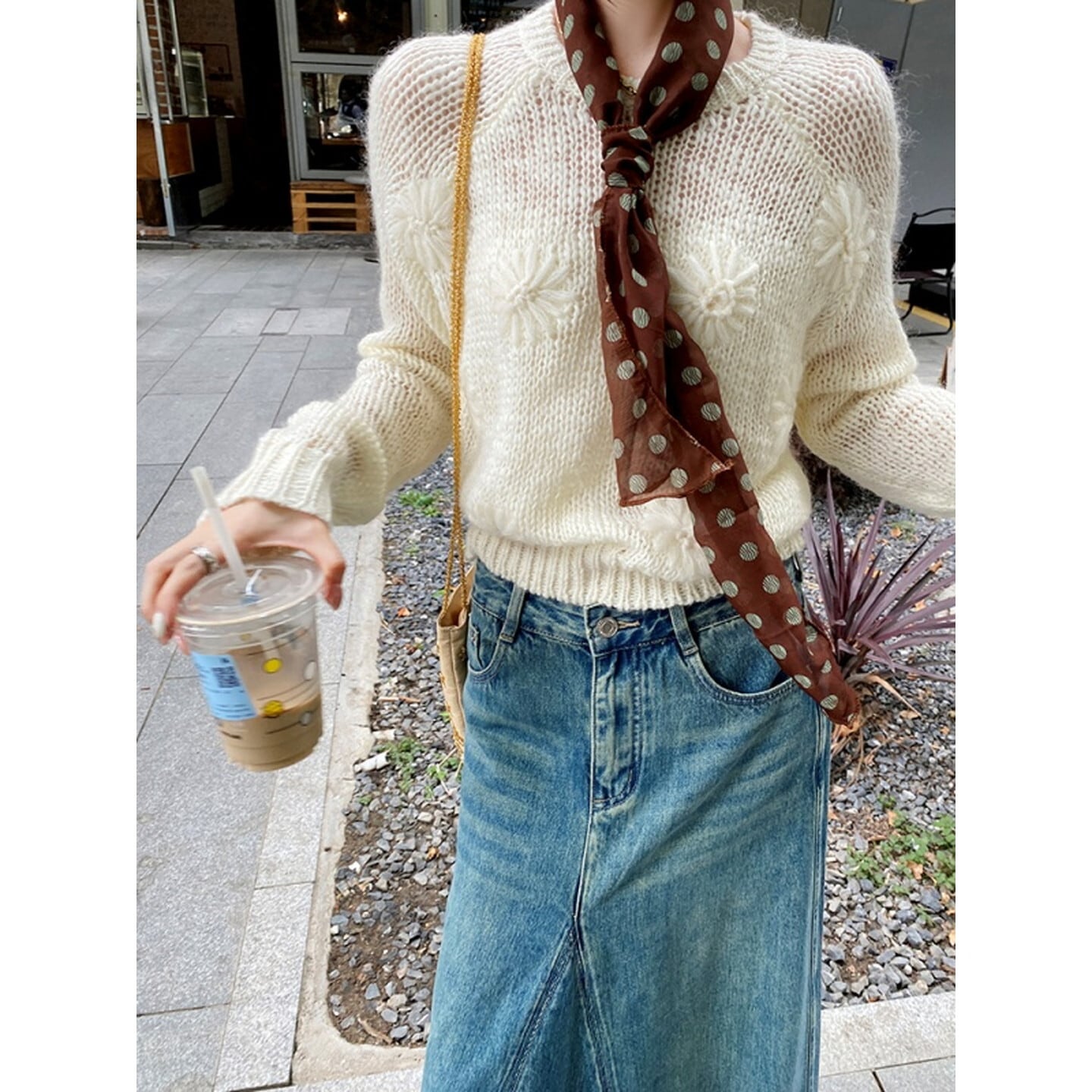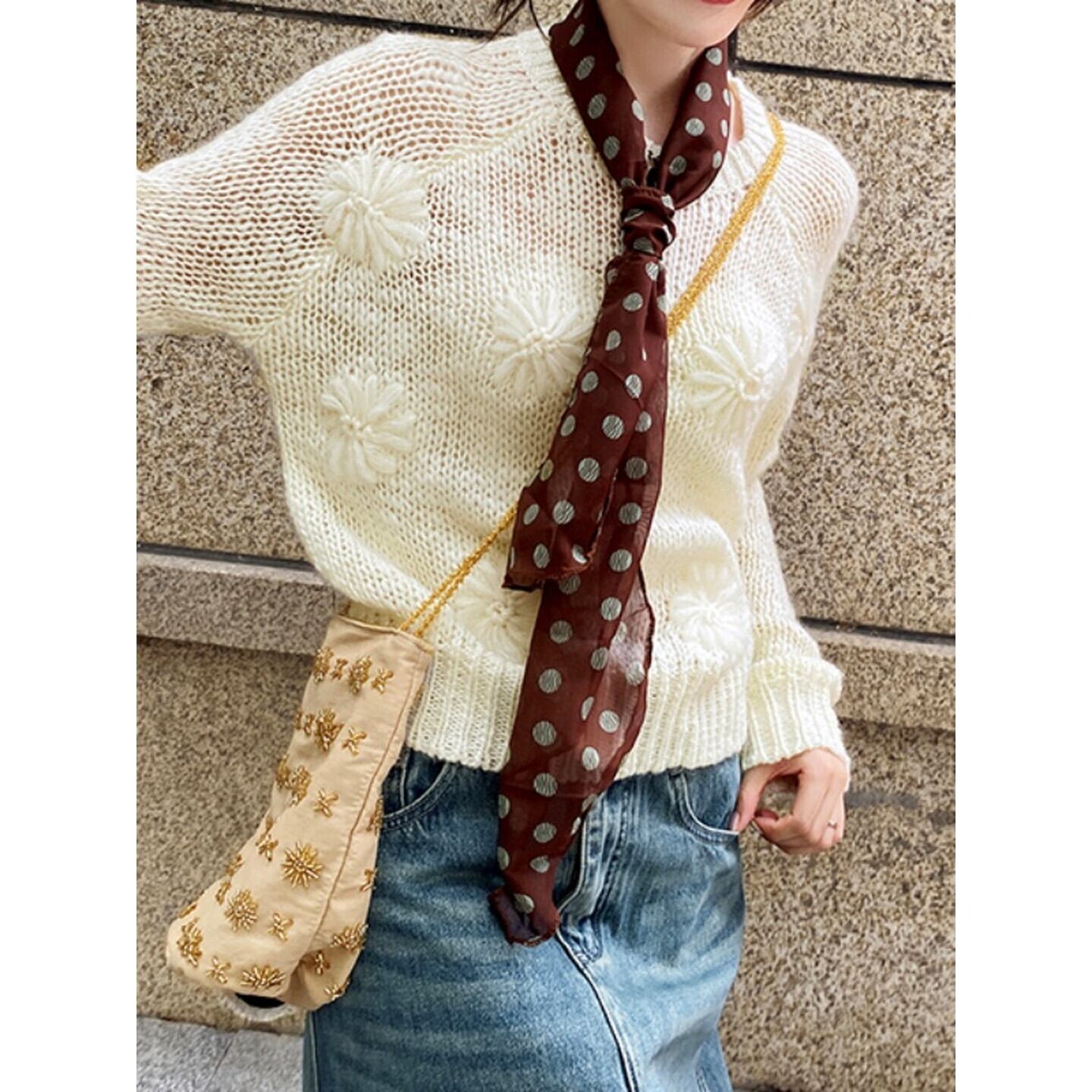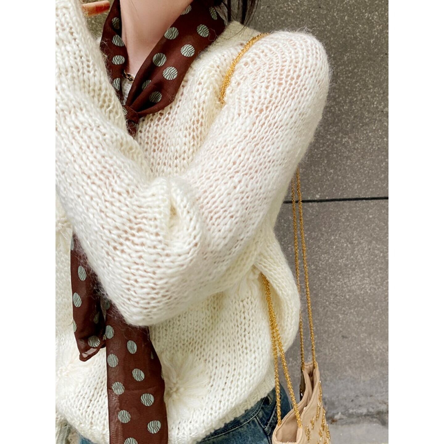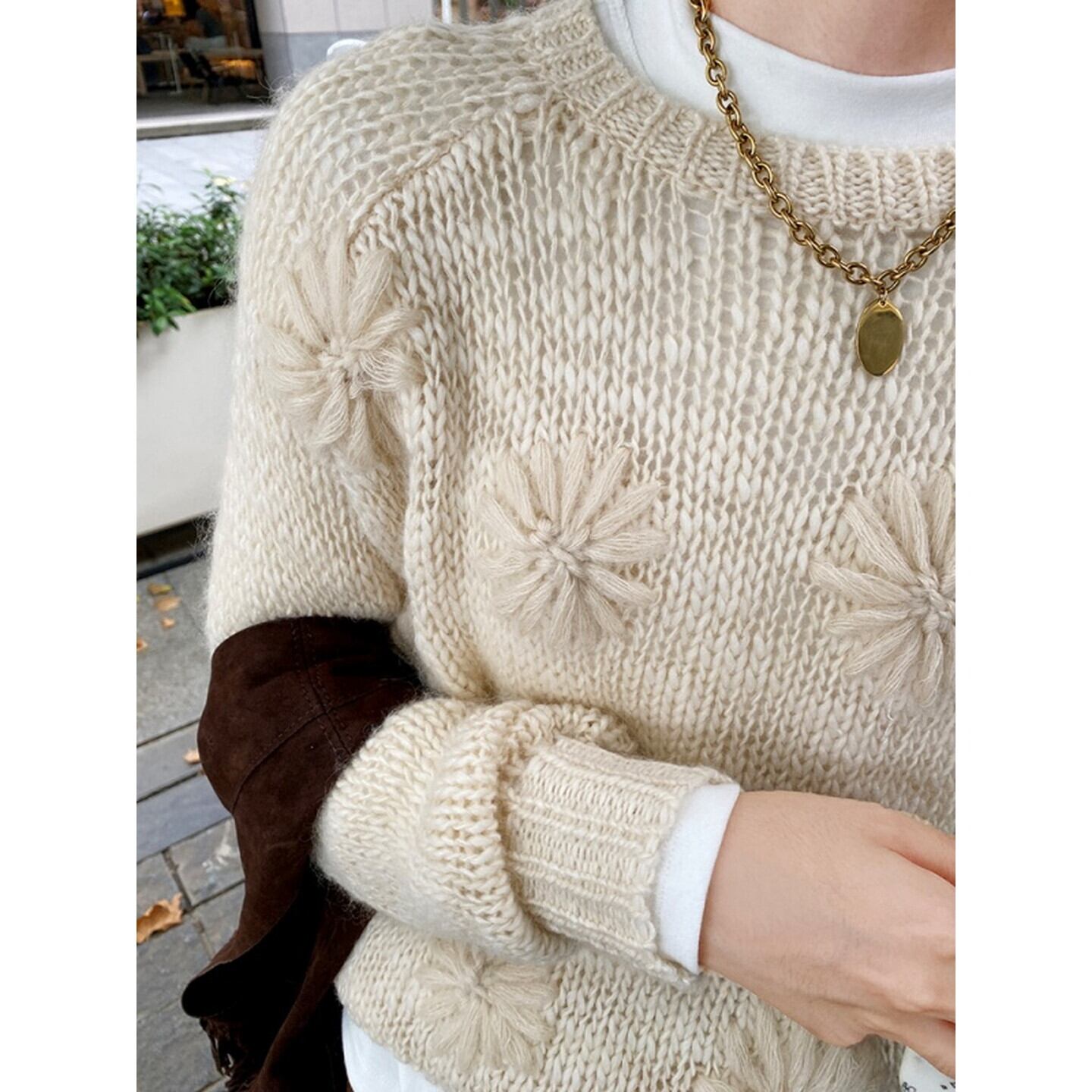 フラワー刺繍風の透かし編みが可憐な印象を添える、大人のためのニットトップス。