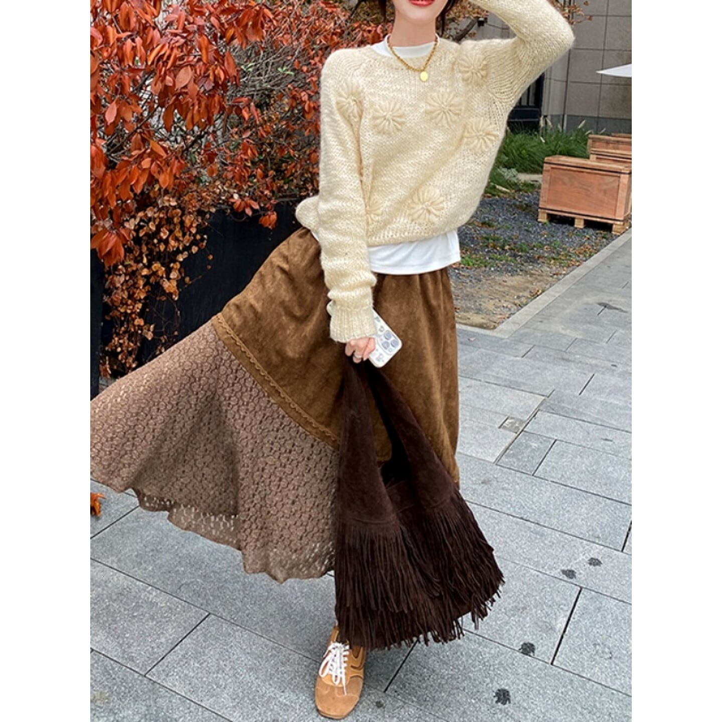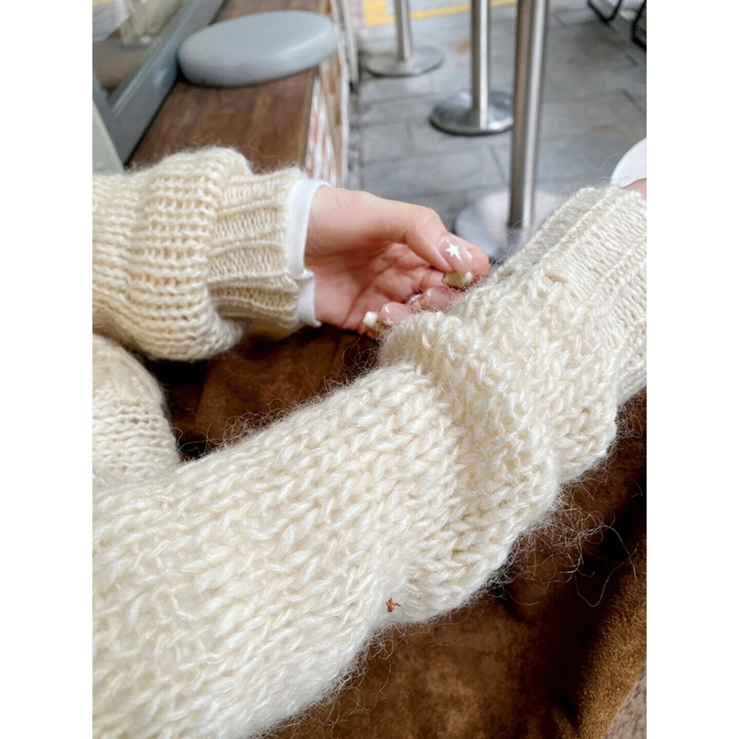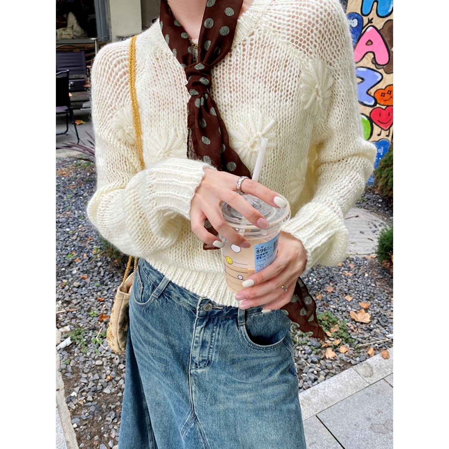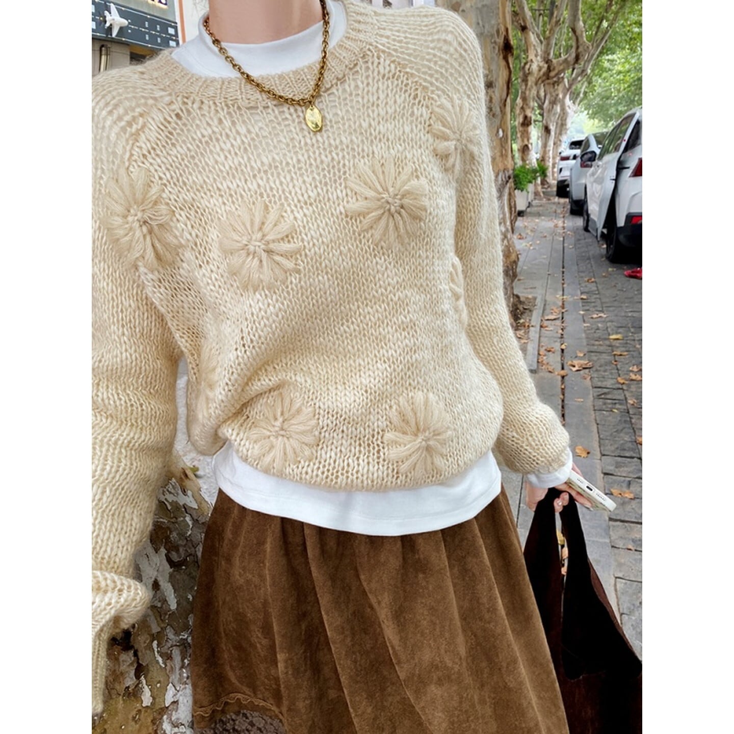 フラワー刺繍風の透かし編みが可憐な印象を添える、大人のためのニットトップス。
