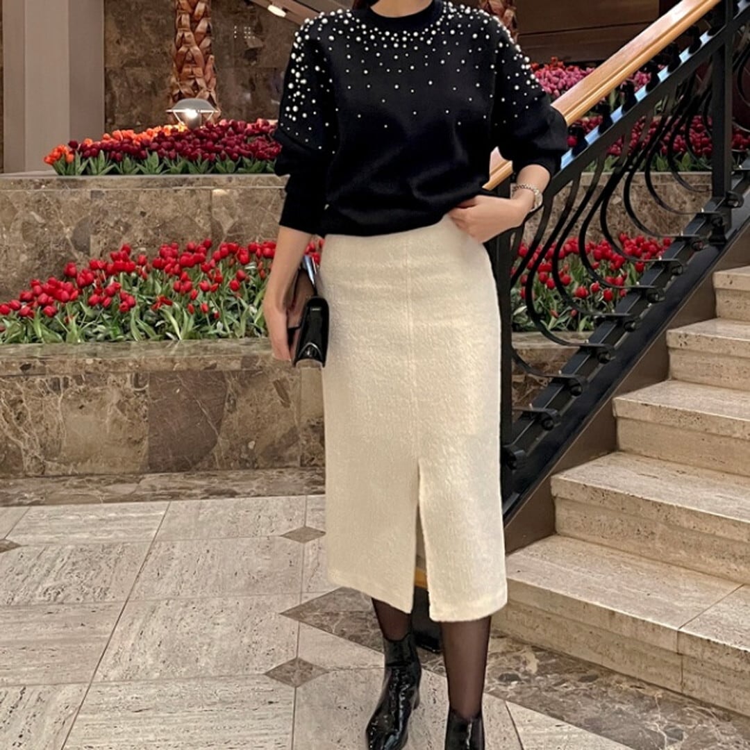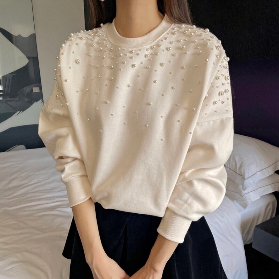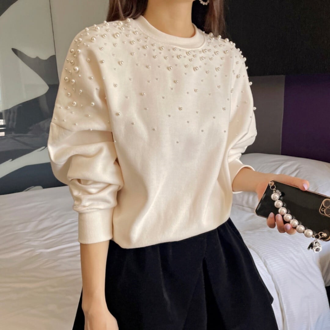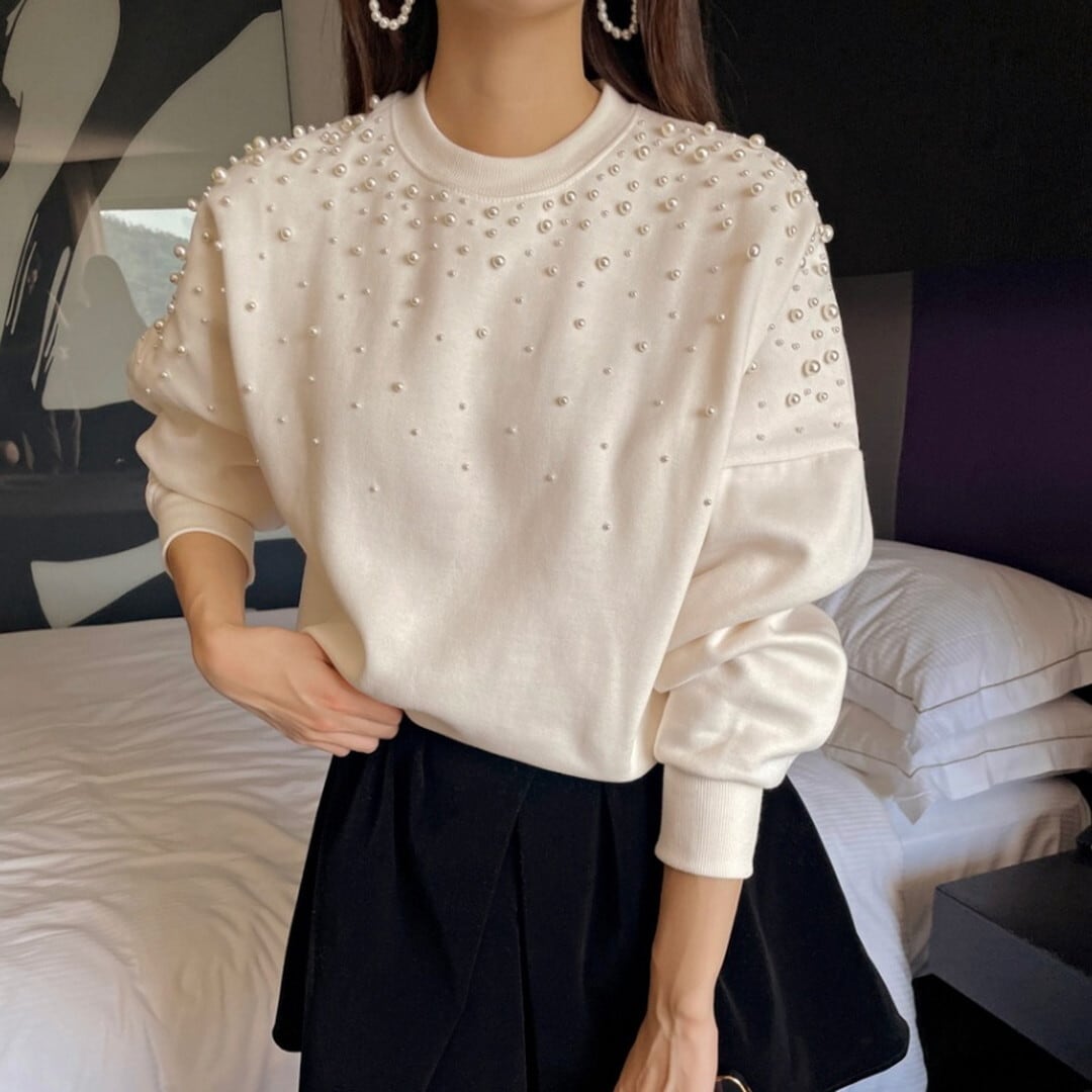 ビーズのさりげない輝きが華やかさを添える、大人のデコレーションスウェット。