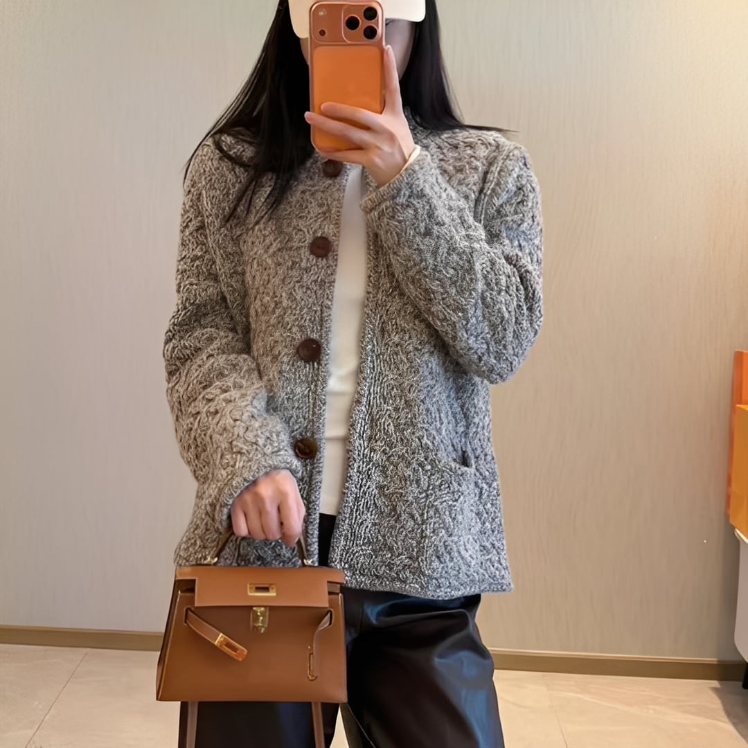 上品なヘリンボーン風編地が大人の雰囲気を漂わせる、ニットカーディガン。