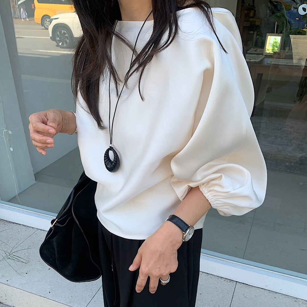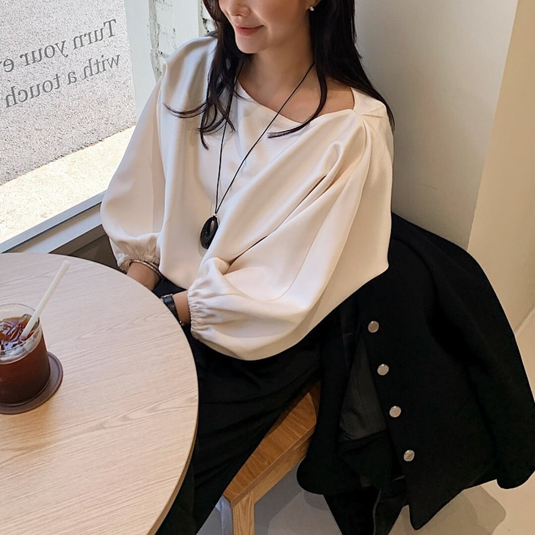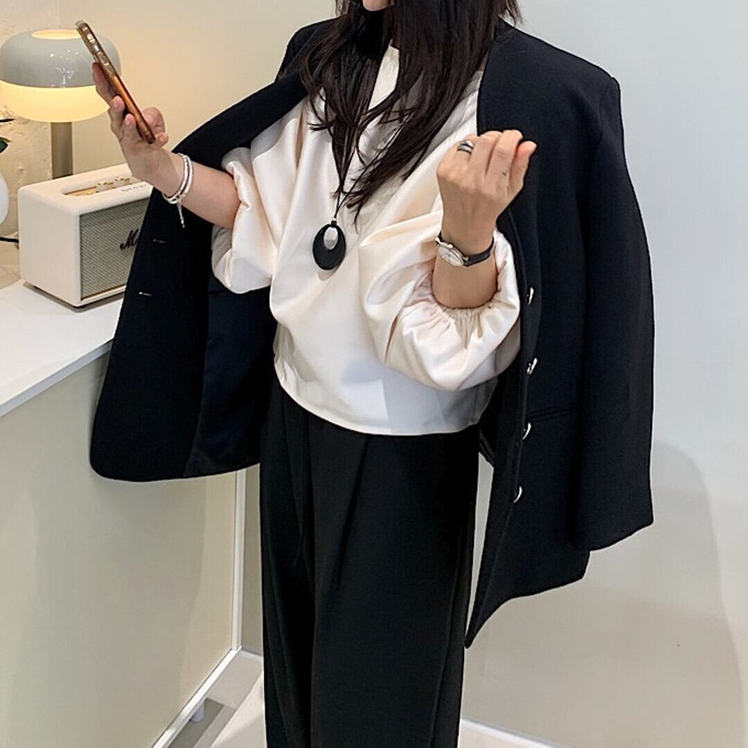 すっきりとしたノーカラーにパフスリーブを合わせた、大人フェミニンなシャツ。