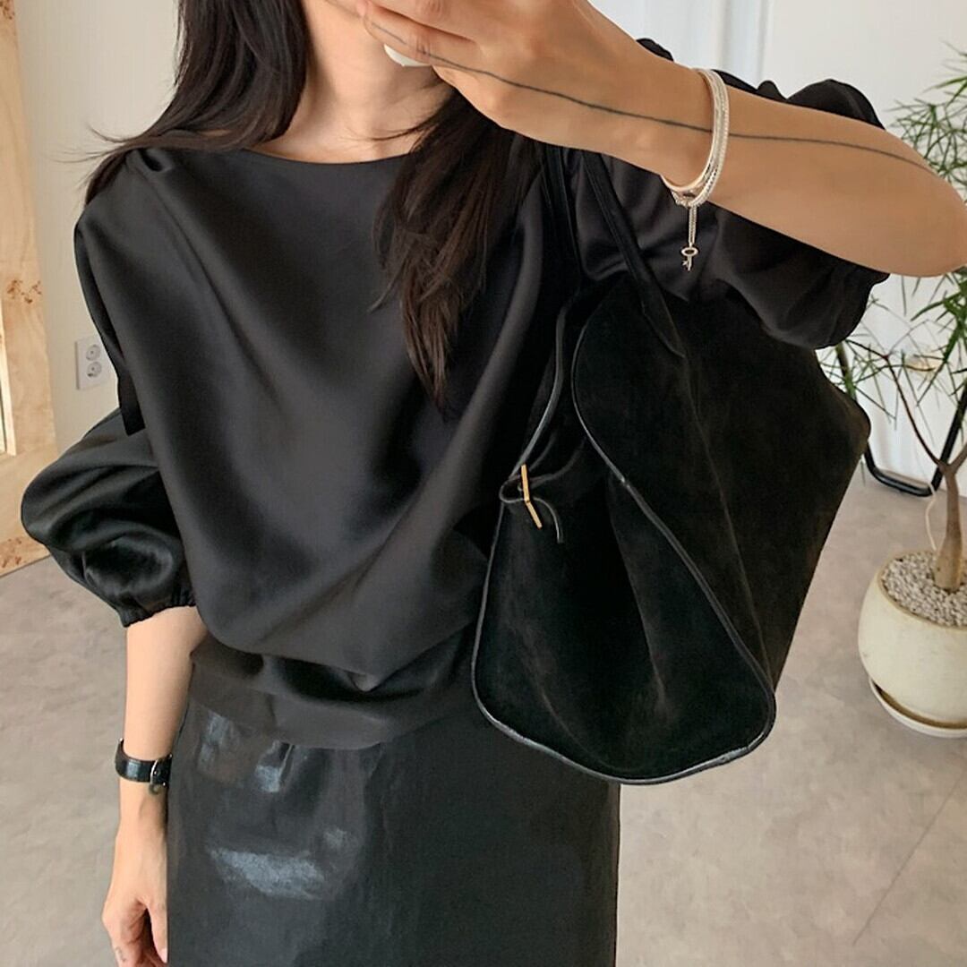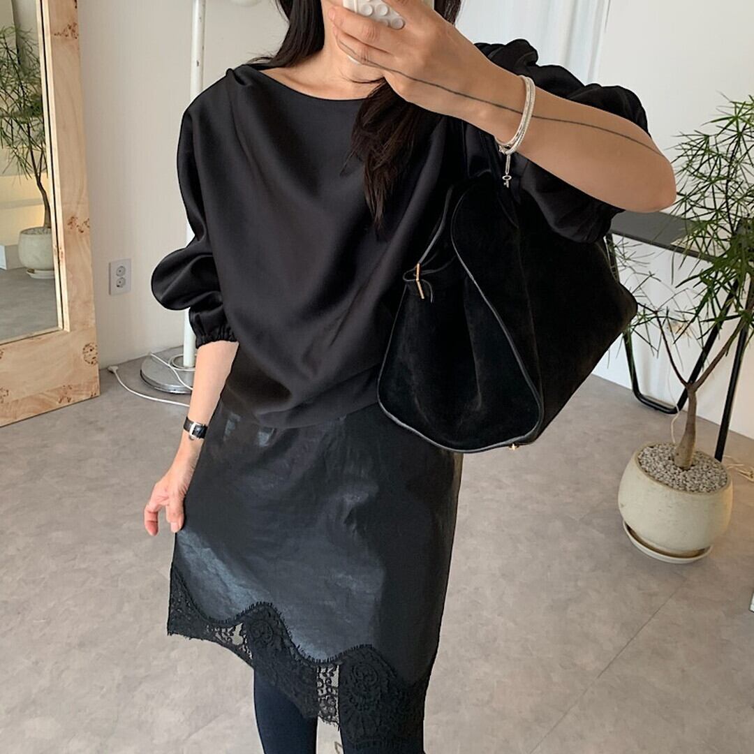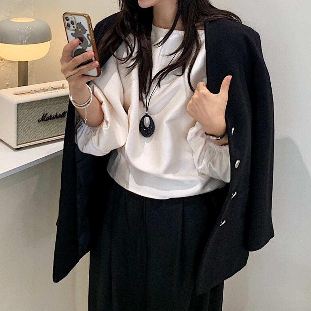すっきりとしたノーカラーにパフスリーブを合わせた、大人フェミニンなシャツ。