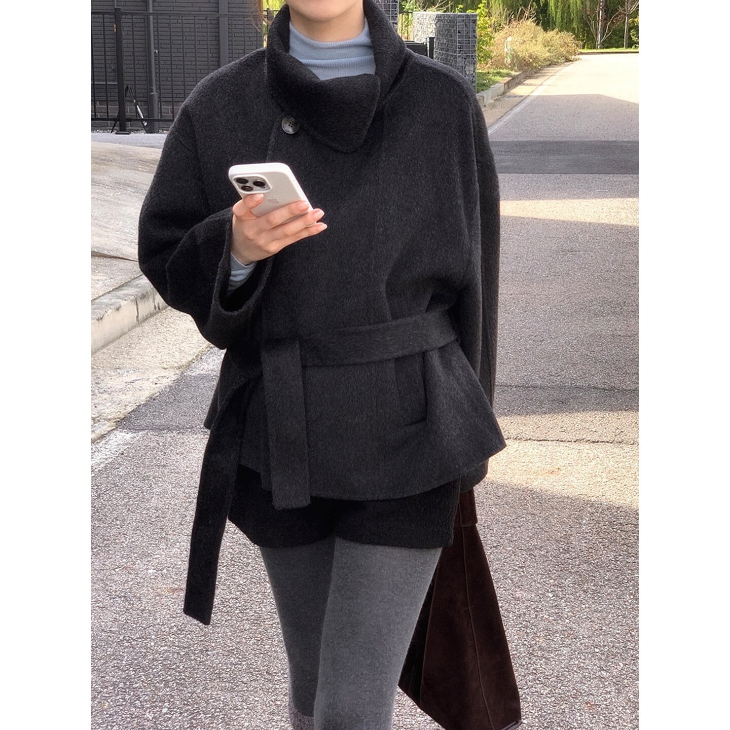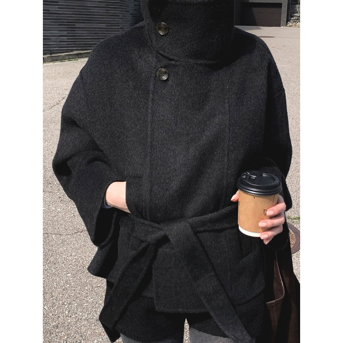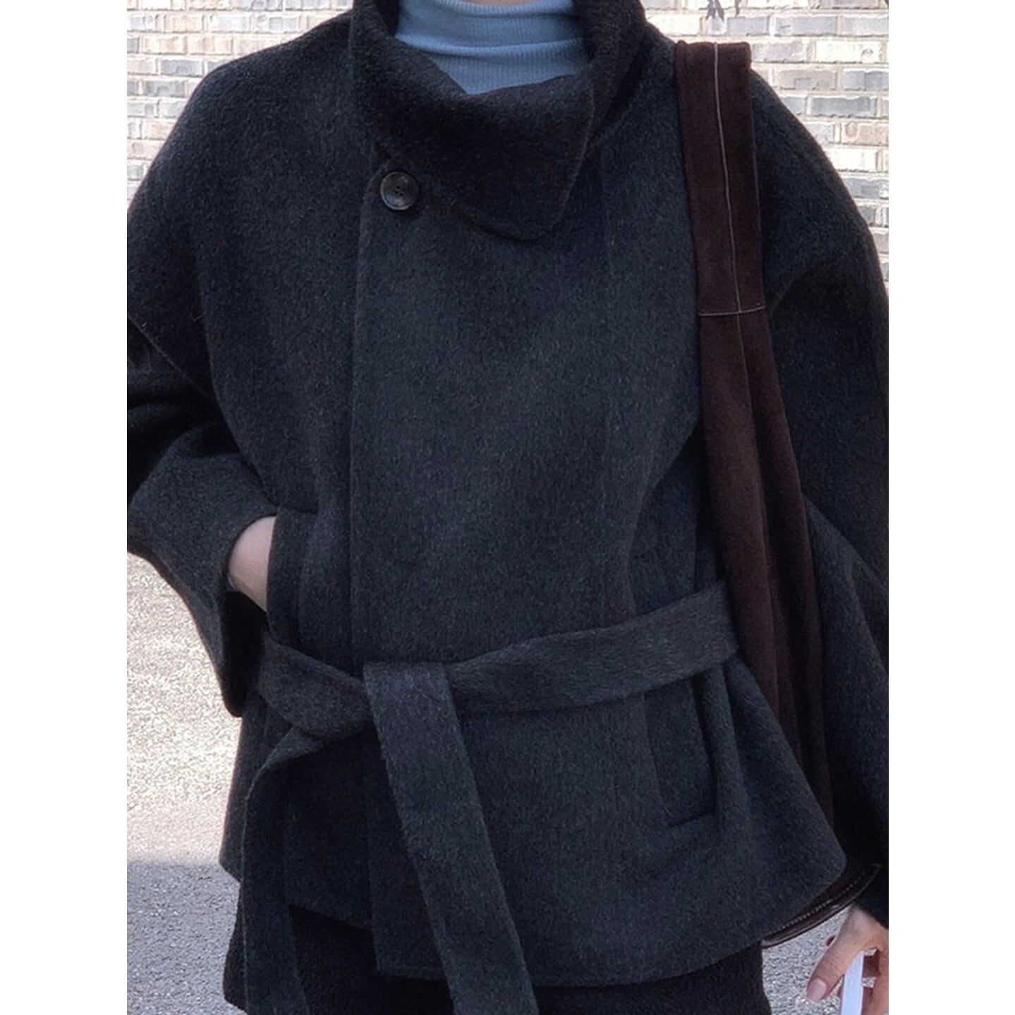 無駄のないシルエットとスタンドカラーが洗練された印象を与える、モダンなロングコート。