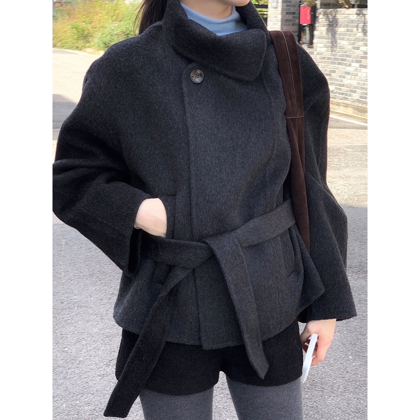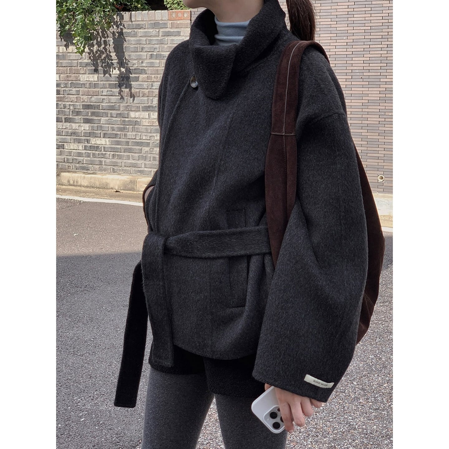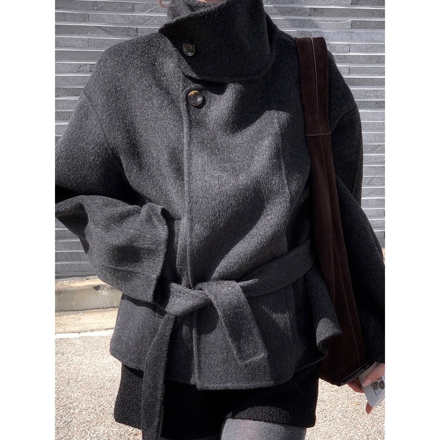 無駄のないシルエットとスタンドカラーが洗練された印象を与える、モダンなロングコート。