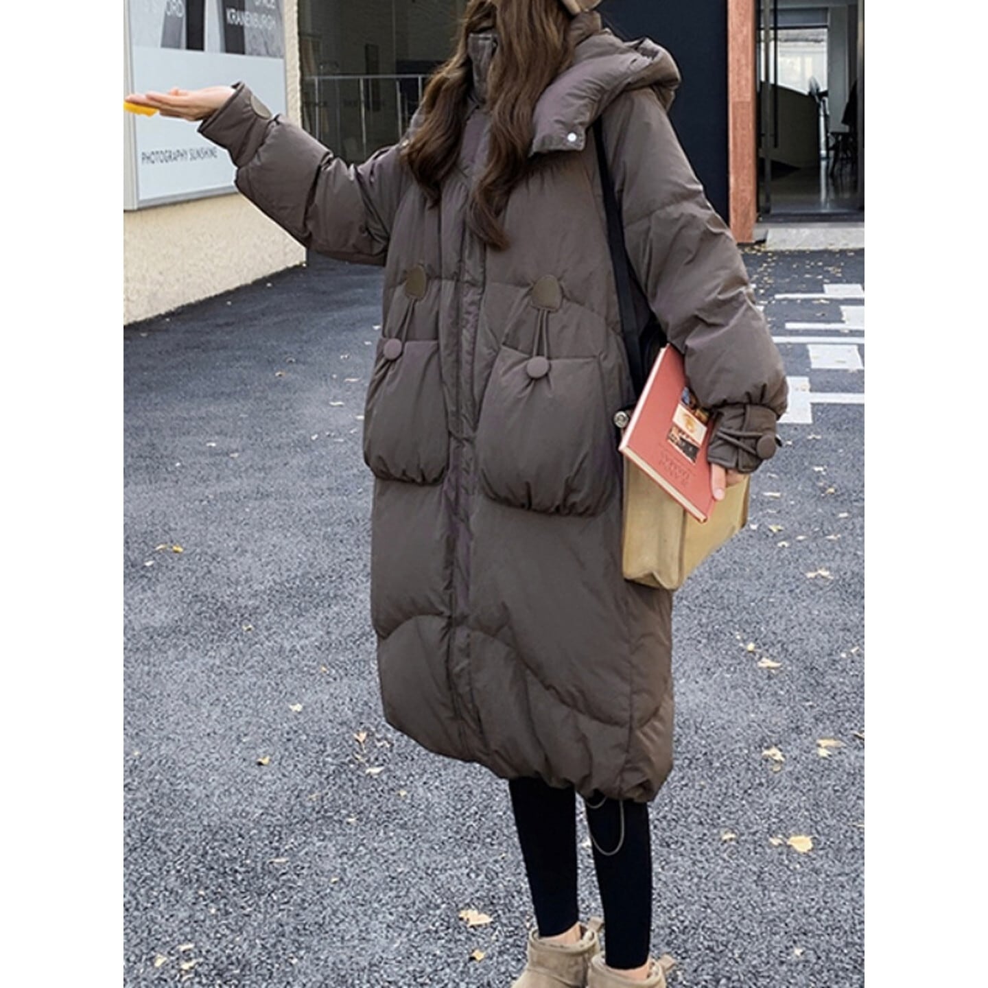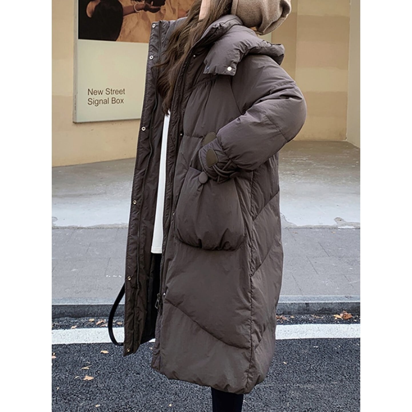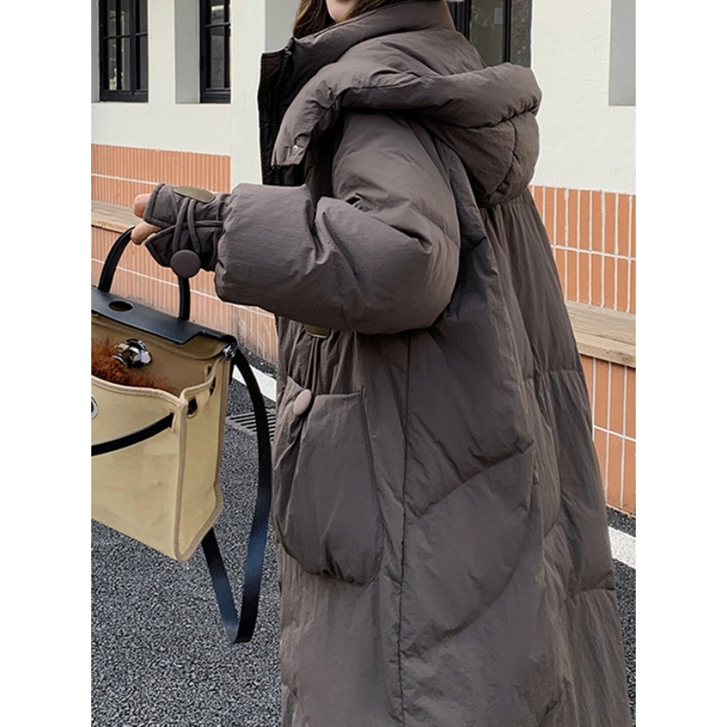 ふんわりとしたボリューム感が目を惹く、大人のフード付きダウンコート。