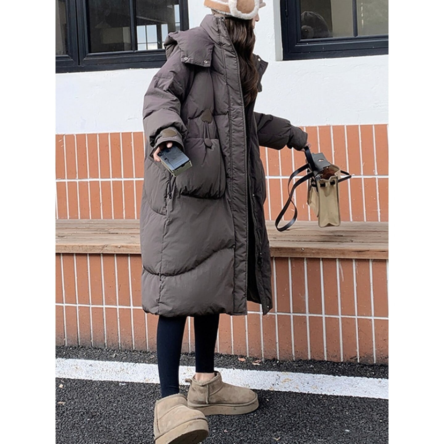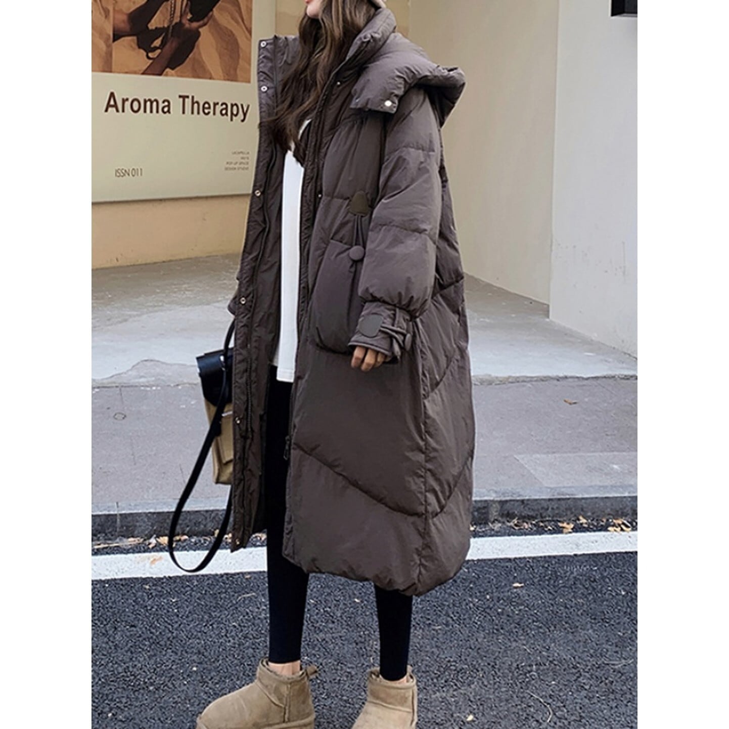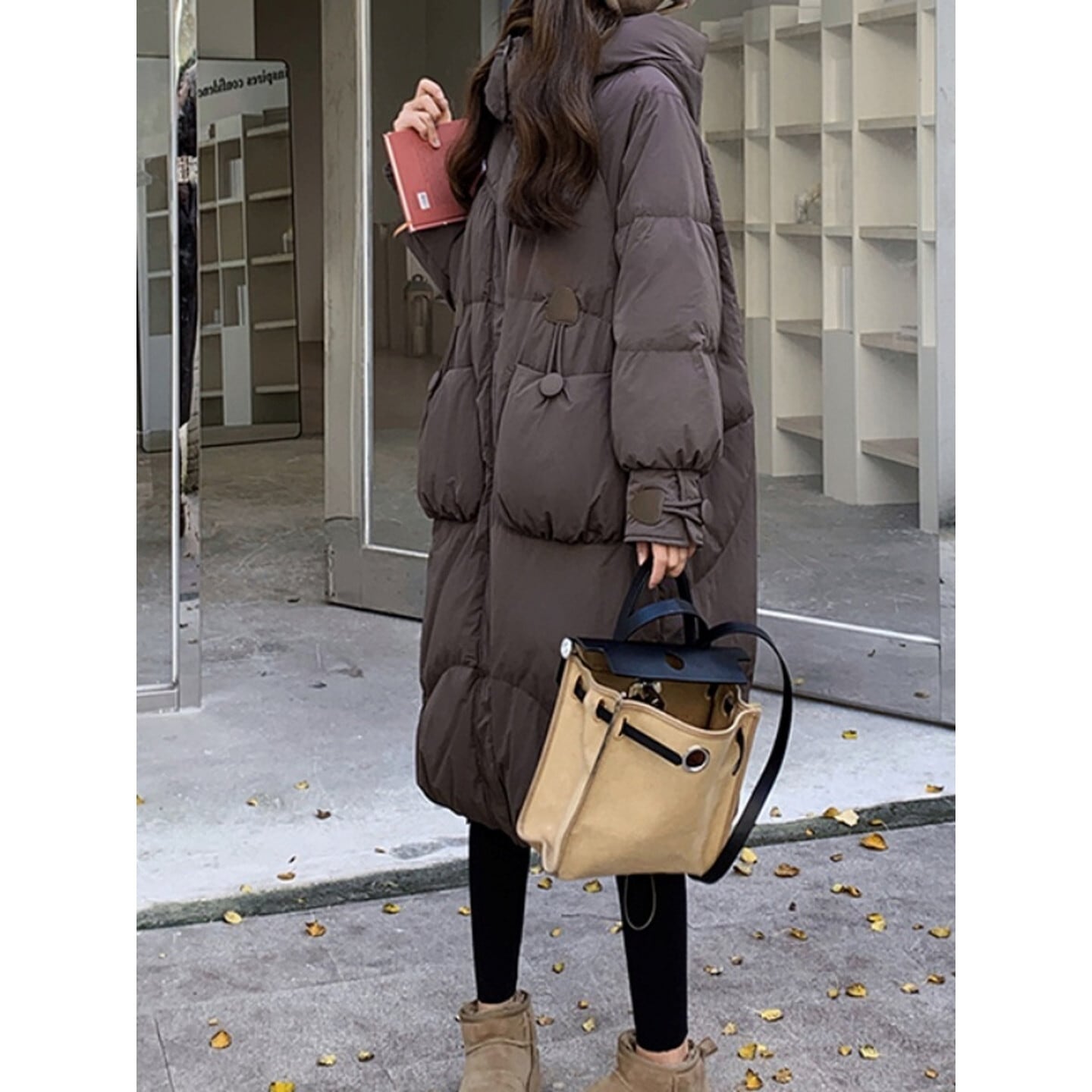 ふんわりとしたボリューム感が目を惹く、大人のフード付きダウンコート。