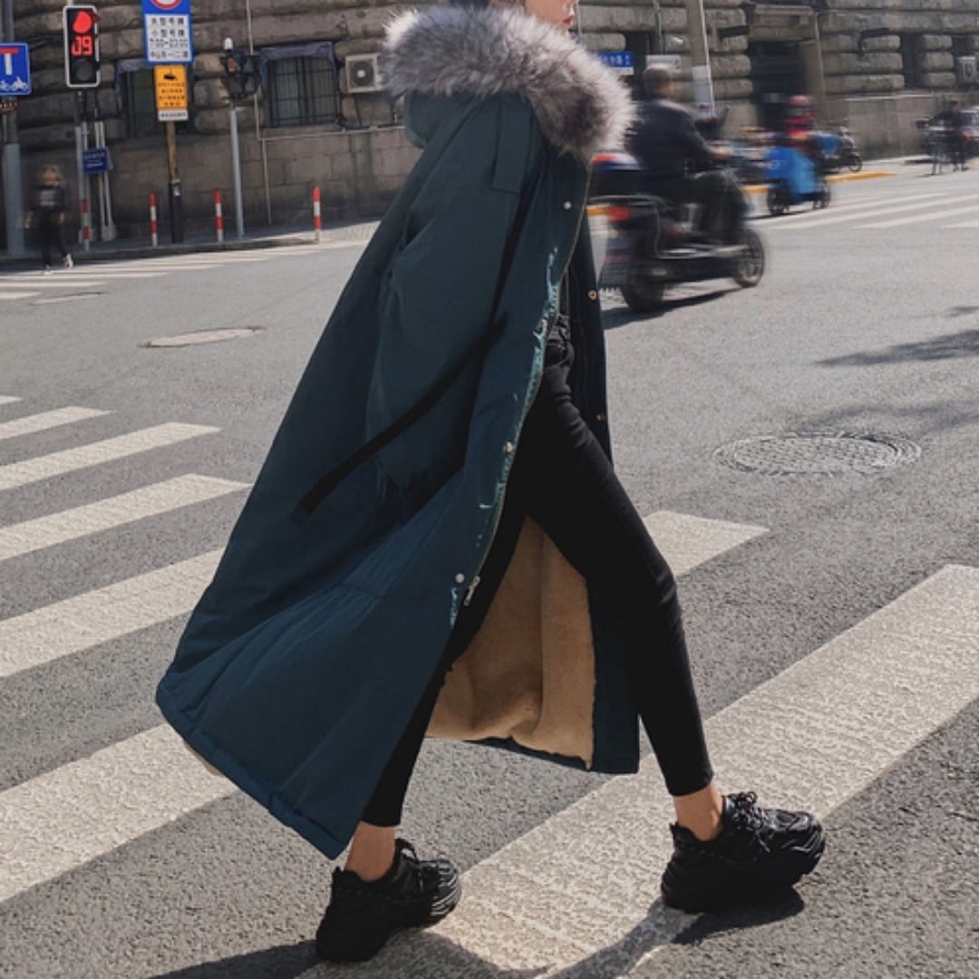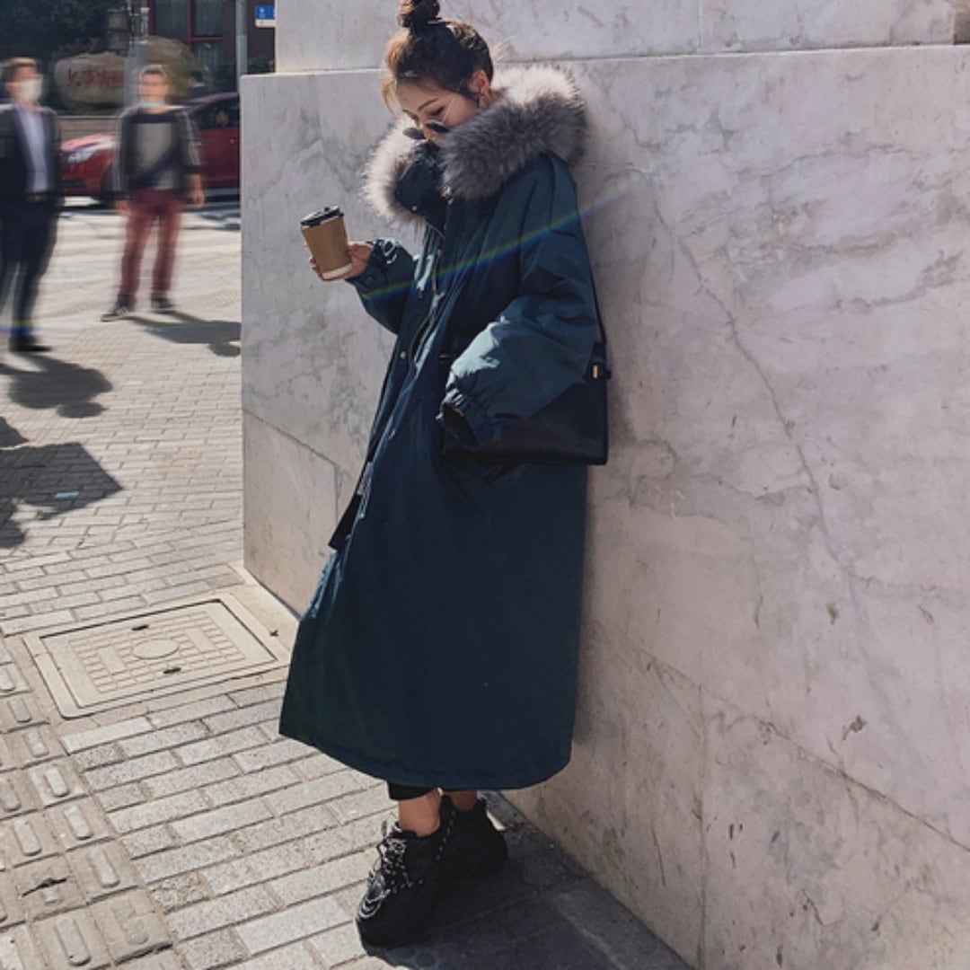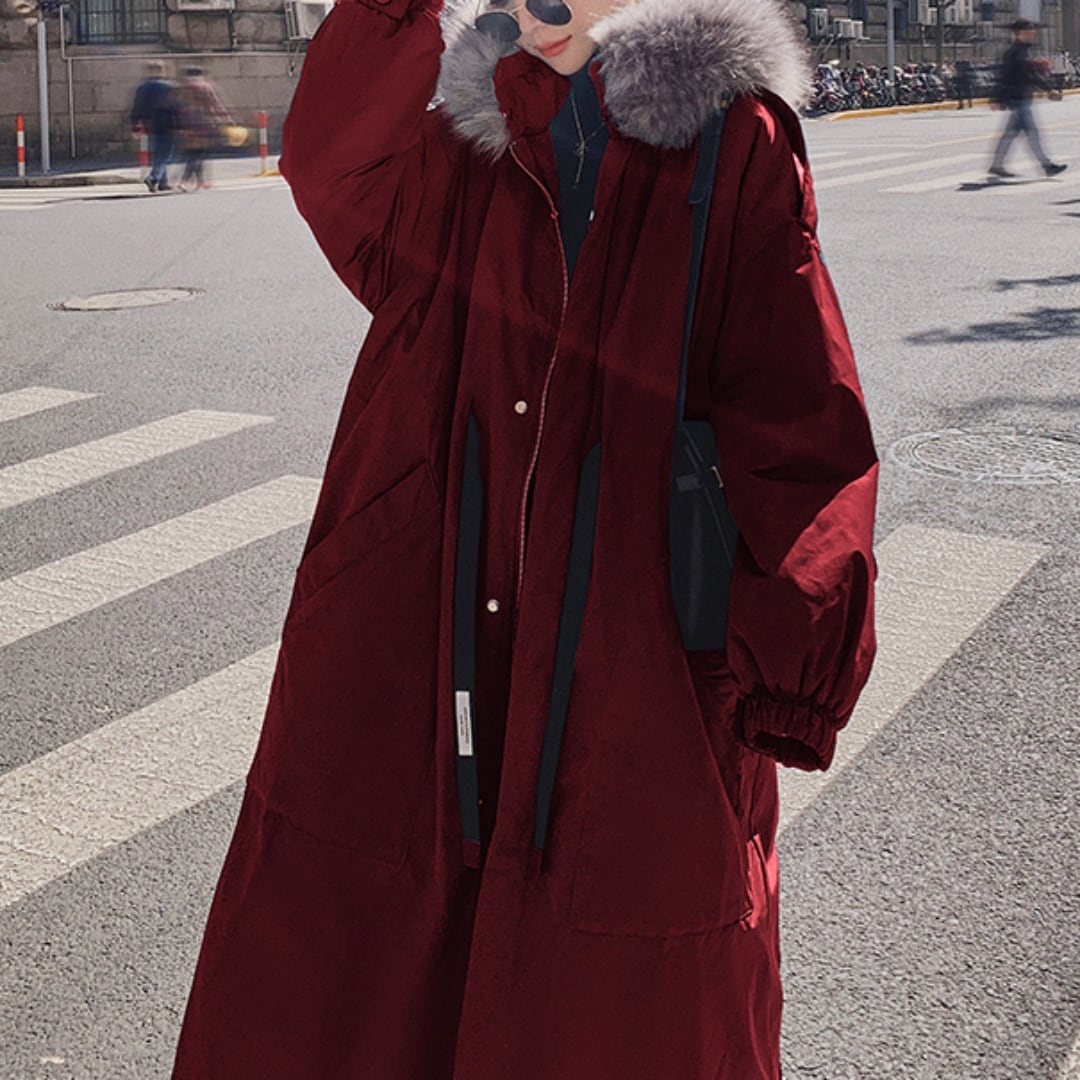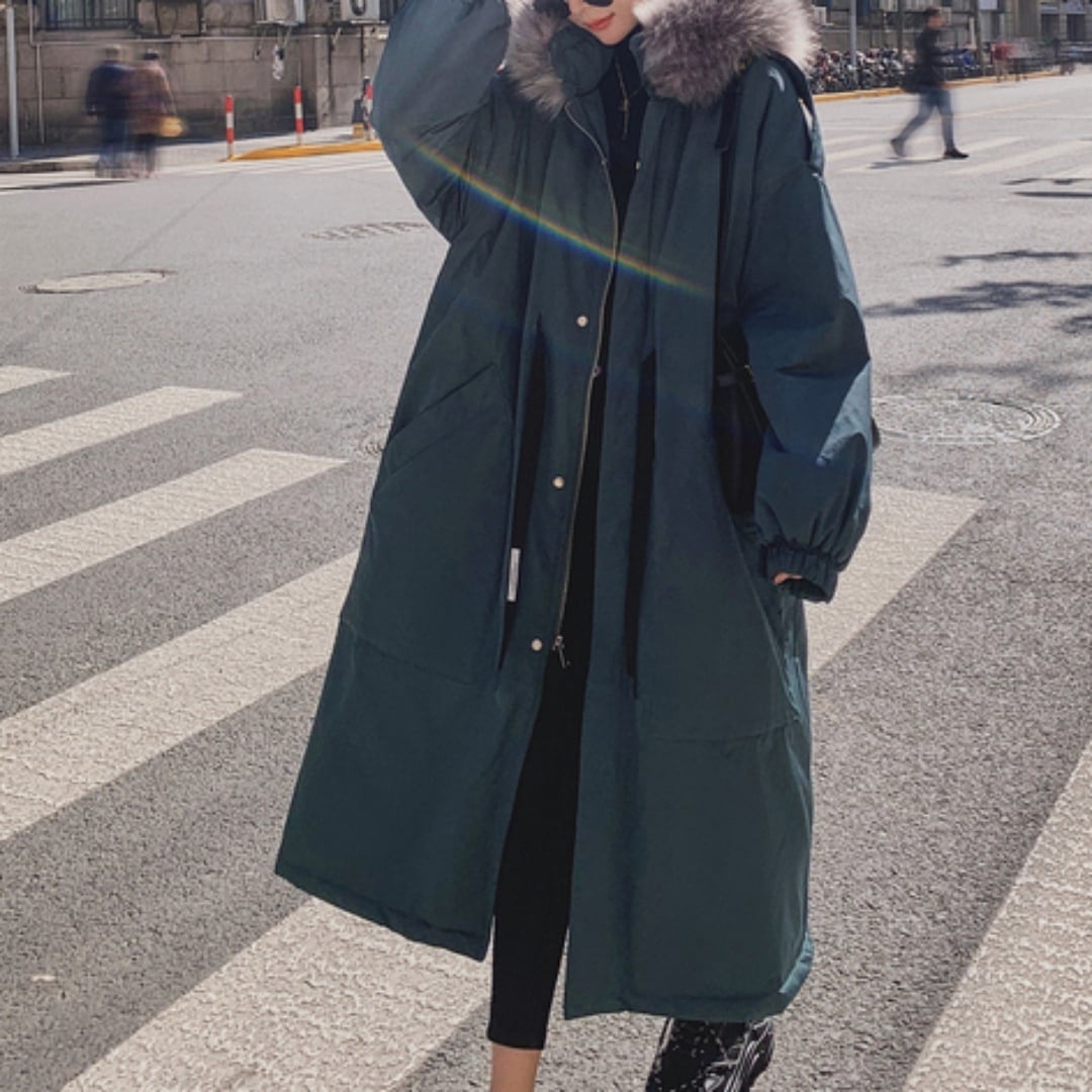 フードに付いているエコファーで小顔効果、ロング丈で細見え効果が叶います。