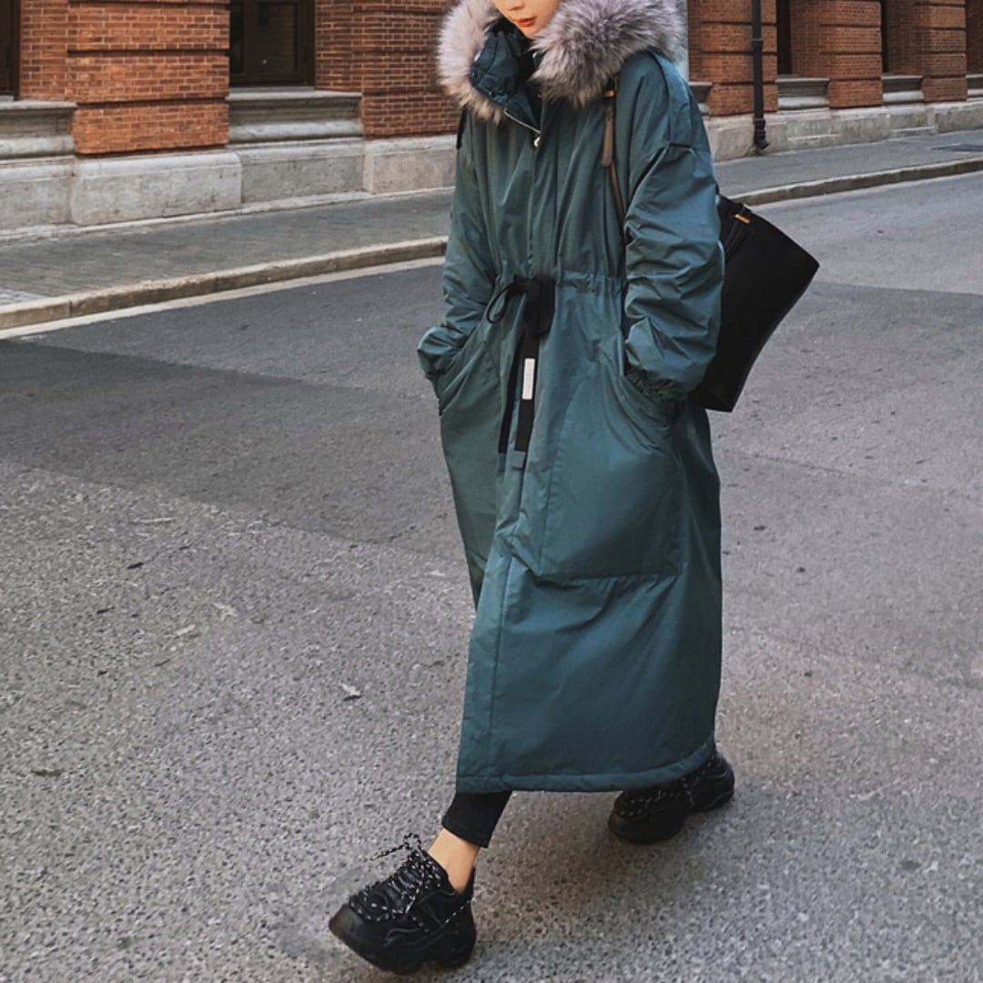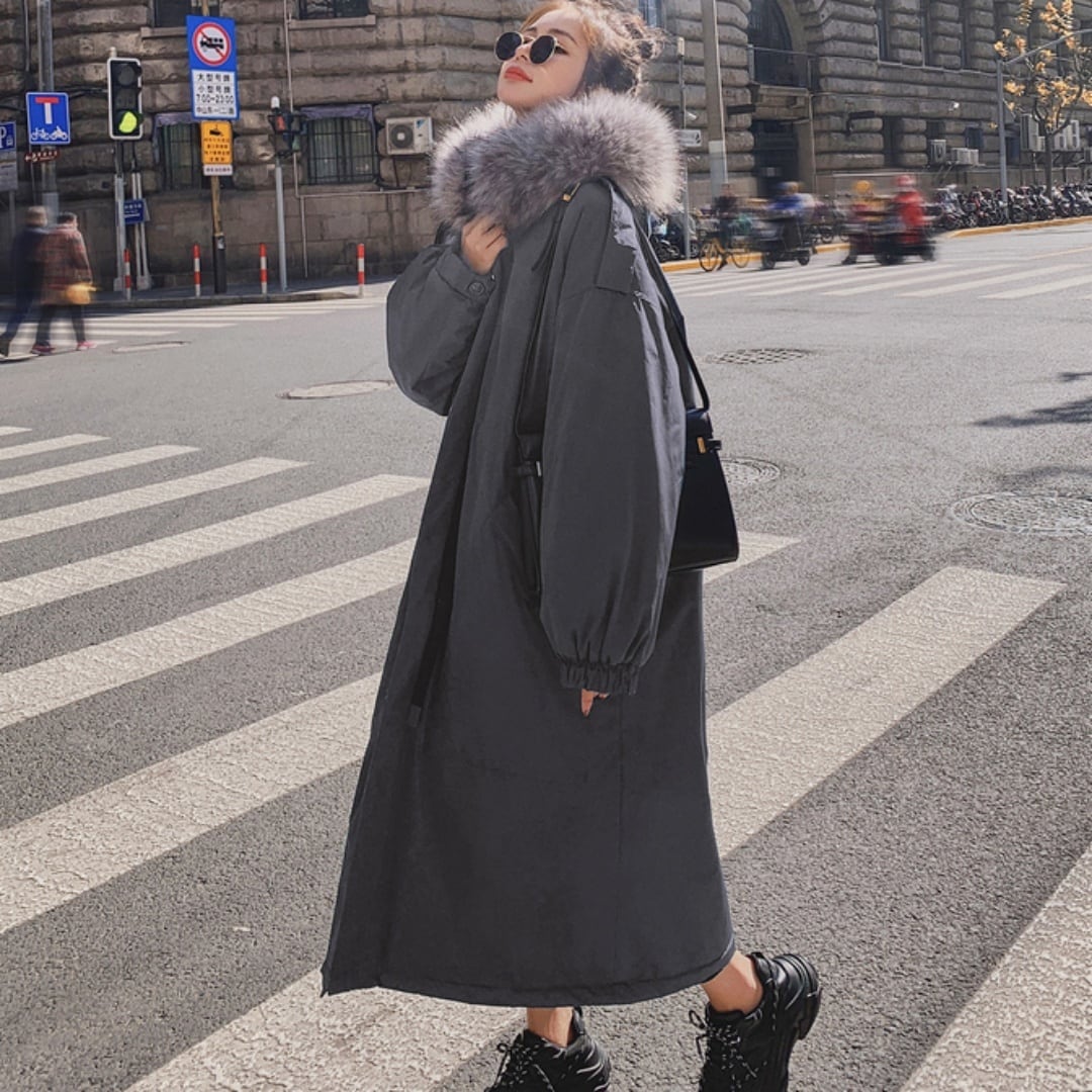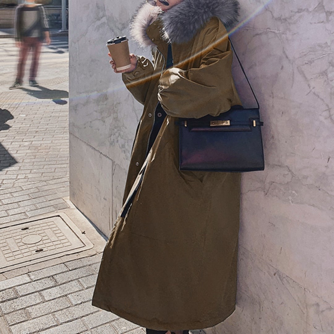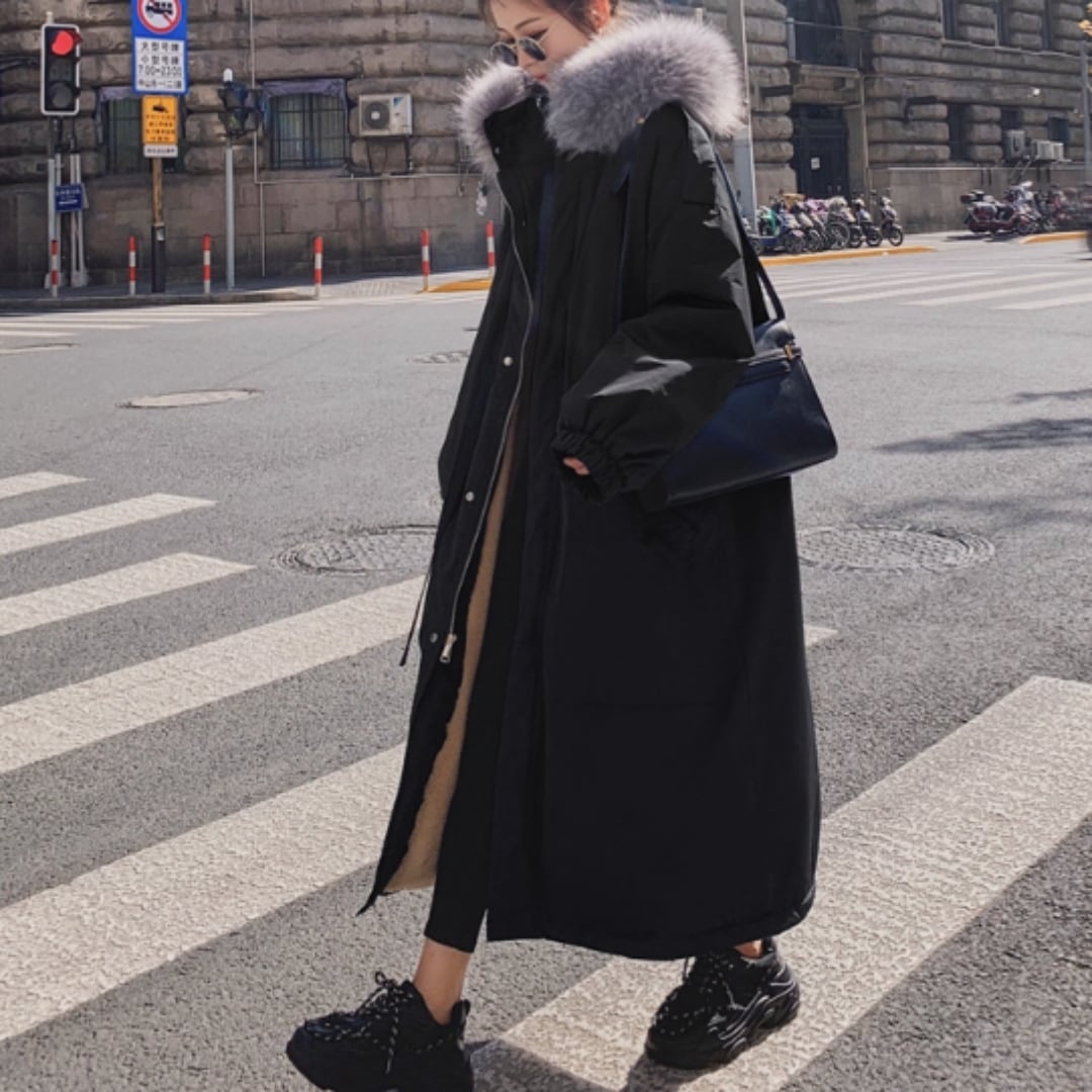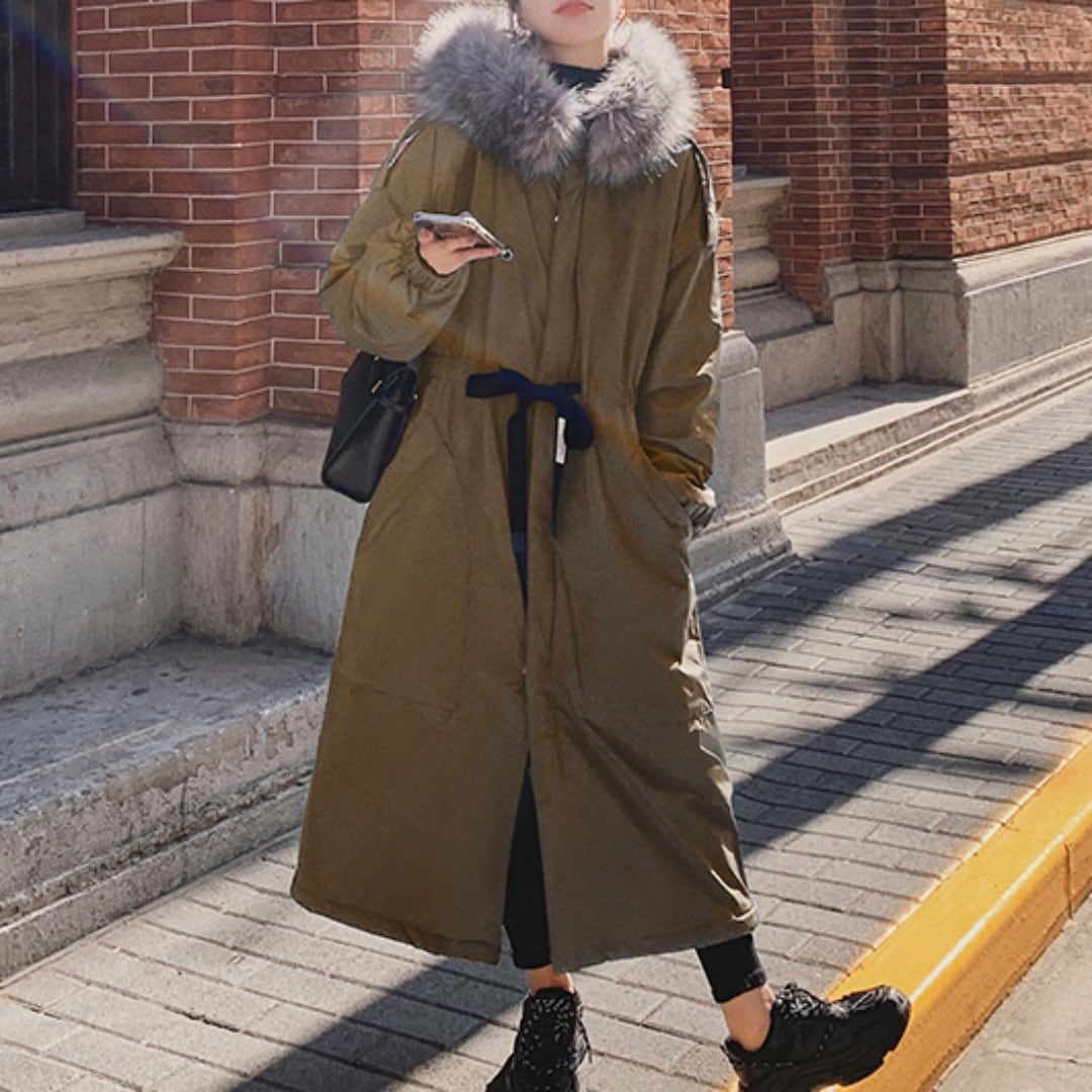 フードに付いているエコファーで小顔効果、ロング丈で細見え効果が叶います。
