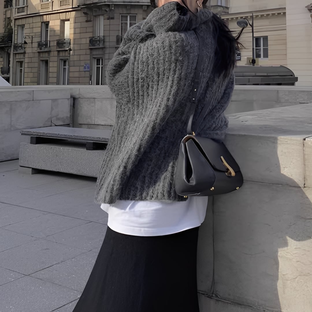 肩の力を抜いて着られる、ゆったりシルエットのドロップショルダーニット。