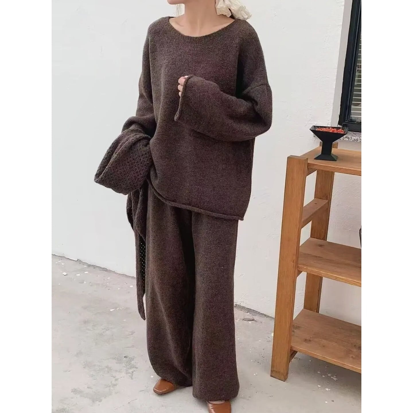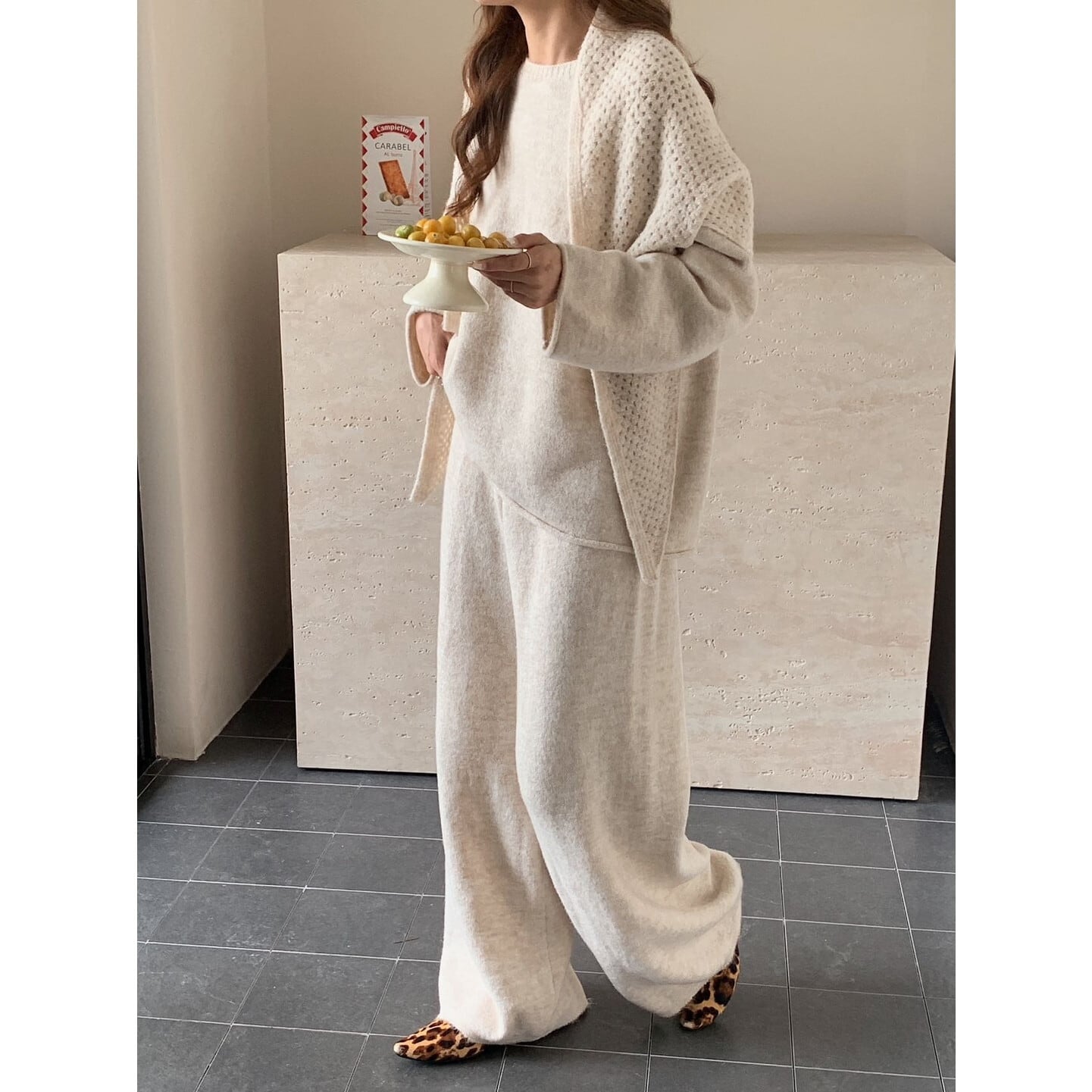 シンプルなデザインで着回し力抜群の、ニットセットアップ。
