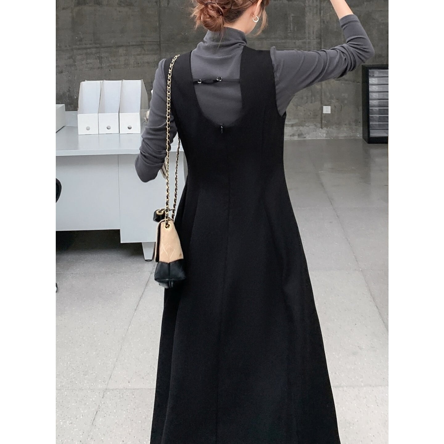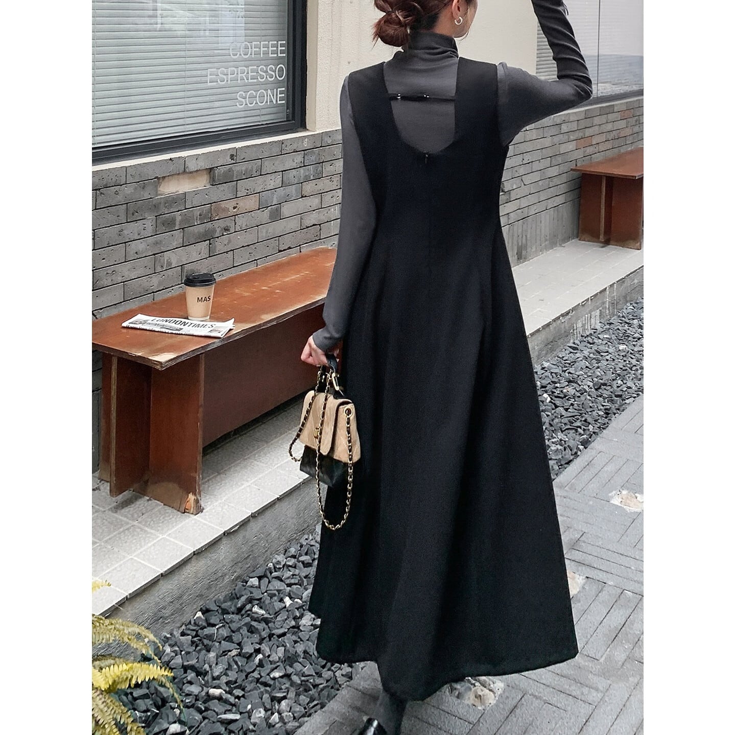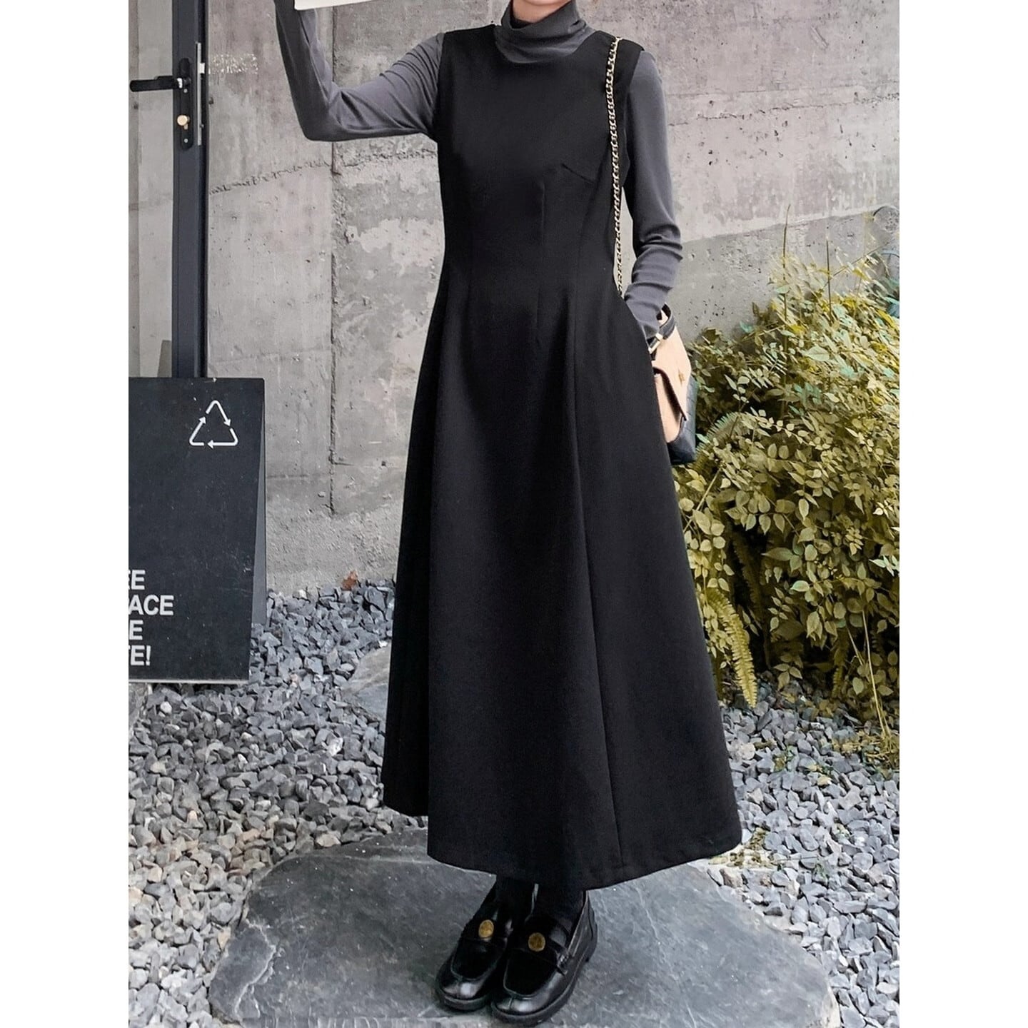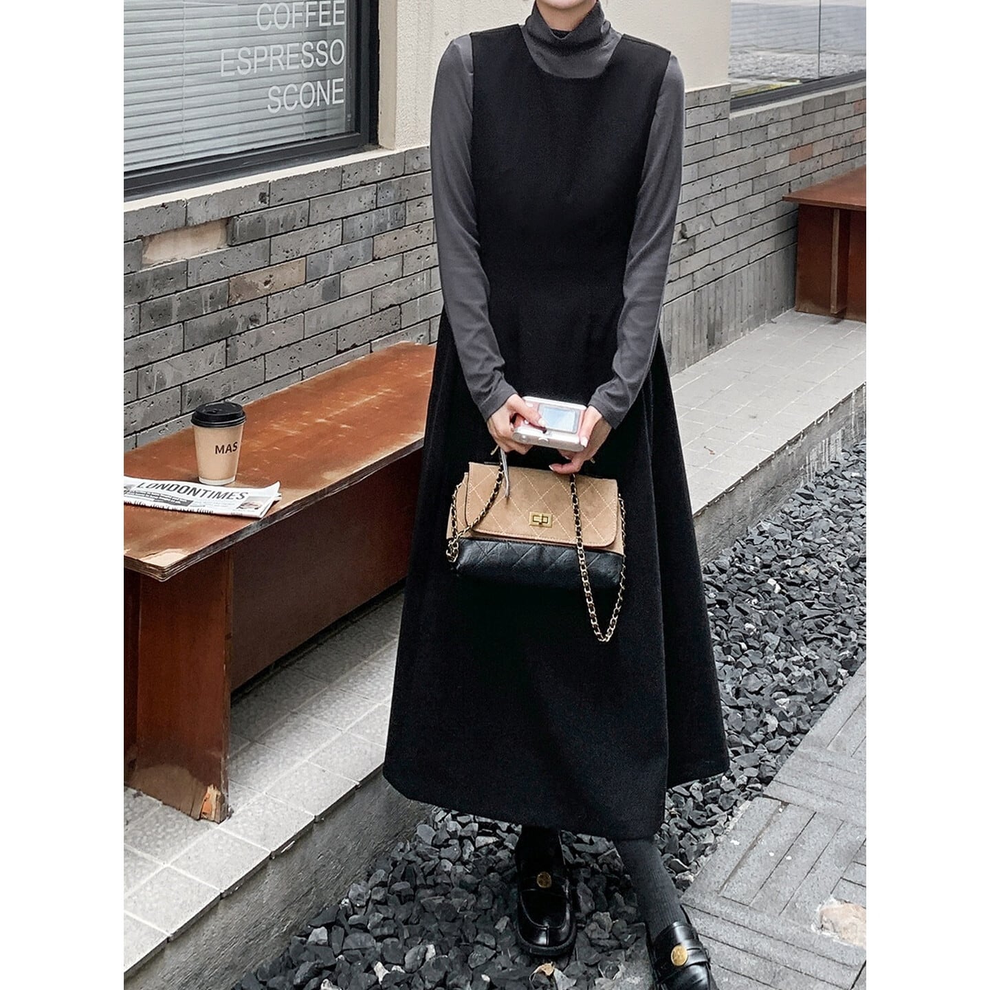 Aラインシルエットが大人可愛い、ジャンパースカートとハイネックインナーのセット。