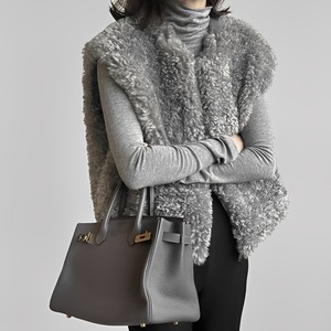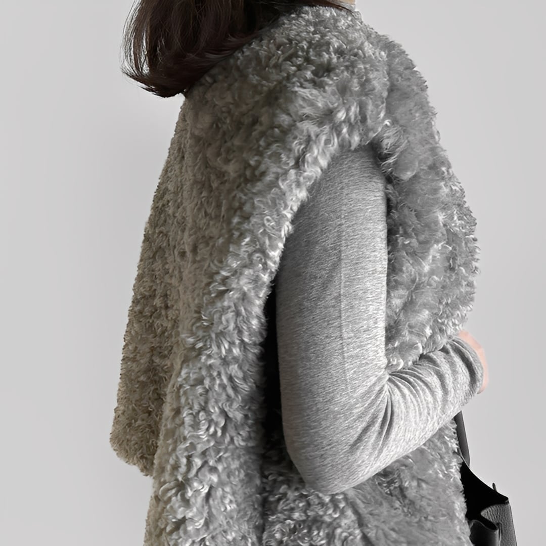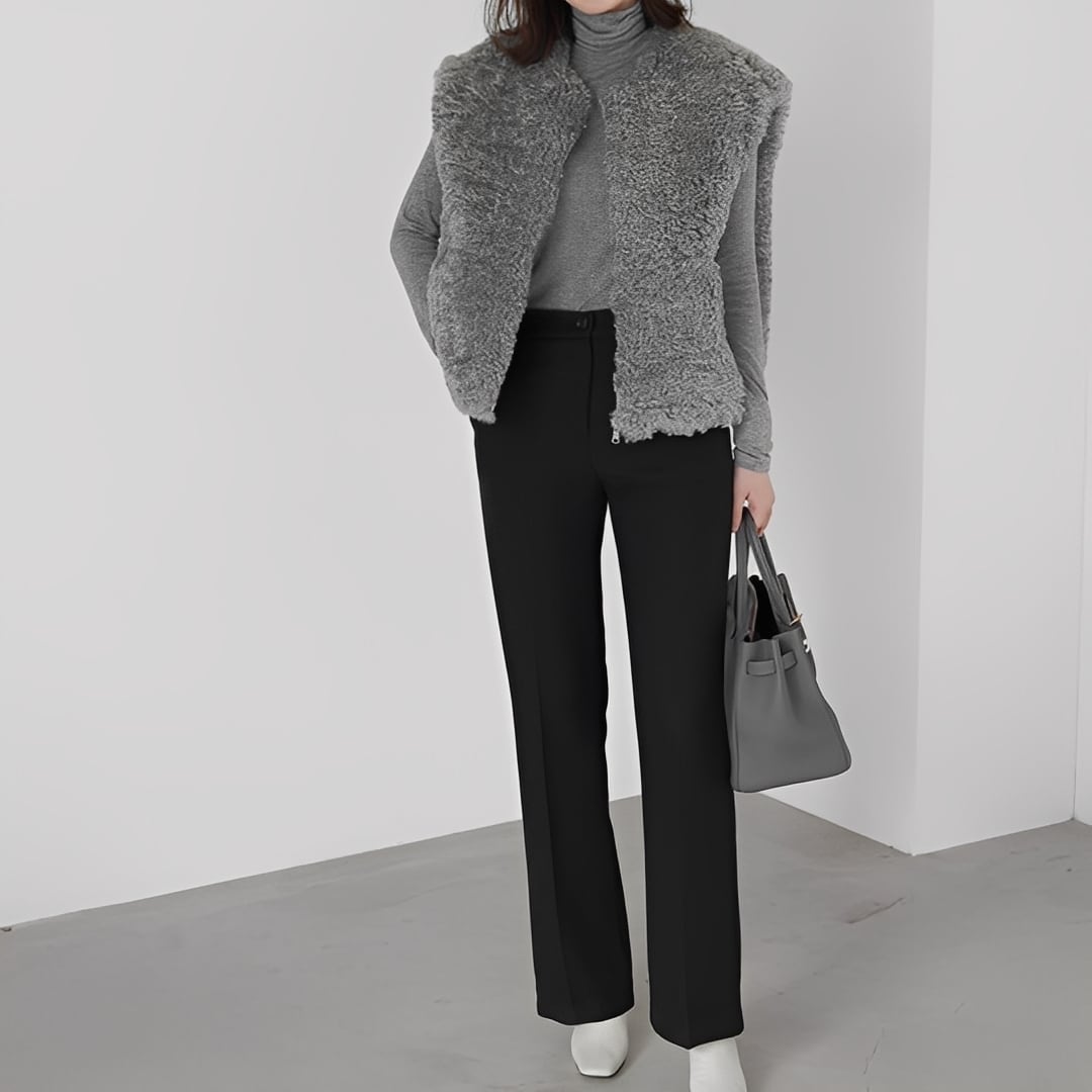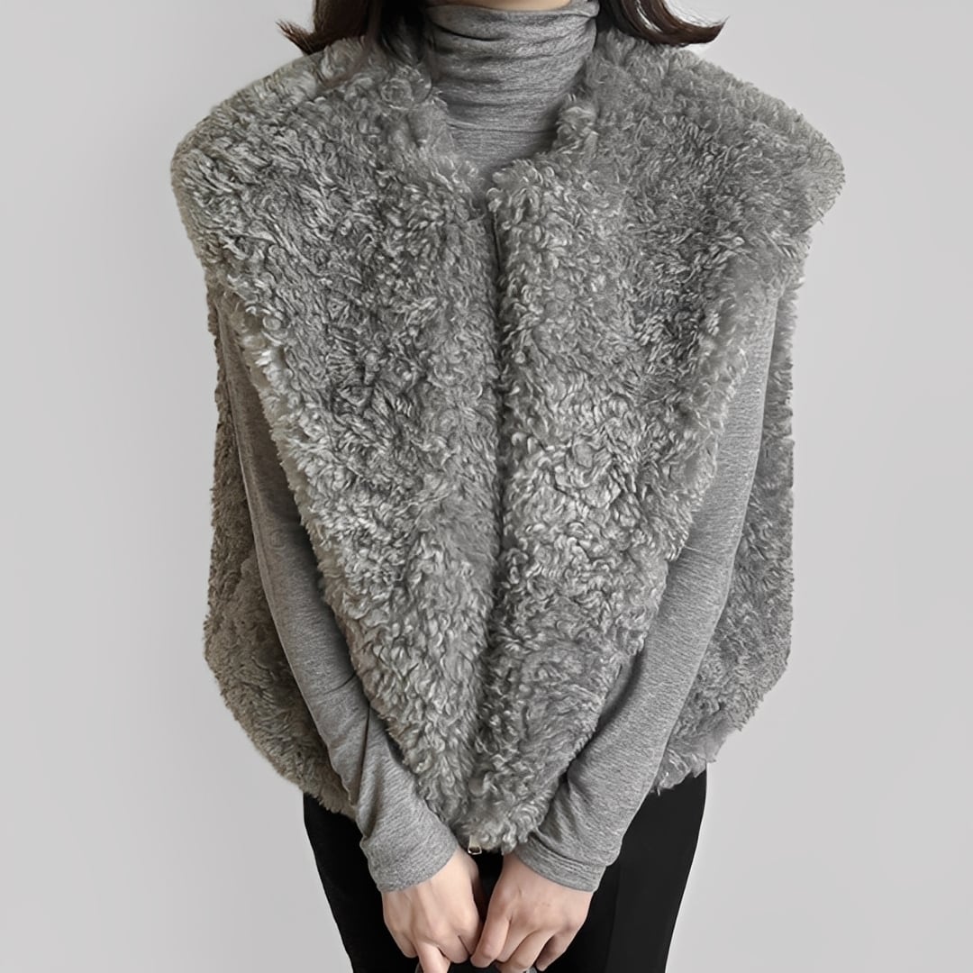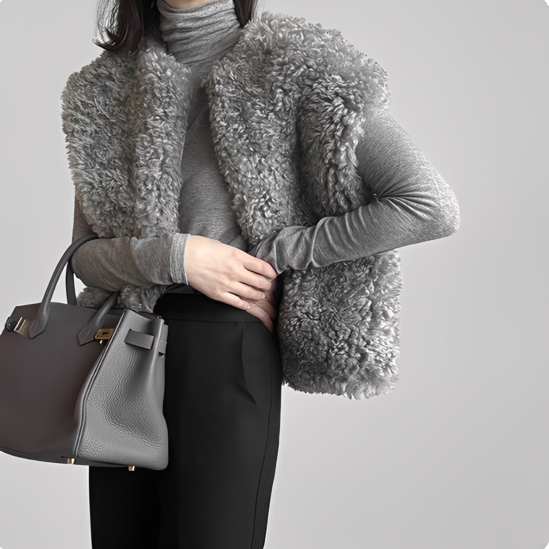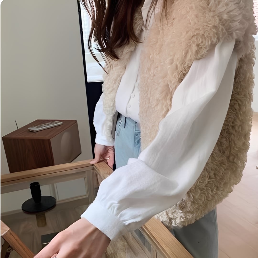 すっきりとしたノーカラーと程よいボリューム感が魅力のショートベスト。