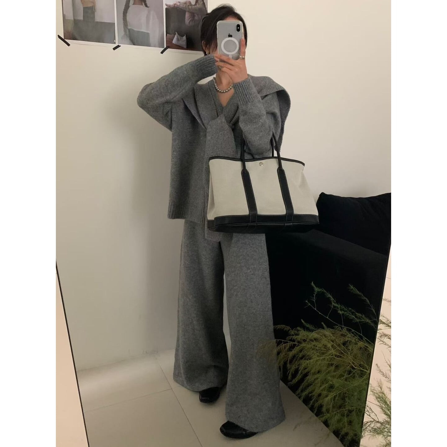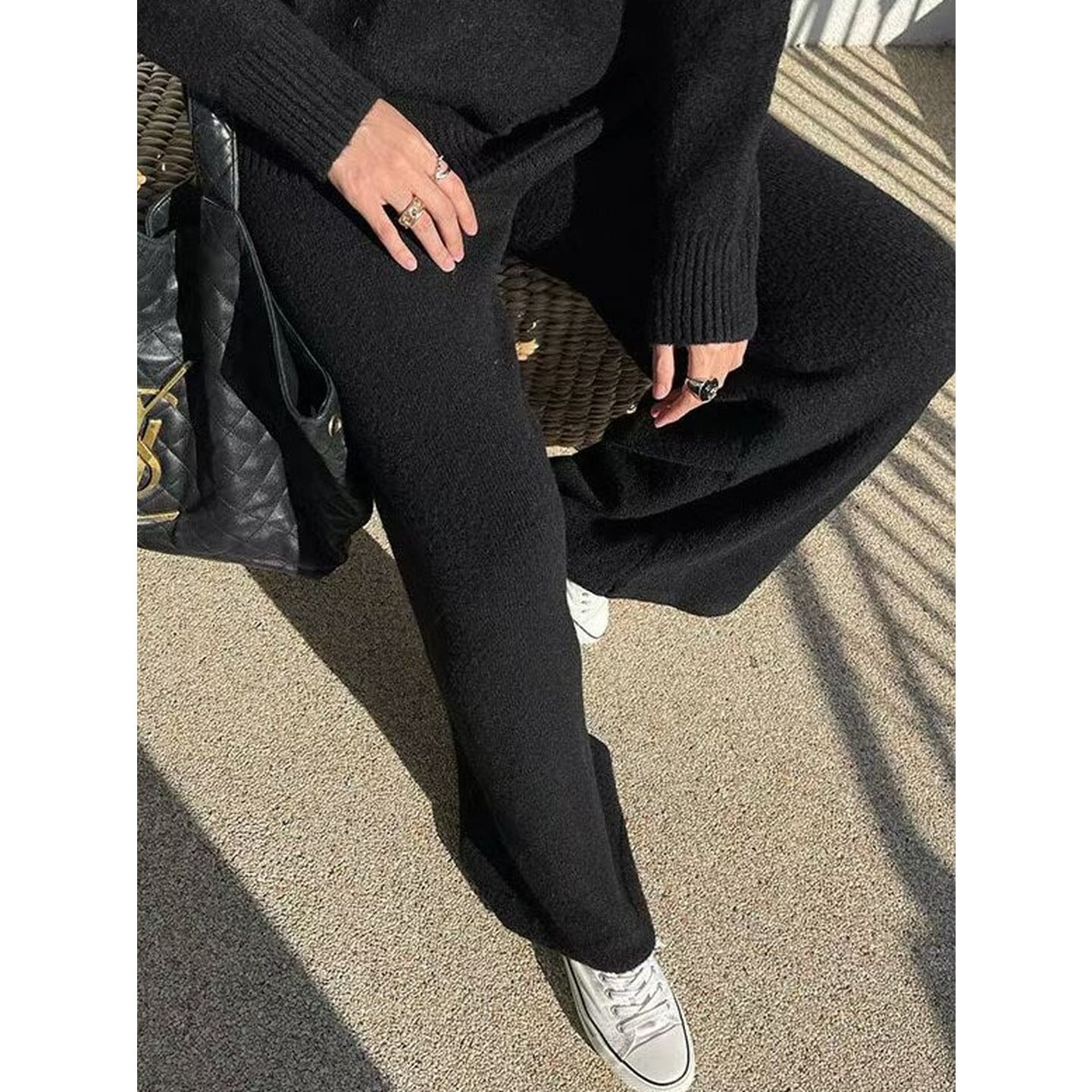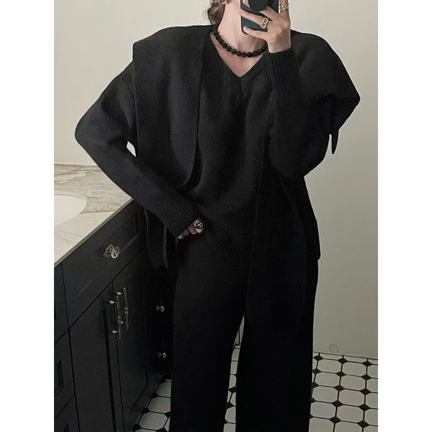 セーター・ワイドパンツ・ショールの3点が揃った、大人のためのセットアップ。