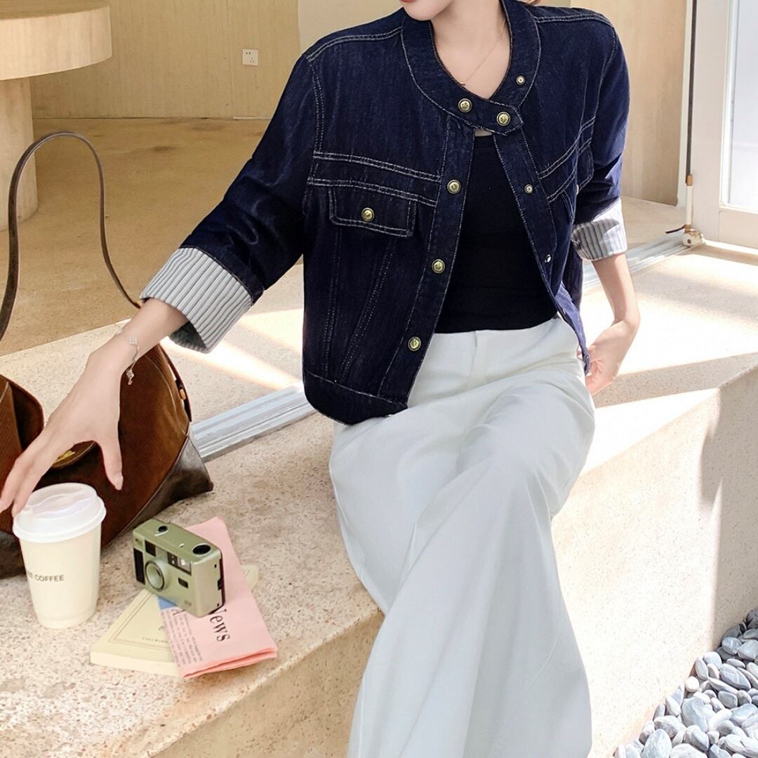 洗練されたノーカラー×ステッチデザイン×ストライプが大人の抜け感を演出。