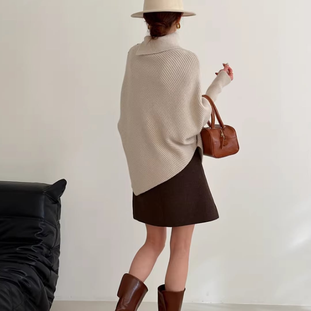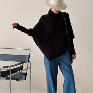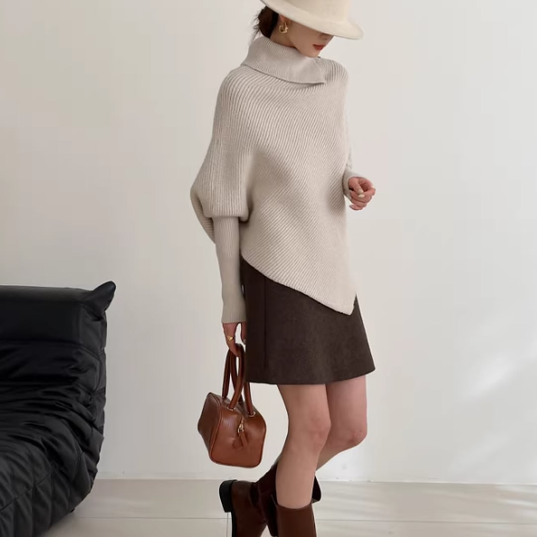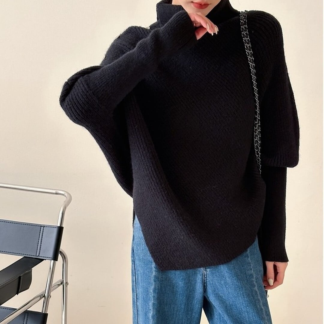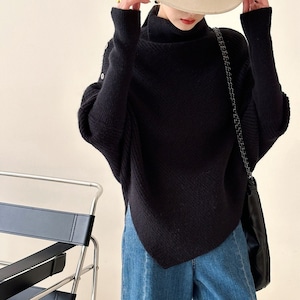 アシンメトリーなデザインが目を惹く、こなれ感たっぷりのニット。